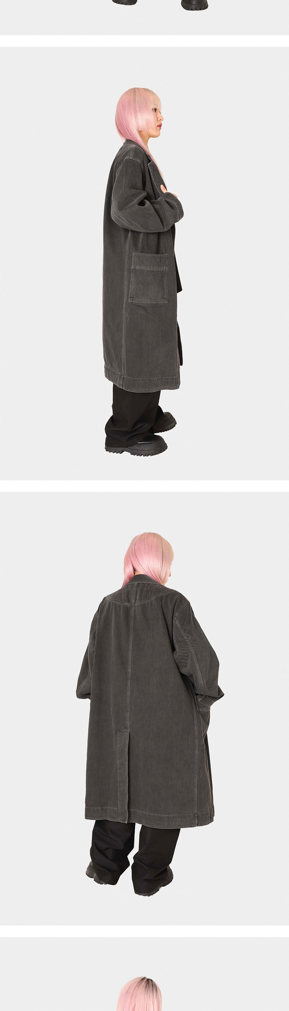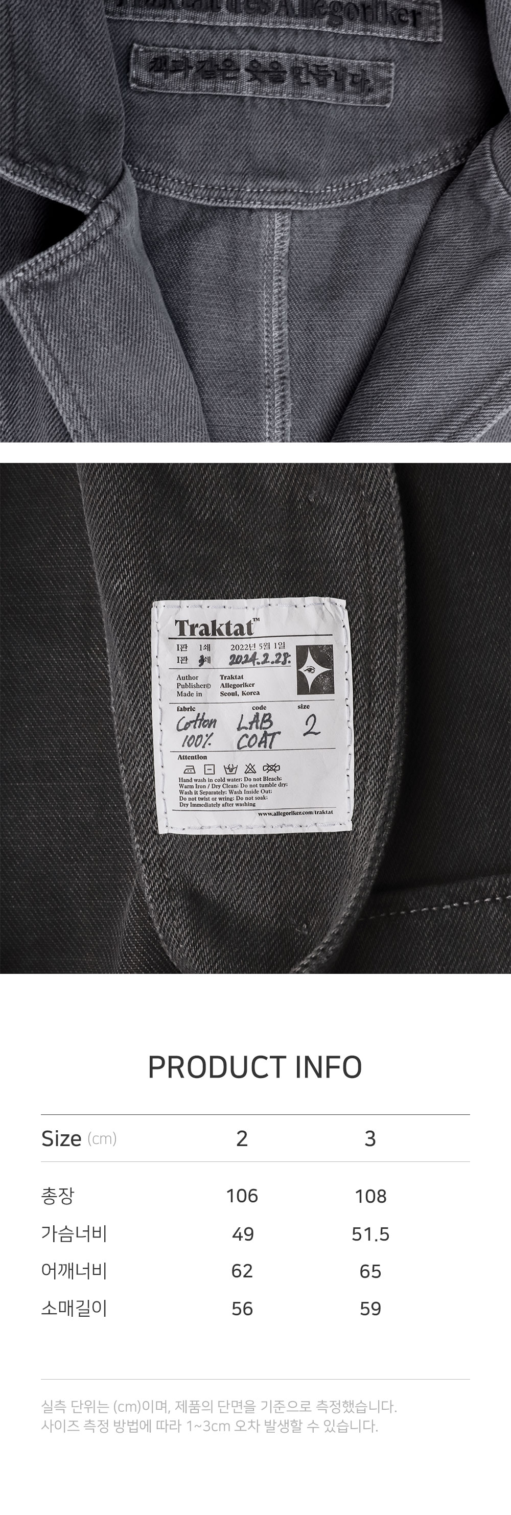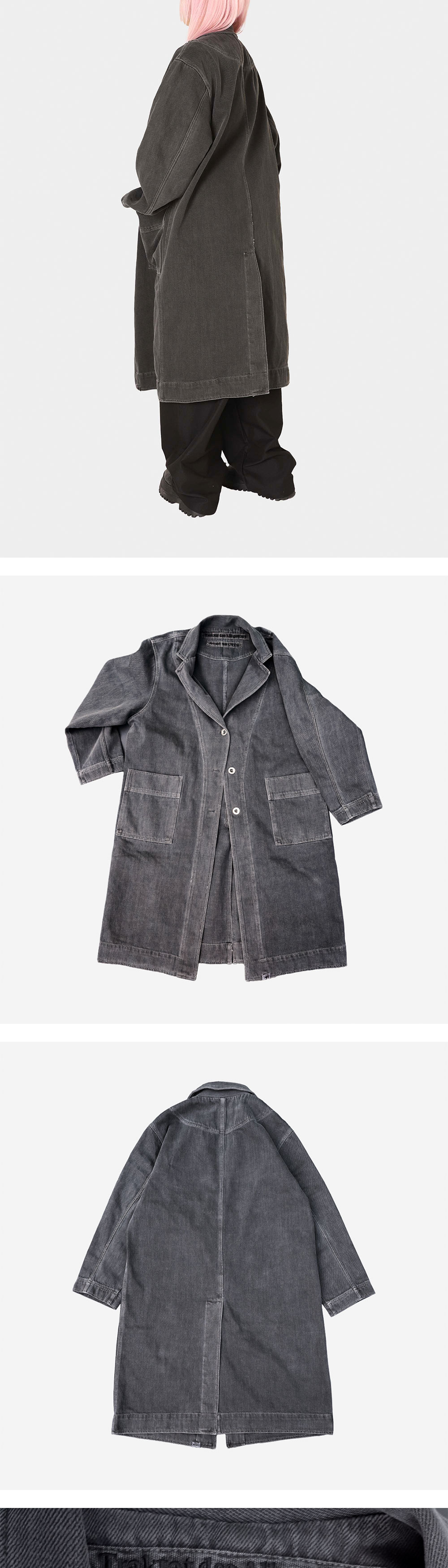 연구실에서 노동하는 이들의 의복, 실험실 코트에서 영감을 받아 제작한 코트입니다. 서부시대 먼지를 막기 위한 의복 ‘더스터 코트’의 디자인을 참고해 전면부 및 소매 안쪽에 봉제 디테일을 주었습니다. 은은한 광택이 도는 블리치드 데님 원단을 사용했고, 이후 홀 가먼트 다잉으로 깊이 있는 색감을 더했습니다. 전면부에는 데님과 잘 어울리는 밀리터리 라운드 메탈 단추를 사용하였으며, 내부에는 Ex-libris 케어라벨 및 린넨 메인라벨을 사용해 트락타트만의 감성을 표현했습니다. 오버사이즈 핏으로, 여유로운 실루엣으로 제작되었기에 터틀넥 니트나 경량 패딩 등을 입고서도 편안하게 활동할 수 있습니다. 쿵푸 팬츠 혹은 와이드한 데님 팬츠와 매치한다면 풍성하고 우아한 실루엣을 더욱 강조할 수 있습니다. - 오버사이즈 핏 - 빈티지 가먼트 다잉 - 더블 아웃 포켓 - 빈티지 밀리터리 라운드 메탈 버튼 - 트락타트 린넨 라벨 & Ex-Libris 타이벡 라벨