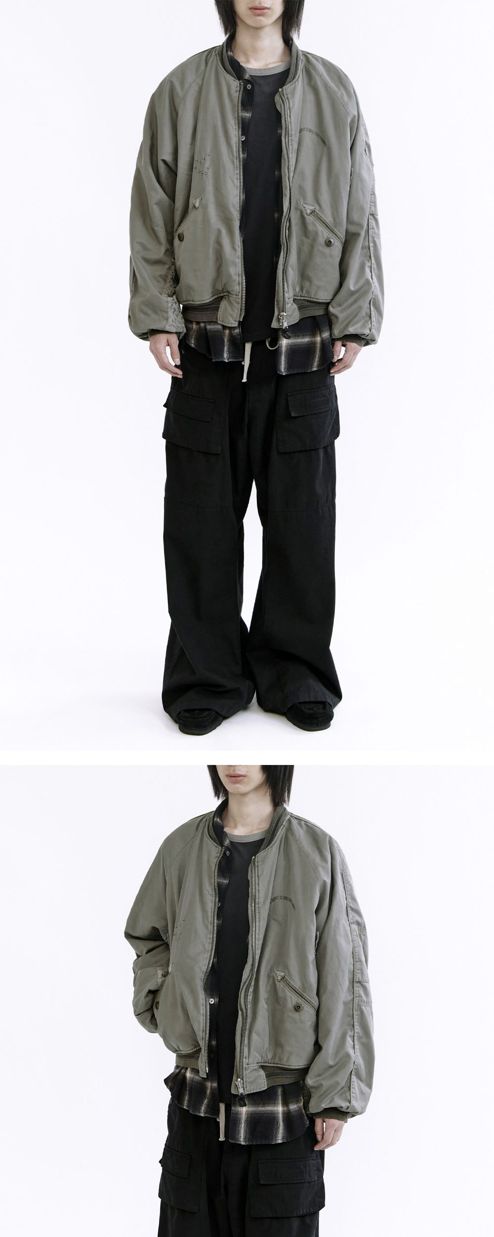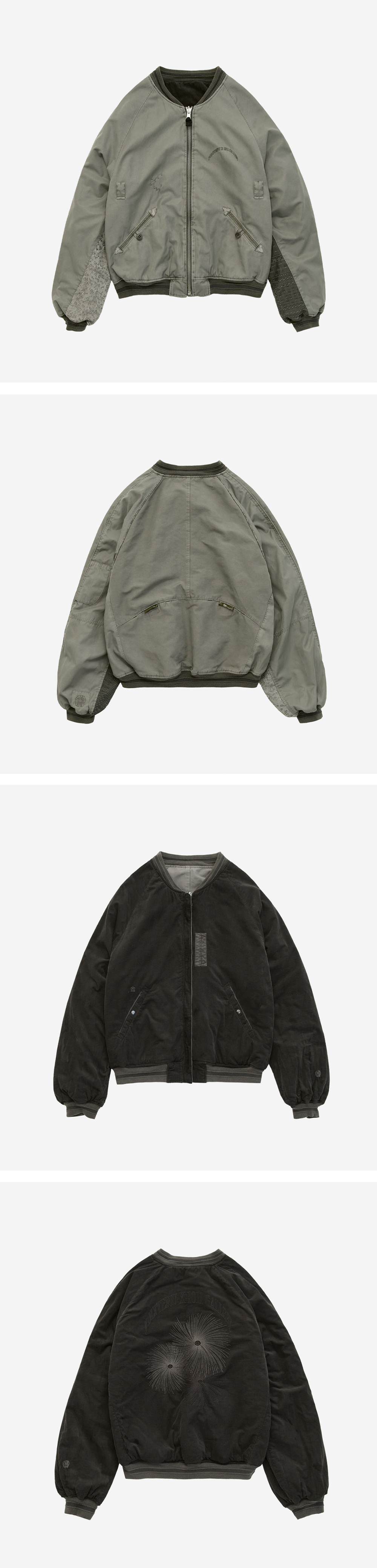 polyteru X 1011gallery reversible floral souvenir bomber - 폴리테루 X 1011갤러리의 기념 형태 자켓 - 공예적 감성의 디테일 집약한 높은 완성도의 제품 - 자연스러운 가먼트 다잉 적용 - MA-1 봄버 자켓 형식 차용 - 안쪽 소매 재패니즈 플로럴 패브릭 및 빈티지 패브릭 사용 - 각기 다른 형태의 플로럴 패브릭 적용된 전/후면 파이프드 라인 - 별주 배색 RIB - 소매 상단 서브포켓 - 하단 하나비 자수 패치 - 협업 로고 자수 & 사시코 핸드 스티치 - 고전적인 수베니어 포켓에 적용된 플로럴 패치 & 밀리터리 버튼 - 천연 스웨이드 풀러 & 리버시블 YKK 8호 지퍼 - 후면 밀리터리 포켓 디자인 & 플로럴 패브릭 풀러 *모델: 178cm / 마른 체형, 3사이즈 착용 *기존 폴리테루 제품군과 동일 사이즈 권장 *일반 체형 기준 - 170cm 초반 이하 2사이즈 권장 - 170cm 중반 3사이즈 권장 - 170cm 후반~180cm 초반 4사이즈 권장
