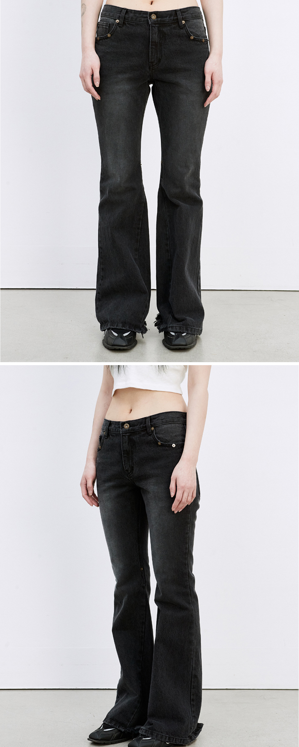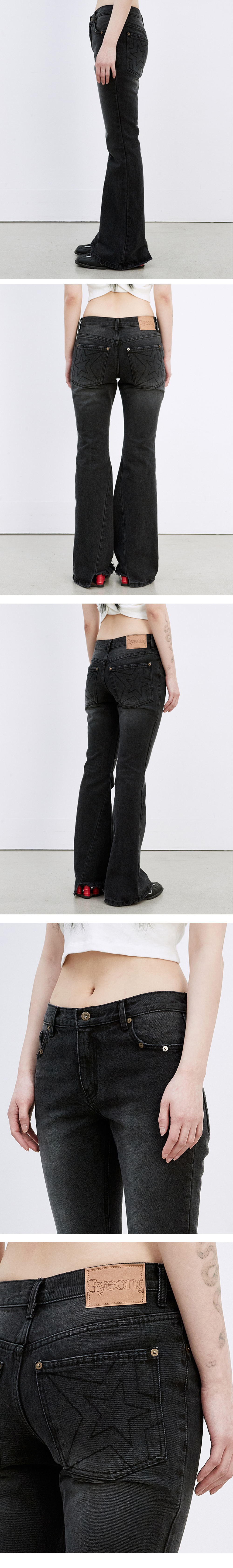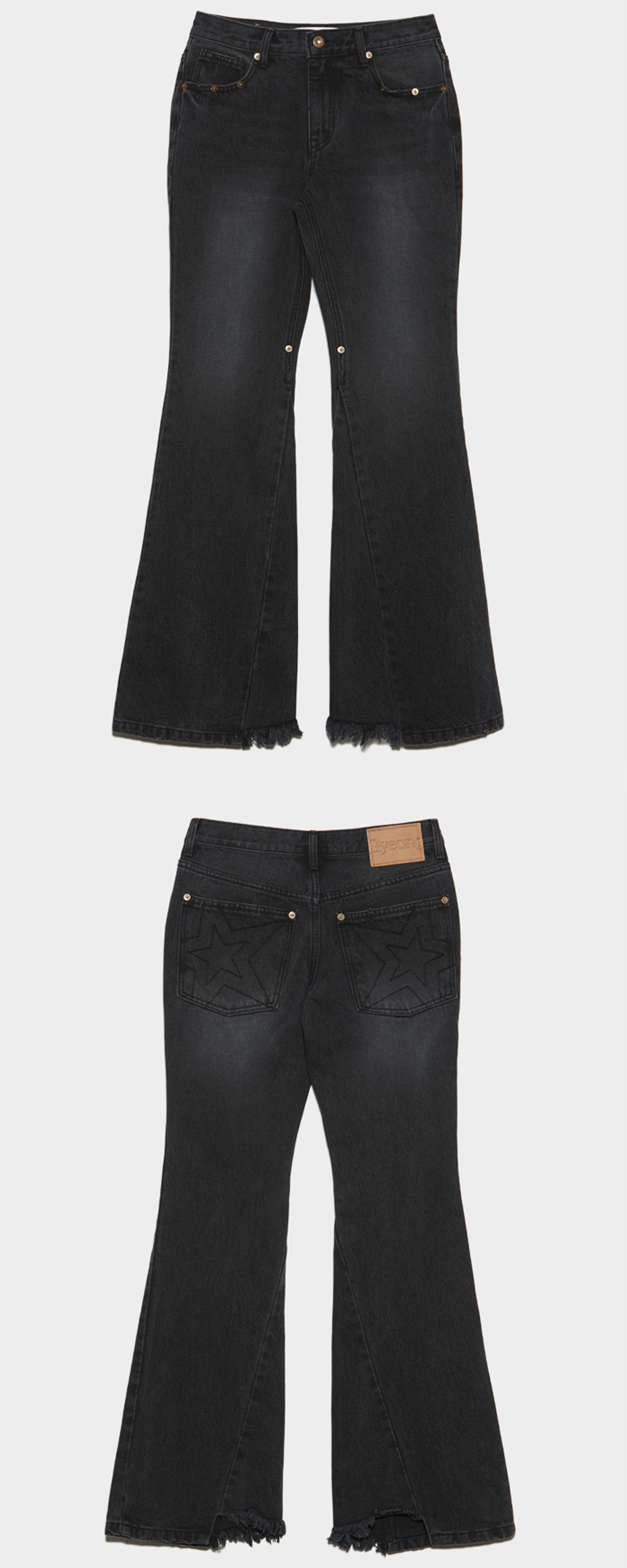 세미 부츠컷 데님 팬츠 - 전면 불규칙 데미지 디테일 - 전면 사이드 포켓, 인심 무릎에 YKK 리벳 포인트 디자인 - 전면 YKK Button & YKK Zipper 오픈 사양 - 인심 무릎에서 밑단까지 사선으로 떨어지는 절개 쉐입 - 아웃 포켓에 별 그래픽 자수 디자인 - 후면 허리단에 텍션지 라벨 - 힙부터 무릎까지 슬림하며 세미 플레어 실루엣