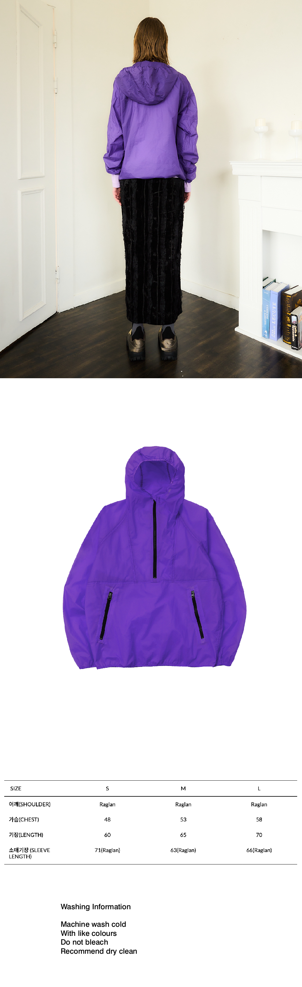 NYLON 100% 20D LIGHT WEIGHT PACKABLE YKK ZIPPER FRONT POCKET LOGO AT HOOD 경랑 아웃도어 의류용 소재 후드 패커블 디테일 YKK 지퍼 앞면 주머니 후드 로고 자수 Made in South Korea Washing Information Machine wash cold With like colours Do not bleach Recommend dry clean