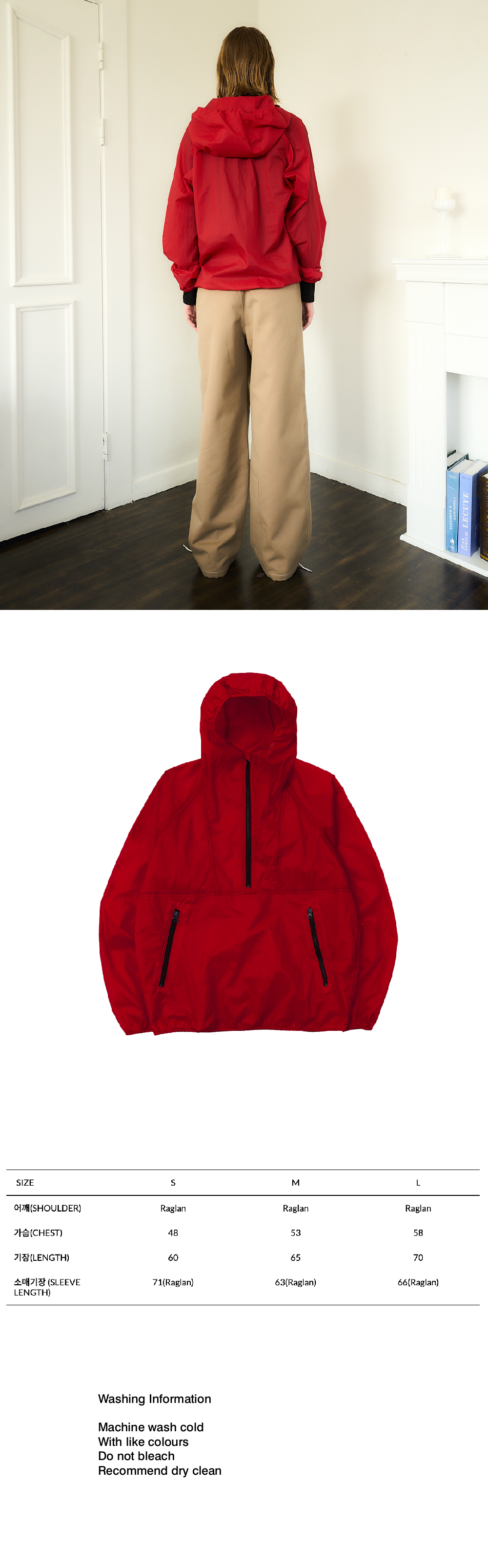 NYLON 100% 20D LIGHT WEIGHT PACKABLE YKK ZIPPER FRONT POCKET LOGO AT HOOD 경랑 아웃도어 의류용 소재 후드 패커블 디테일 YKK 지퍼 앞면 주머니 후드 로고 자수 Made in South Korea Washing Information Machine wash cold With like colours Do not bleach Recommend dry clean