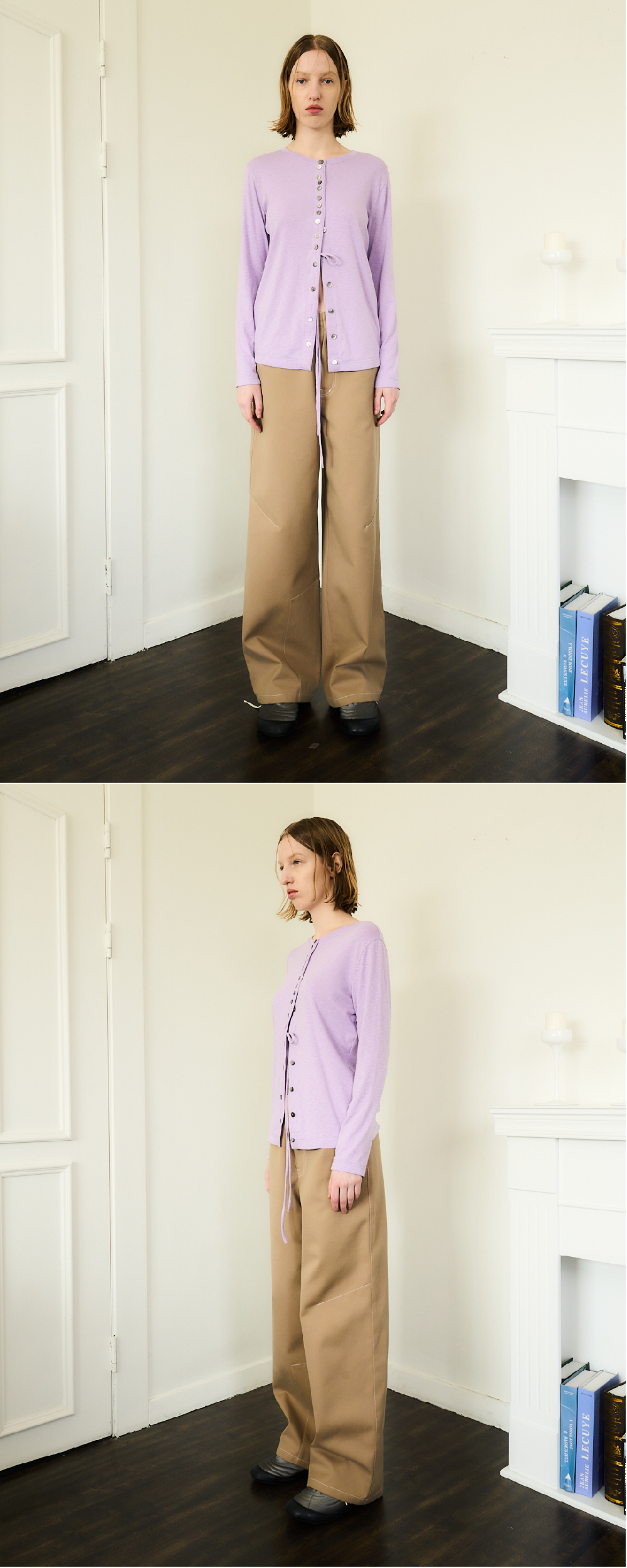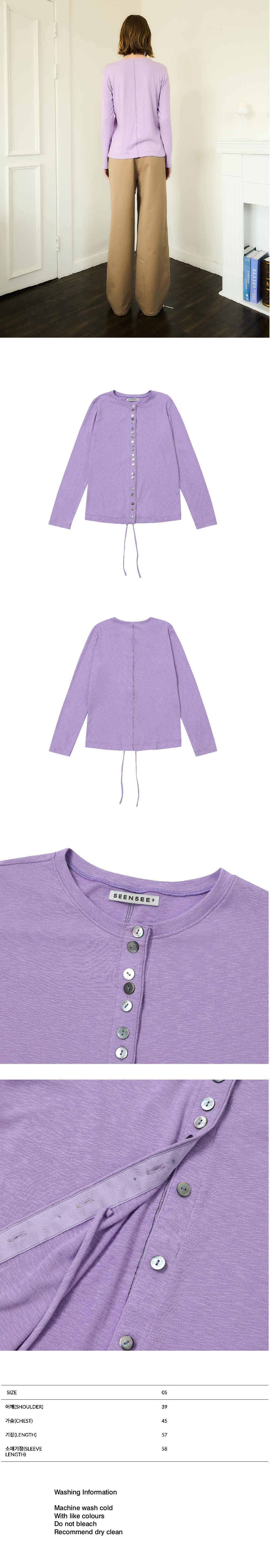 Soft modal fabric Many button details Natural mother of pearl buttons Two strap at front Slim fit 부드러운 모달이 섞인 소재 단추 디테일 자개단추 스트랩 디테일 (오픈 하여 묶는 용도) 슬림 핏 Made in South Korea Washing Information Machine wash cold With like colours Do not bleach Recommend dry clean