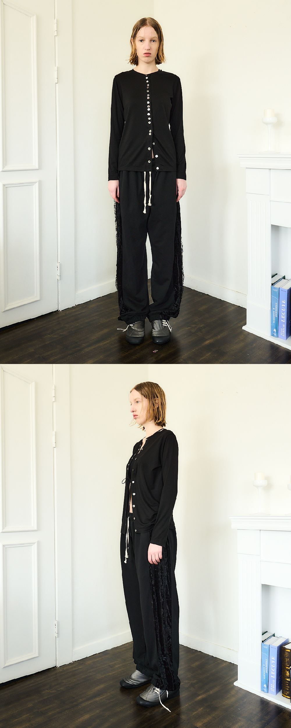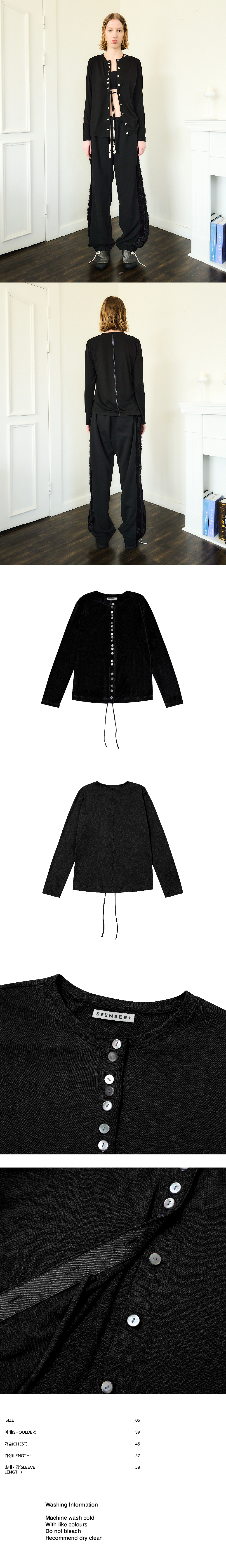 Soft modal fabric Many button details Natural mother of pearl buttons Two strap at front Slim fit 부드러운 모달이 섞인 소재 단추 디테일 자개단추 스트랩 디테일 (오픈 하여 묶는 용도) 슬림핏 Made in South Korea Washing Information Machine wash cold With like colours Do not bleach Recommend dry clean
