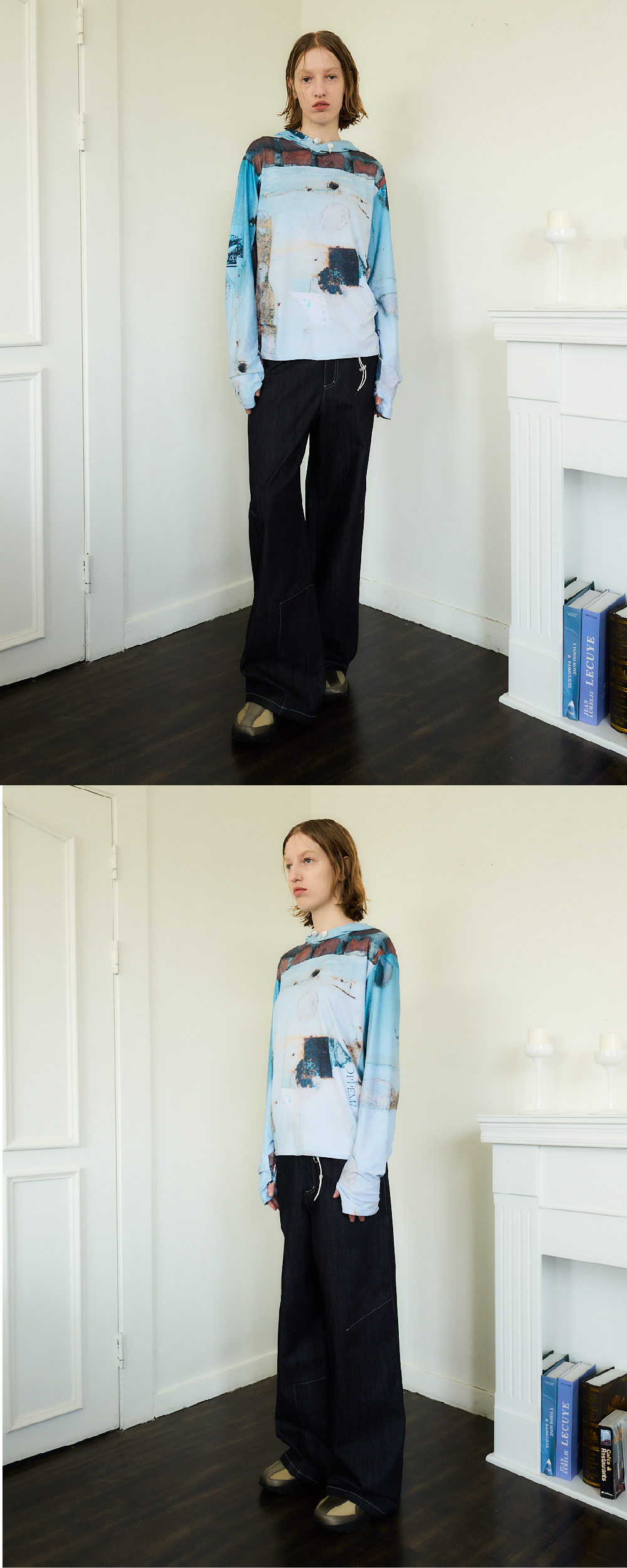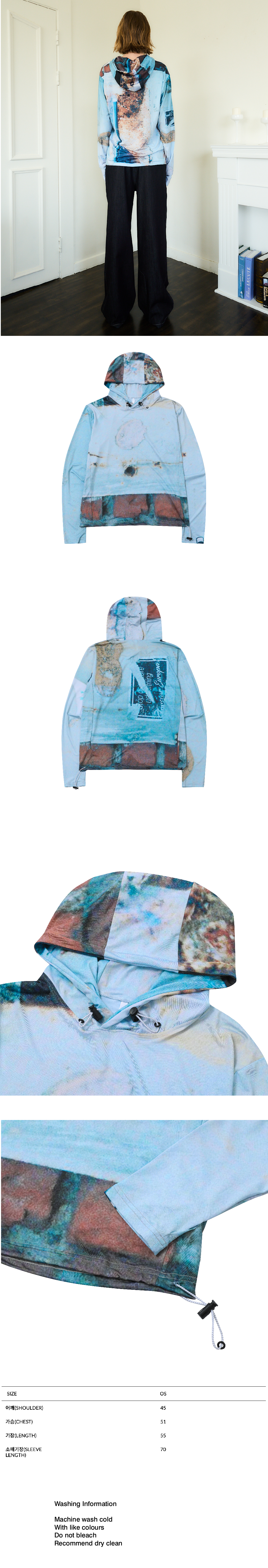* 제품 사진의 프린팅으로 제작되었습니다. Cooling Fabric Light weight Whole photograph printing Adjustabe string Finger hole detail at sleeve 가벼운 쿨링 소재 전체 포토 프린팅 후드 및 밑단에 조절 가능한 스트링 소매에 손가락 홀 디테일 Made in South Korea Washing Information Machine wash cold With like colours Do not bleach Recommend dry clean