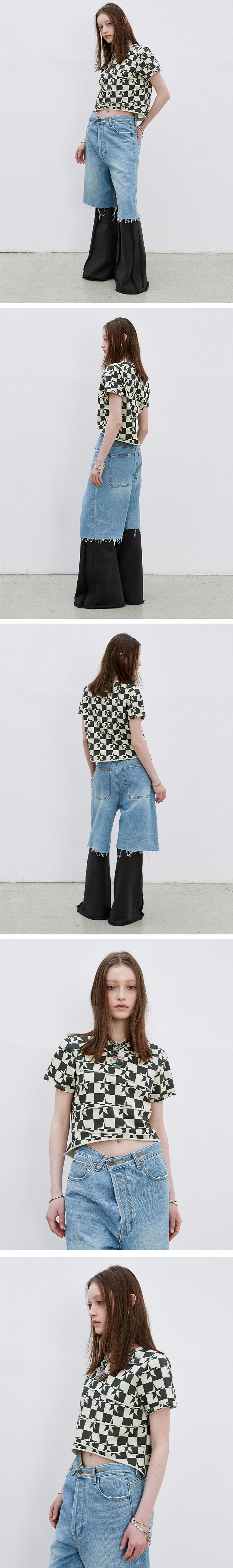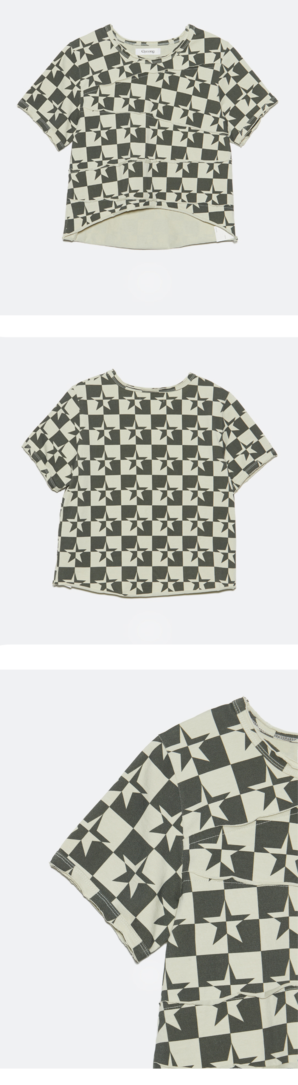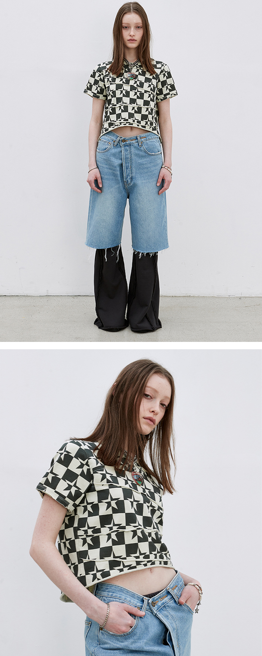 크롭된 기장감의 반팔 티셔츠 - 깅엄 체크에 별을 믹스하여 개발한 패턴 그래픽 원단을 사용 - 네크라인과 소매단 커팅 마감 - 전면부에 들어가는 불규칙한 절개 - Gyeong 로고를 펄 가루가 함량된 염료로 작업