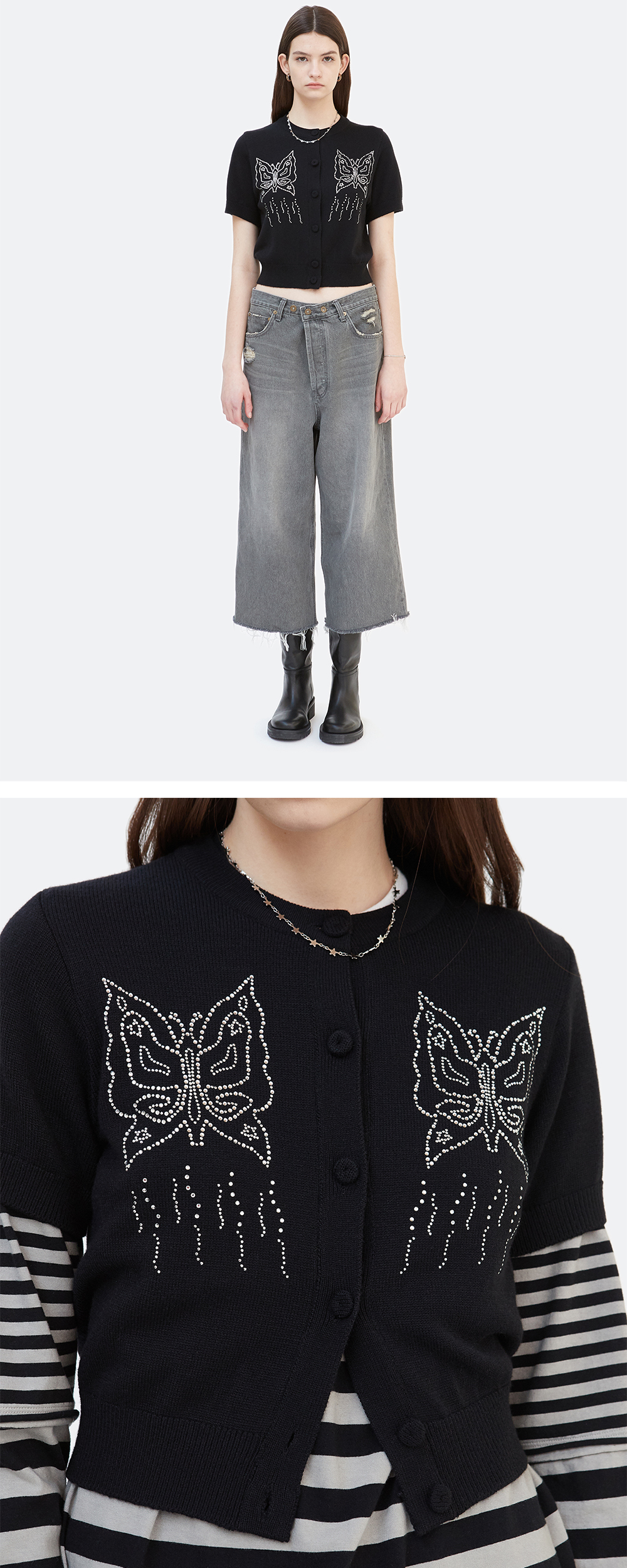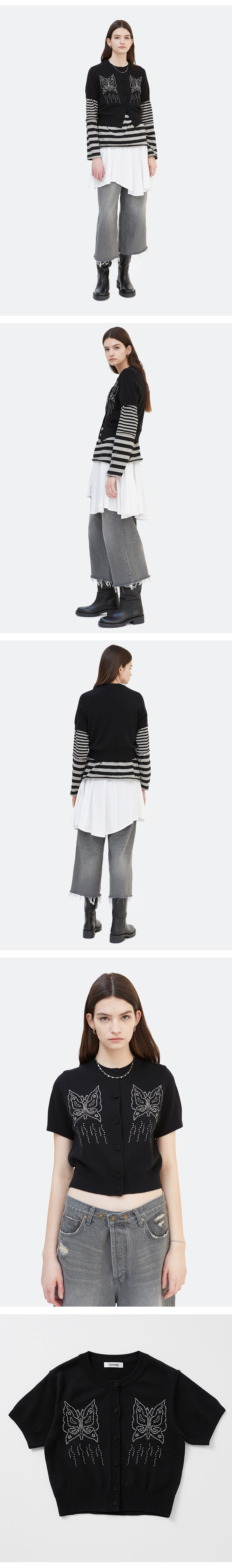 간절기에 입기 적합한 두께로 제작한 반팔 소매의 니트 가디건입니다. 길지 않은 기장감의 스탠다드한 핏이며 가디건 타입으로 다양한 스타일링 연출과 레이어드에 용이한 아이템입니다. 여밈 부분에 니트 소재로 감싼 버튼을 사용하였으며 전면부에 나비 그래픽을 핫픽스로 작업하여 유니크함을 더하였습니다.