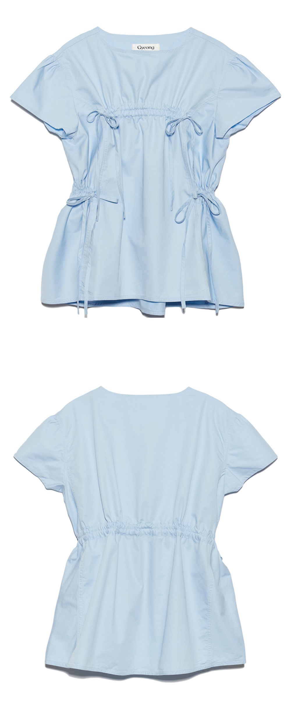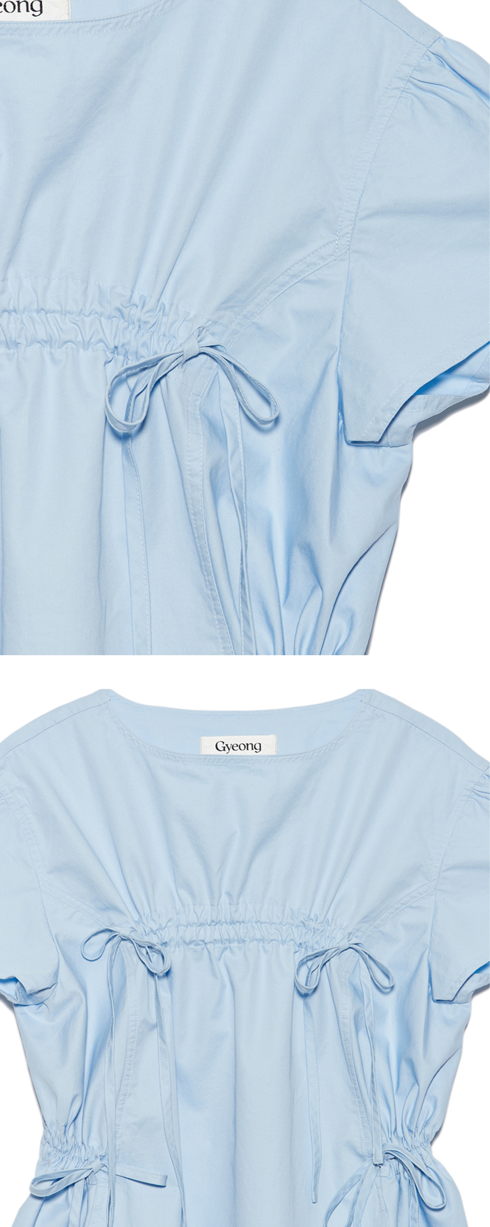 짧은 반팔 소매의 미니 드레스 - 롱 슬리브 아이템과 레이어드하기에 용이 - 전면 바스트 라인에 스트랩을 이용한 셔링 디테일 - 웨이스트 라인에 사이드에서 후면으로 이어지는 스트랩 터널 - 전면 인 포켓 2개 - 여유있는 세미 오버 핏 실루엣