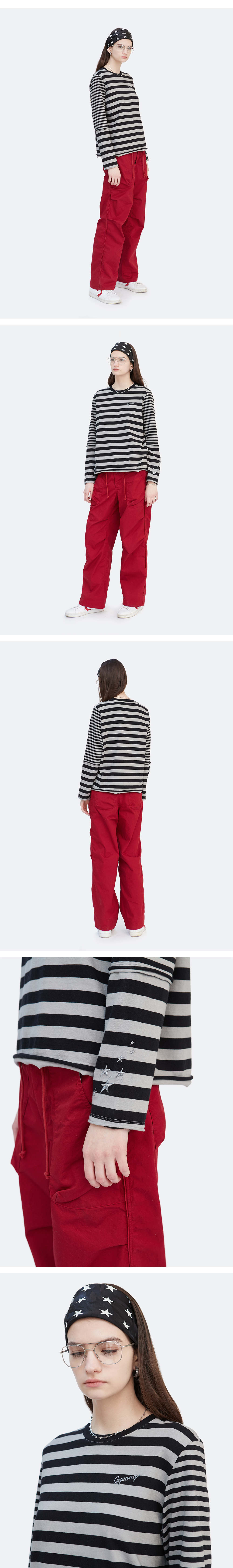 피그먼트 다잉 처리된 스트라이프 티셔츠입니다. 길지 않은 기장감의 스탠다드한 핏이며 소매에 다른 폭의 스트라이프 원단을 믹스하여 유니크함을 더하였습니다. 소매단과 밑단 마감을 커팅하여 러프함을 더했으며 피그먼트 다잉으로 인해 빈티지한 무드를 연출하였습니다. 전면부와 소매에 그래픽을 메탈 자수로하여 포인트를 주었습니다.