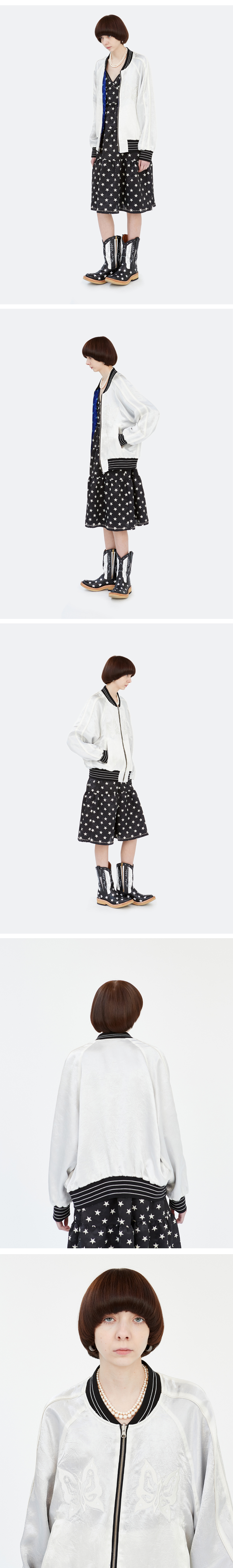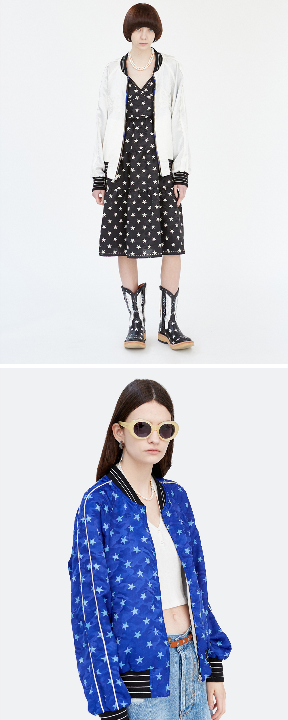 사틴 원단과 아세테이트 원단으로 제작된 리버시블 봄버 자켓 입니다. 얇은 두께감으로 인해 간절기에 입기에 적합합니다. 겉면 사틴 원단은 카모플라주 패턴 자카드와 별 패턴의 프린팅이 특징이며 안쪽면 아세테이트 원단은 은은한 광과 주름이 특징입니다. 나비 그래픽은 원단과 톤 온 톤 컬러로 하여 포인트를 주었습니다. 전면부에 Ykk 리버시블용 지퍼가 사용되었으며 포켓에도 Ykk 지퍼가 사용되어 수납에 용이합니다.