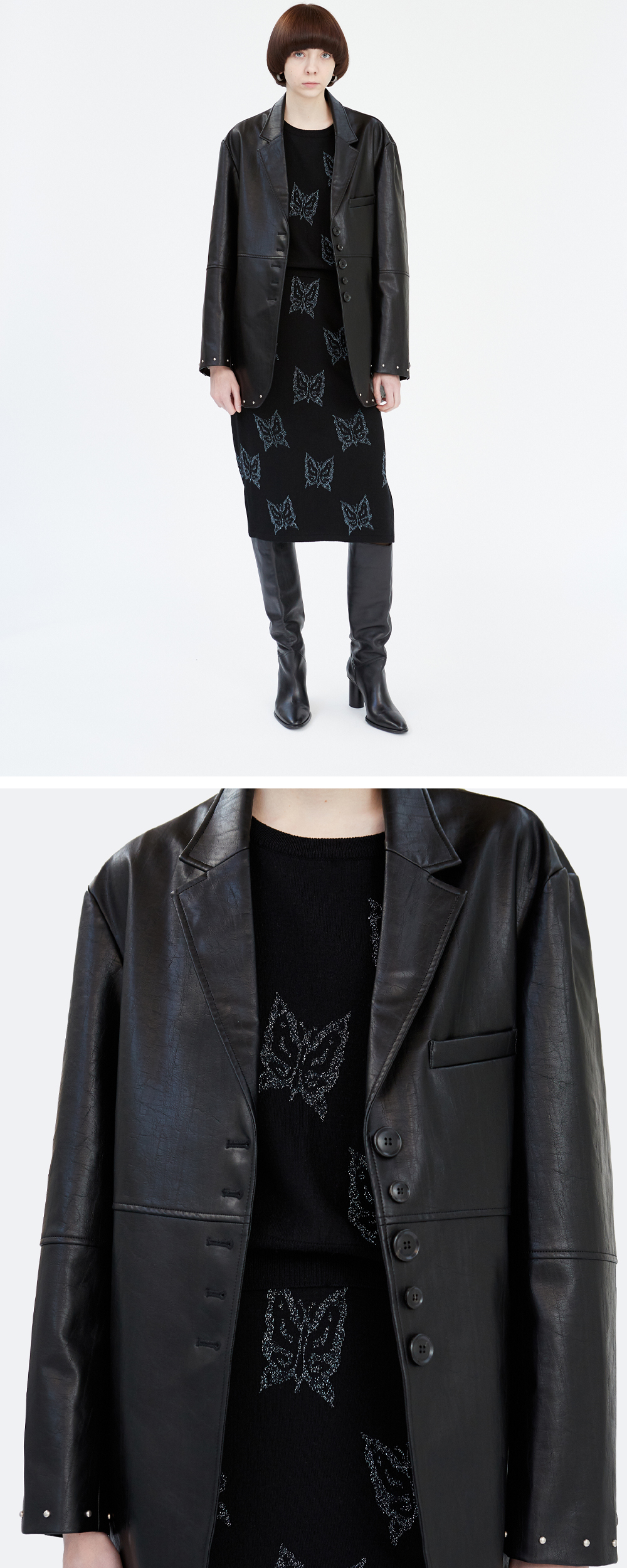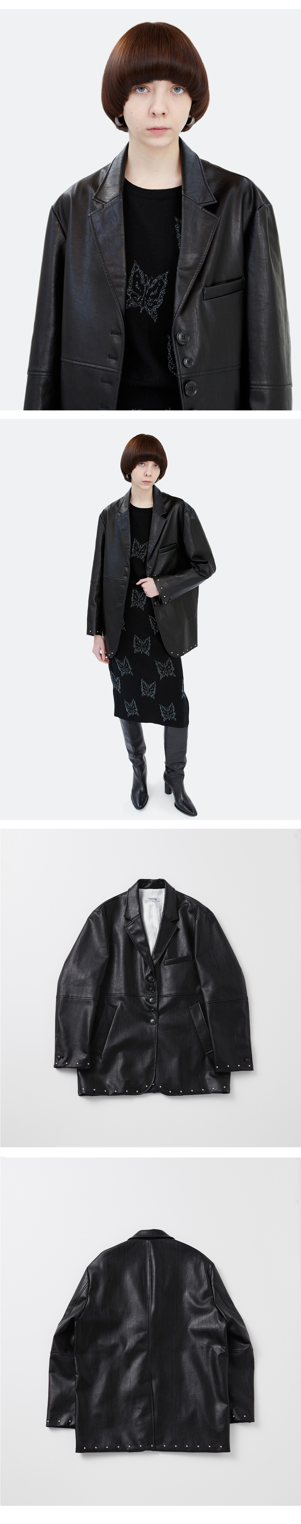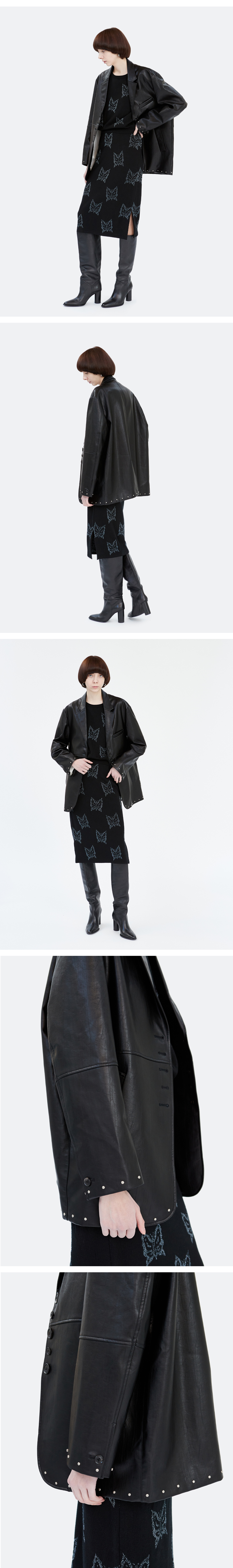 비건 레더 원단으로 제작된 블레이저 타입의 오버사이즈 자켓입니다. 자연스러운 주름으로 인해 빈티지한 무드를 더하였습니다. 전면부에 5EA의 소뿔 단추가 들어가 스타일링 연출에 용이하며 소매단과 밑단에 스터드를 사용하여 포인트를 주었습니다. 안감은 아세테이트 원단을 사용하여 은은한 광과 주름으로 고급스러움을 더 했습니다.