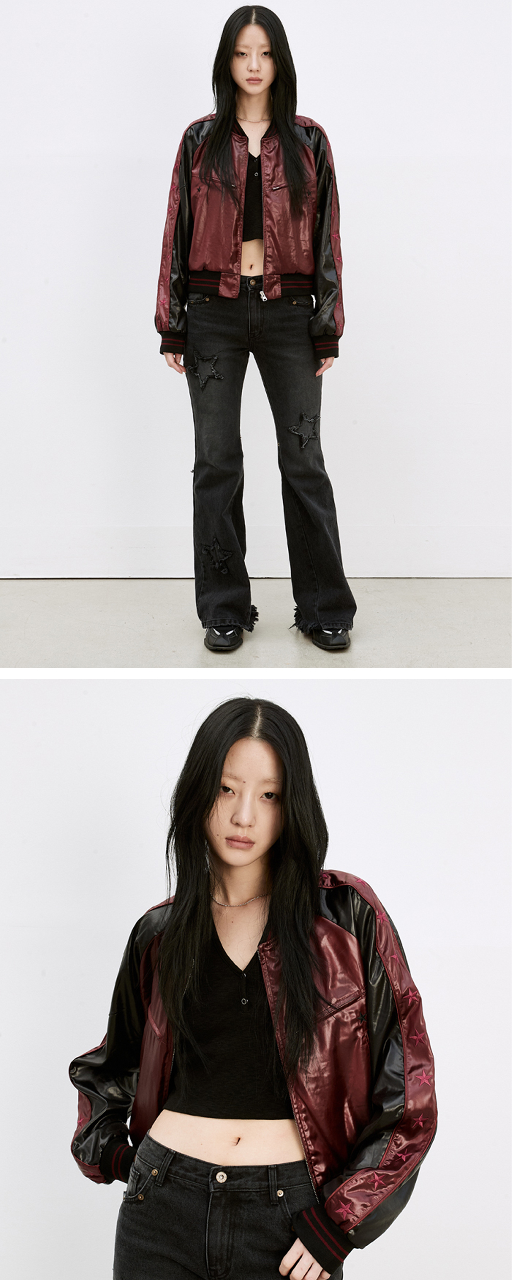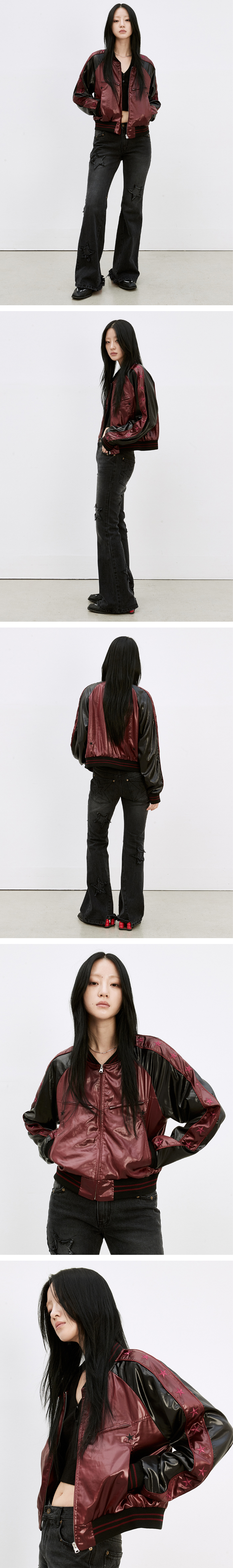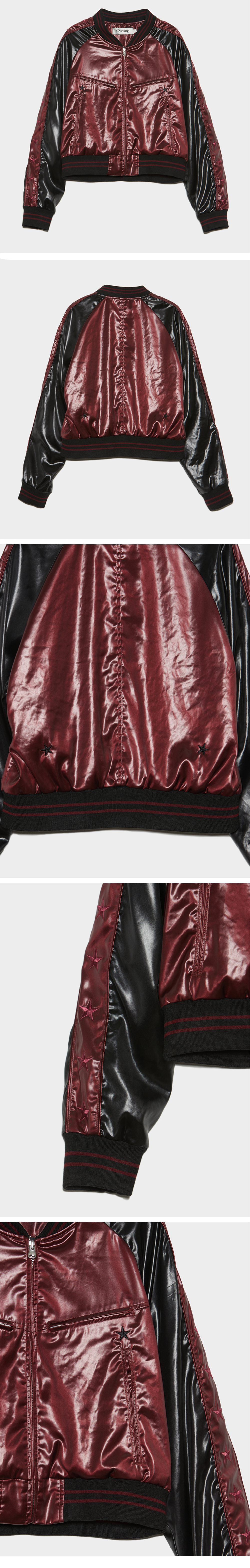 고급스러운 광택 소재의 레글런 슬리브 봄버 자켓 - 소매에 두줄 파이핑과 별 그래픽 자수 디자인 - 여밈 YKK 2Way Zipper 사양 - 바스트 라인 YKK 1Way Zipper 포켓 2개 - 사이드 포켓 2개 - 적당히 짧은 기장감의 레귤러 핏 실루엣