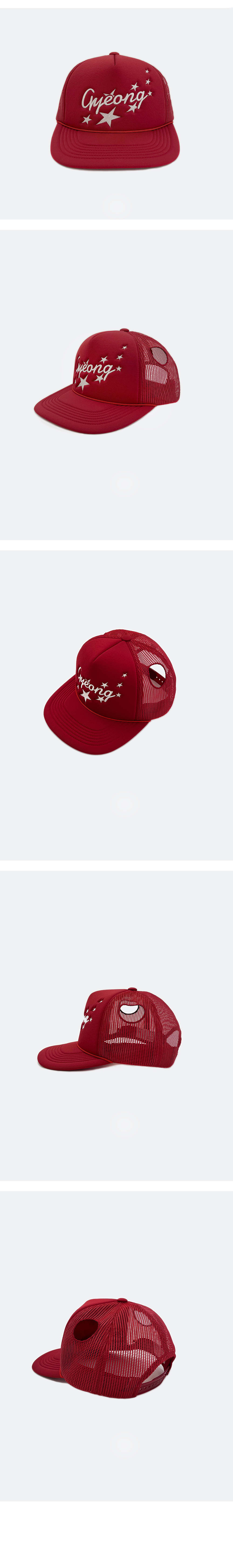 져지 소재와 메쉬 소재를 사용하여 제작된 트러커 캡입니다. 전면부에 Gyeong 시즌 그래픽을 입체적인 자수로 처리하였으며 측면 메쉬 소재에 타공 디테일을 넣어 유니크함을 주었습니다.