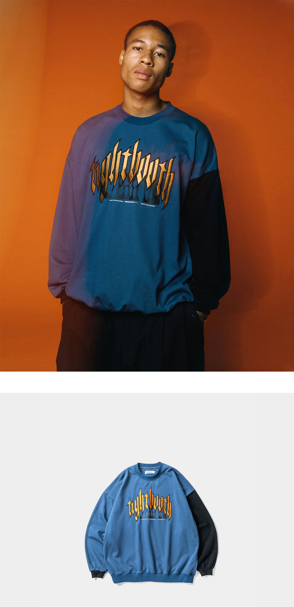 - 한쪽 소매에 컬러 블록 포인트를 준 크루넥 스웨트셔츠 - 9.8oz의 보아 코튼 사용 - 전면 로고 그래픽 실크 스크린 프린팅 - 여유로운 와이드 실루엣