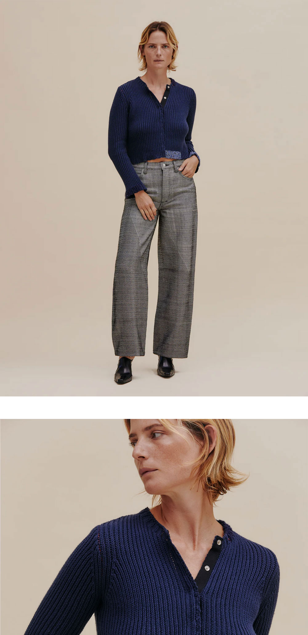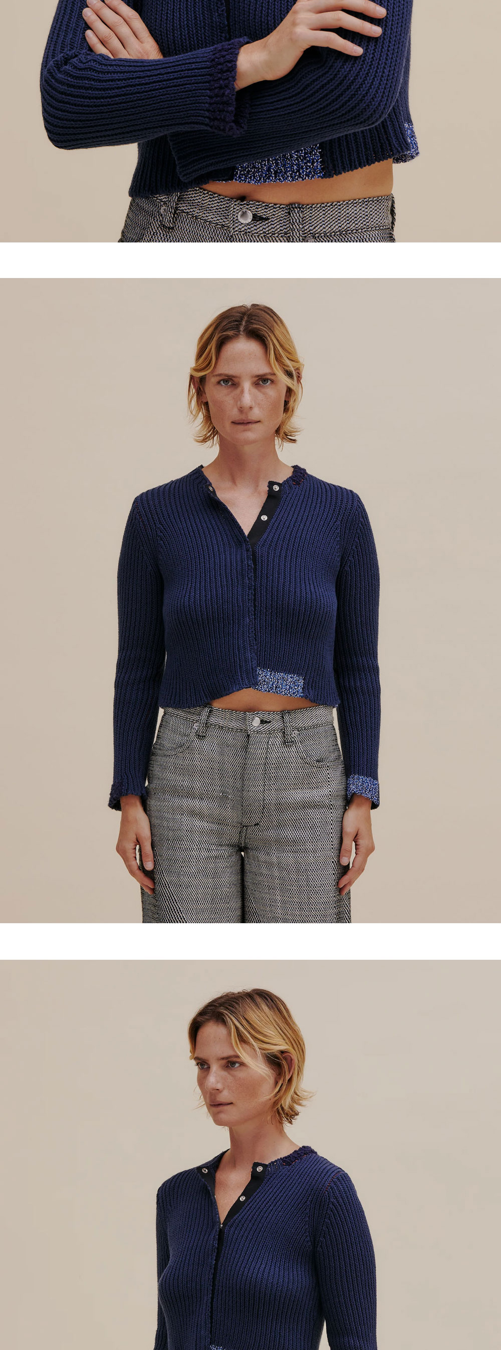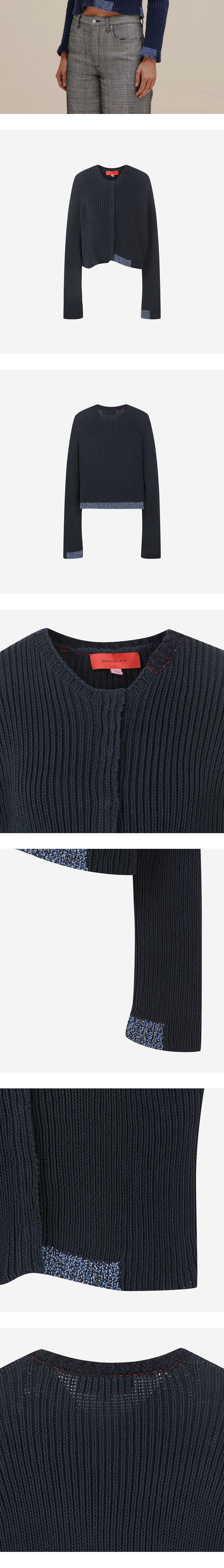 에크하우스 라타의 면,린넨 혼방 가디건입니다. 밑단, 목주름 및 소매 마감 부분 주변의 대조적인 색상 패치가 특징입니다. - 전면의 스냅 여밈 디테일 - 컬러 포인트 패치 * 모델 착용 사이즈: S