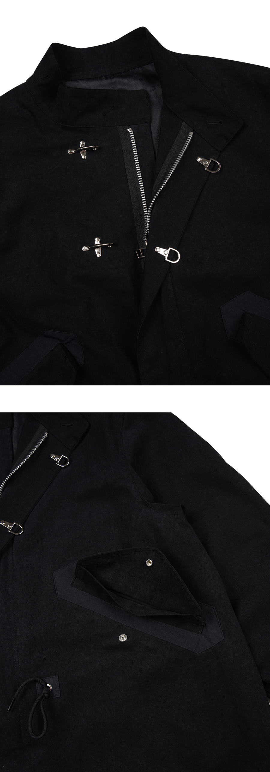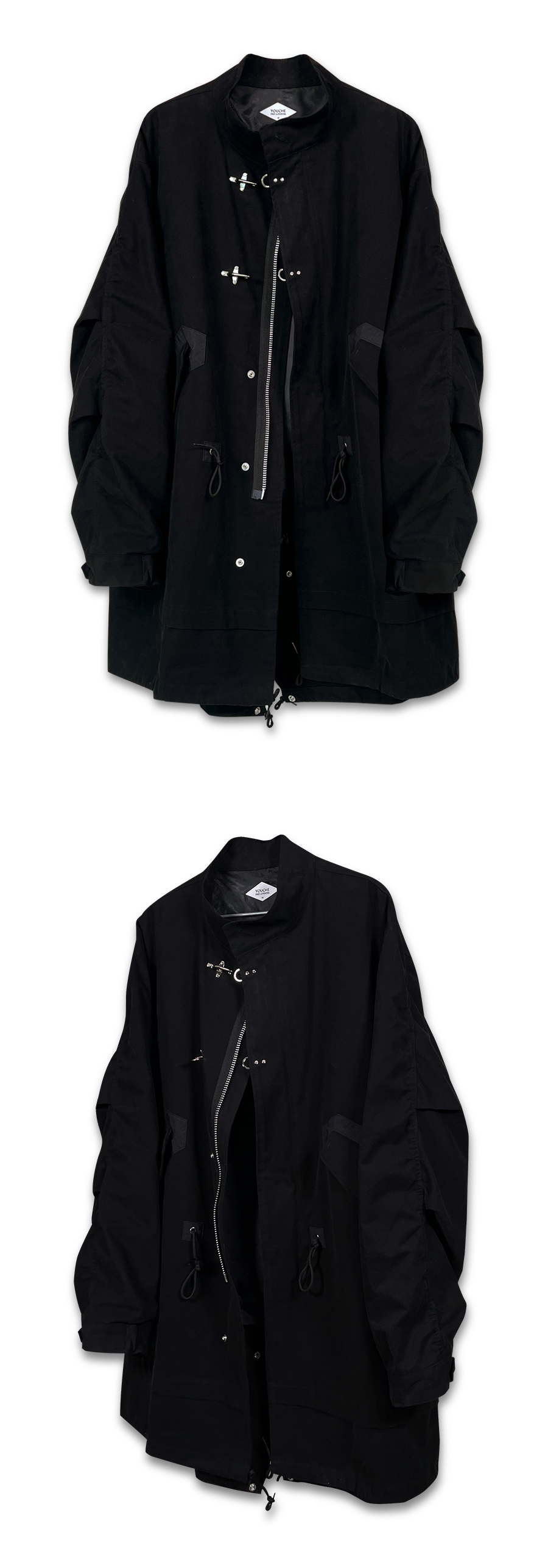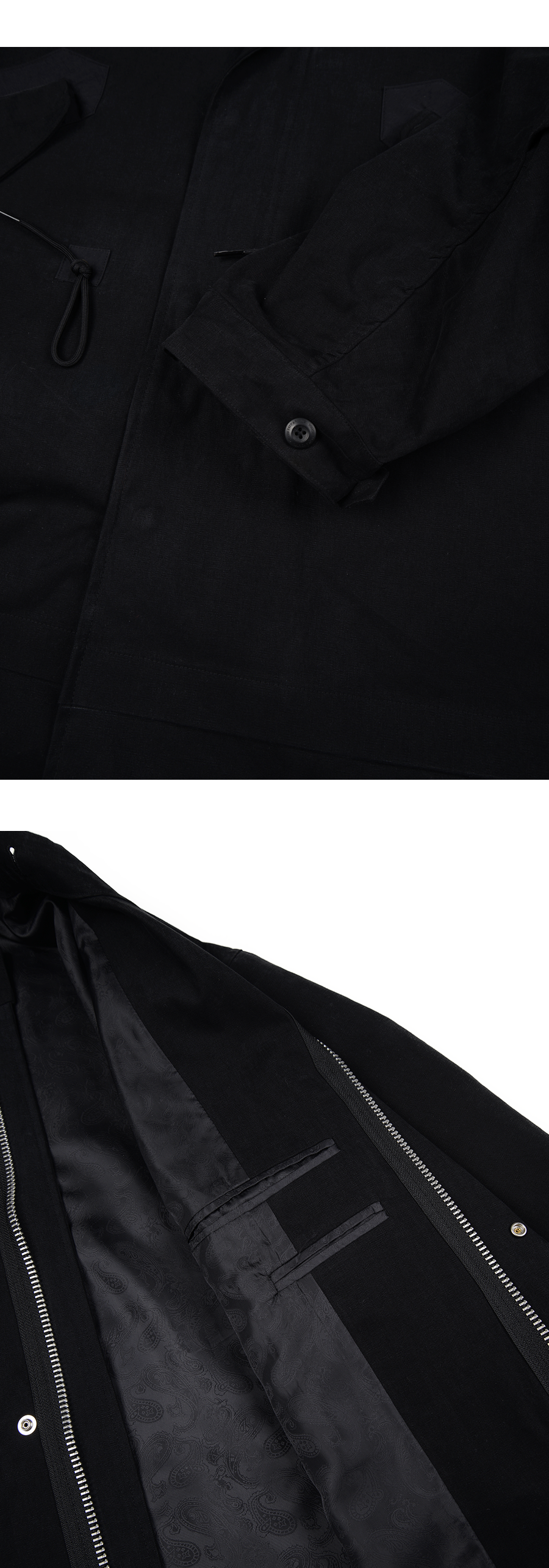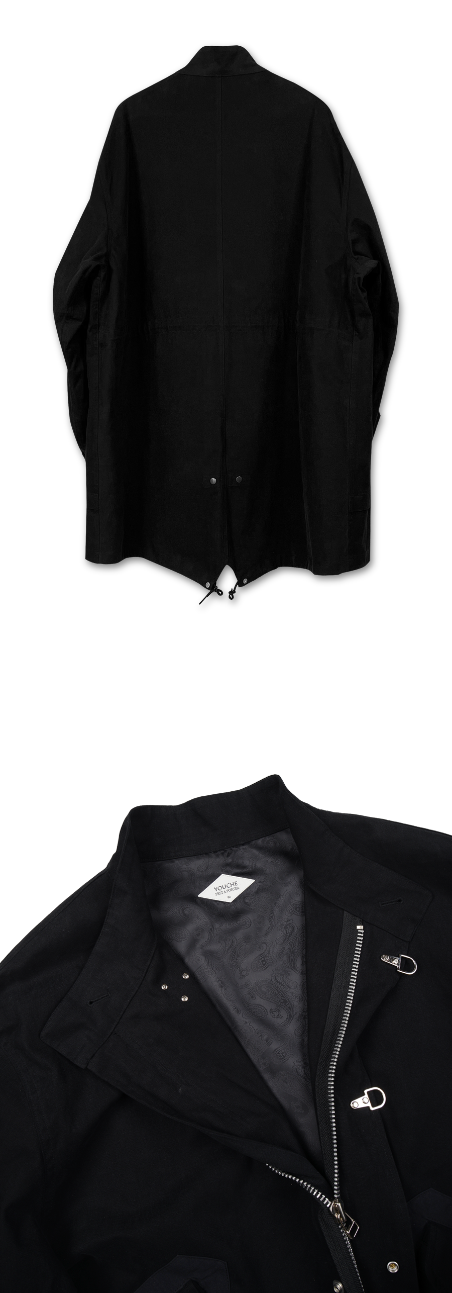 Description 오리지널 M-65 피시테일 파카를 현대적으로 재해석한 제품입니다. 고중량의 캔버스 원단을 사용하여 착장시 무게감있는 실루엣을 구현합니다. 입을수록 자연스러운 주름으로 페이딩이 되는 제품입니다. Material Outshell 1 : 100% Cotton Canvas Outshell 2 : 100% Nylon Ribstop Lining : 100% Polyester Pocket lining : 35% Cotton 65% Polyester Colour : Matt black - P/W Cotton 100% Canvas fabric ( 370g/sqm ) - Paisley jacquard poly lining - YKK社 10mm Nickel front zipper - YKK社 13mm Permex black coated ring snap - Sleeve shirring detail - Three inner pockets - 고리 여밈 방식 - 오버사이즈드 실루엣의 피시테일 파카