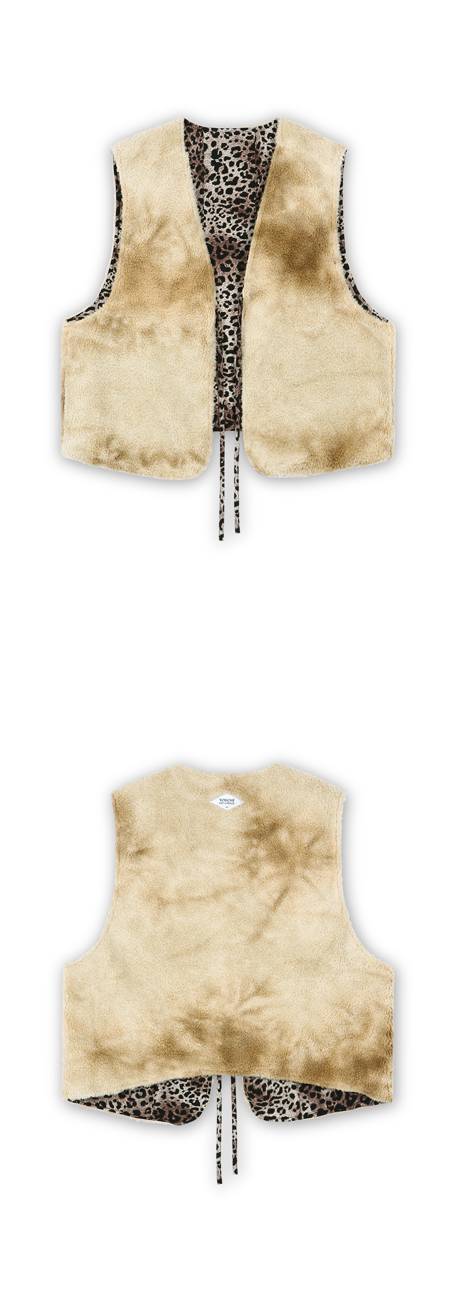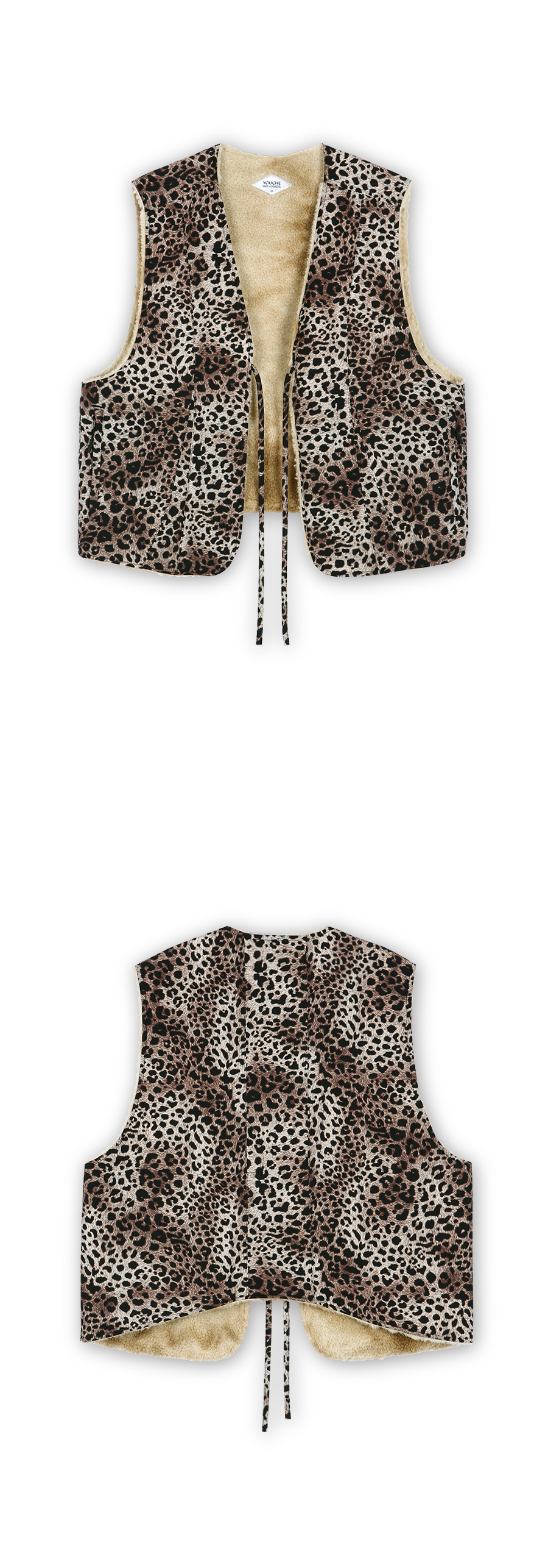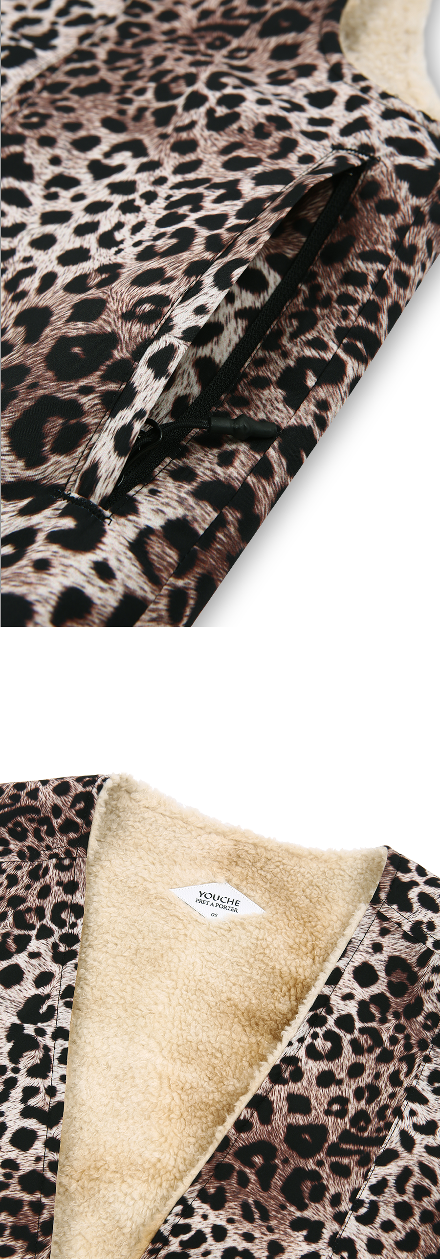 Description 라이너 제품으로 활용 가능한 쉐르파 베스트이며, 숏한 기장감을 사용하여 착장시 경쾌한 느낌이 드는 제품입니다. Material Outshell 1 : 100% Polyester Outshell 2 : 100% Polyester Colour : Leopard - 75g/sqm DTP ( Digital textile print ) Polyester - YKK社 closed pocket zipper - 끈 여밈 방식 - 밑단 곡선 실루엣 - 리버시블로 활용 가능한 라이너 쉐르파 베스트