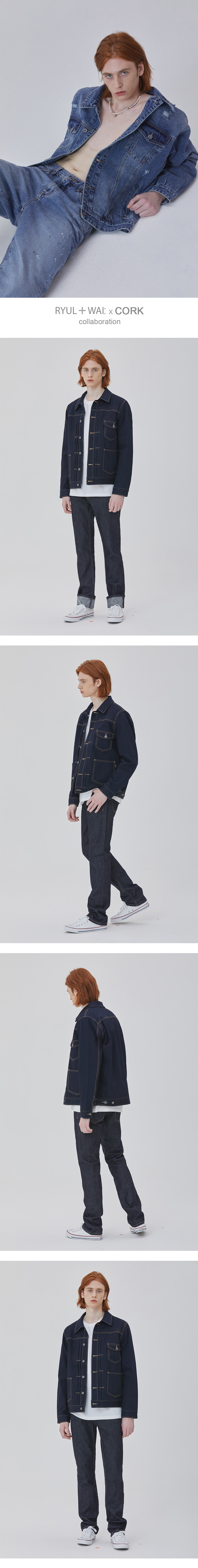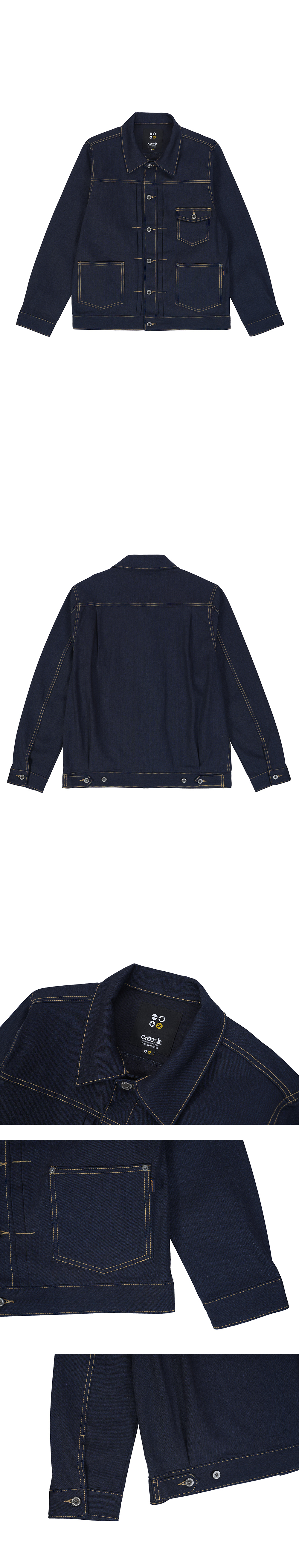 -CORK DENIM COLLABORATION COLLECTION 상품입니다. 워싱처리된 인디고 색상의 자체 제작 프리미엄 데님 원단이 사용된 상품입니다. 전체적으로 여유있는 실루엣이며, 직선적인 컴포트 스트레이트 핏의 자켓입니다. 라이트 골드의 스티치 컬러와 흑니켈 버튼이 조화로운 빈티지스런 스타일입니다. 다양한 상품들과 코디가 편한 데님 자켓입니다.