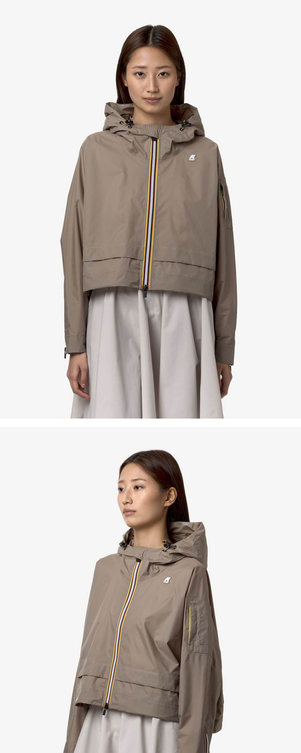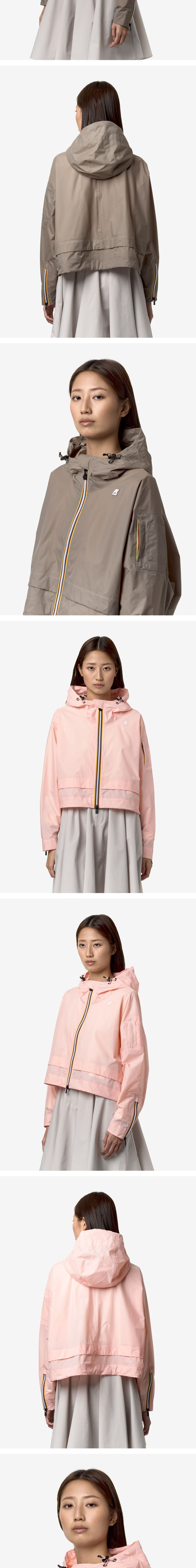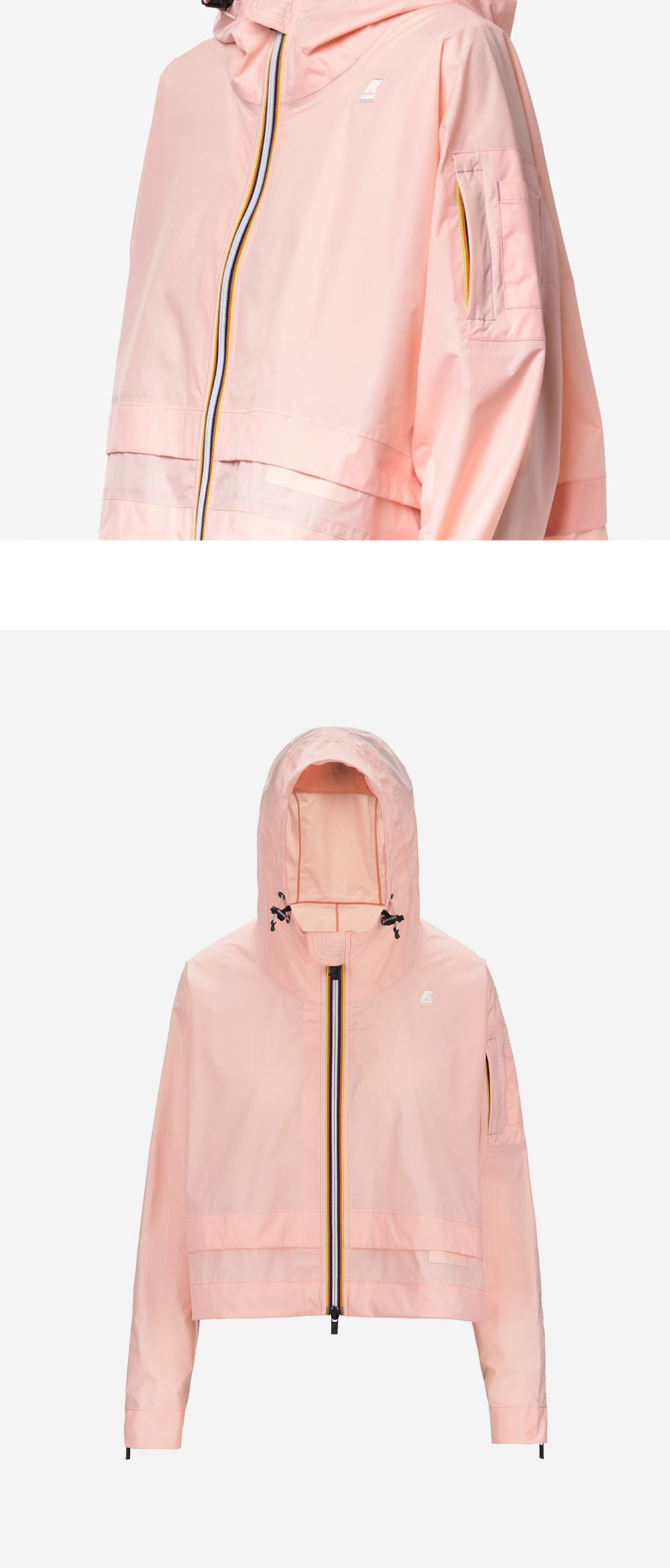 여유있게 착장 가능한 라글란 핏 여성용 크롭 자켓 방수, 방풍 성능이 우수한 나일론 립스탑 소재 사용 후드, 밑단 스트링으로 핏 조절 가능 소매 포켓을 적용하여 수납 용이 양쪽 소매 지퍼 유니크한 디테일 오버핏