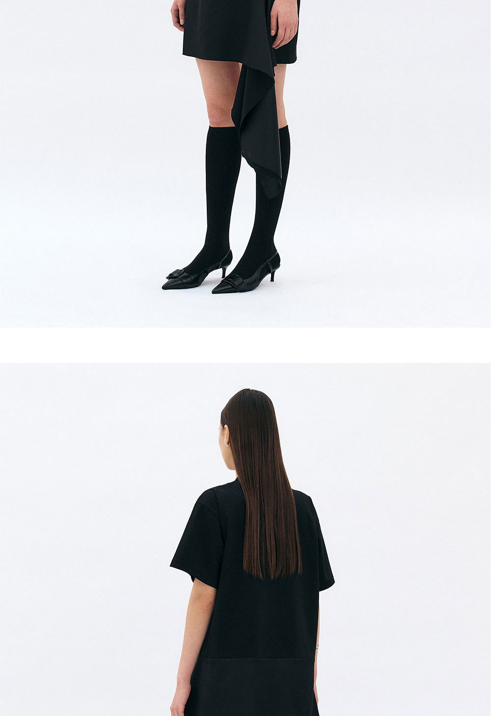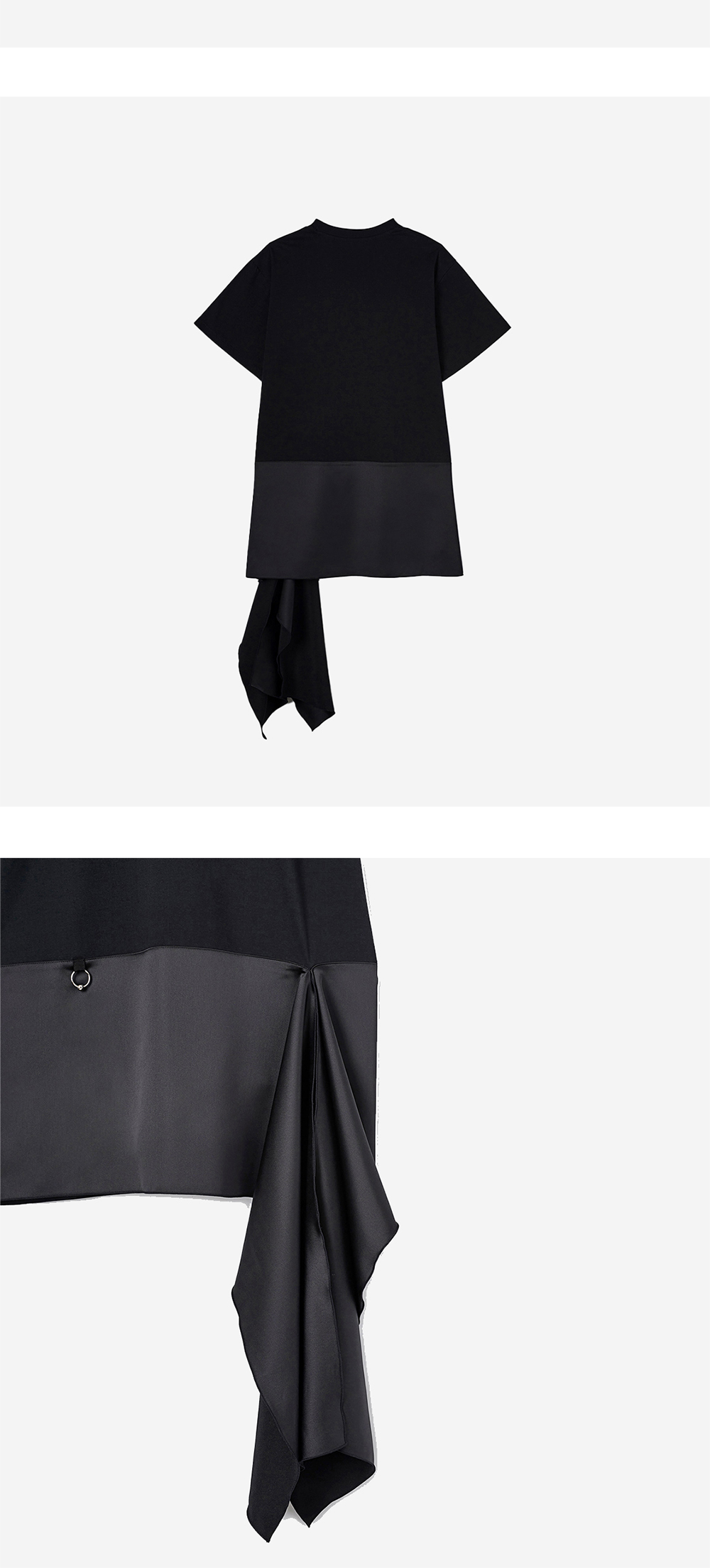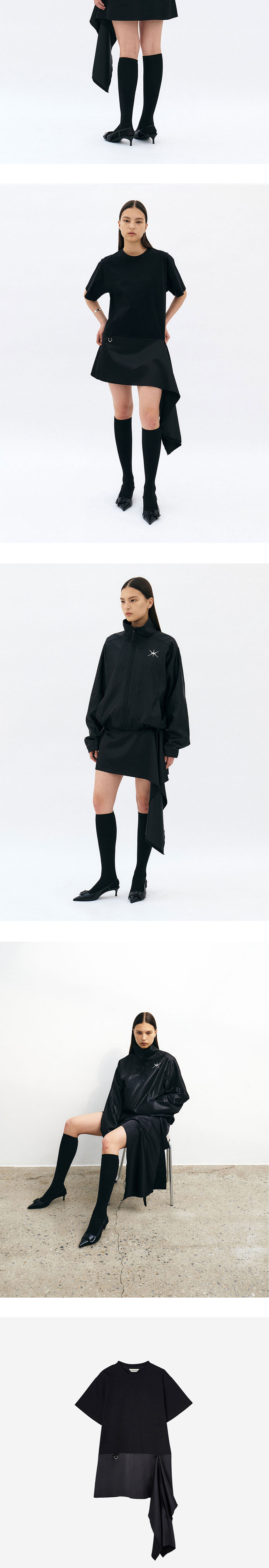 티셔츠와 스커트가 연결된 구조의 드레스입니다. 몸판은 면 혼방 원단, 스커트는 사틴 원단으로 대비되는 텍스처감이 균형감을 더하여 윤세만의 아름다움을 표현합니다. 앞 판 피어싱 포인트로 시크함을 더하였으며, 스커트에 길게 내려오는 패널이 캐주얼한 동시에 페미닌함을 연출합니다.