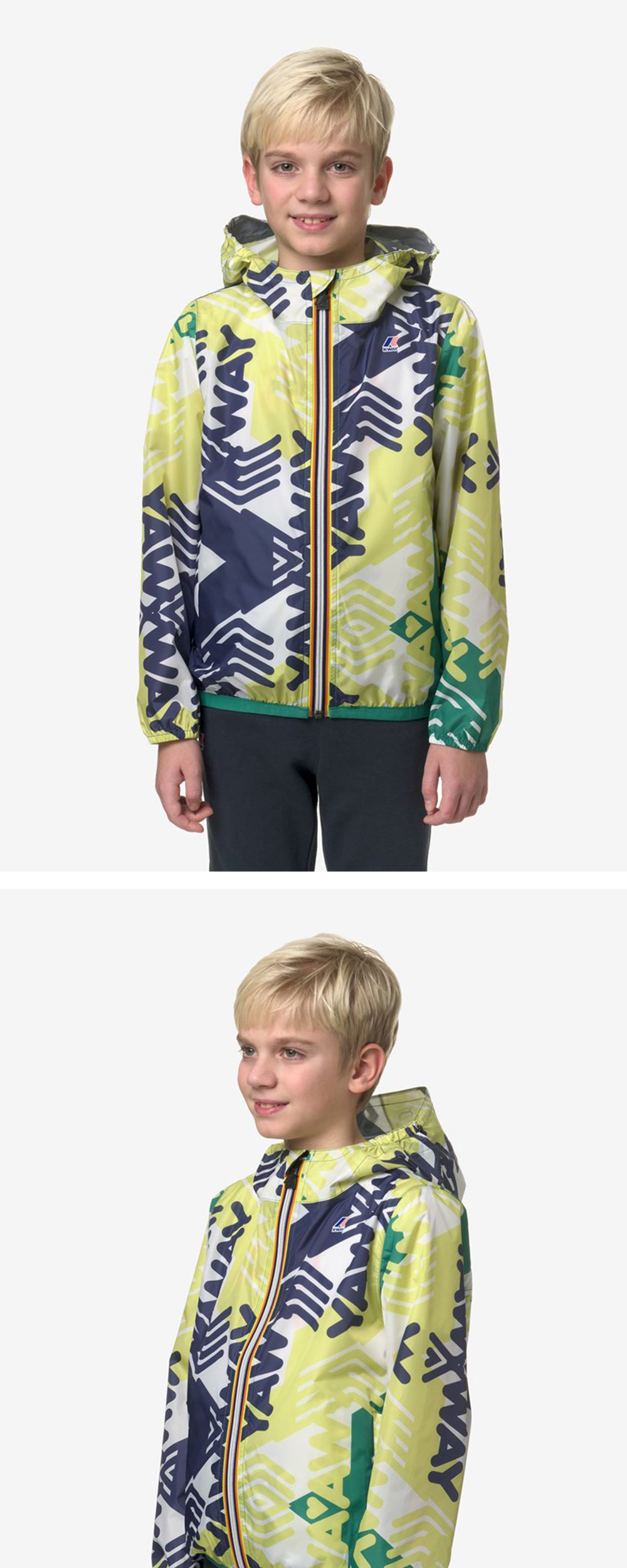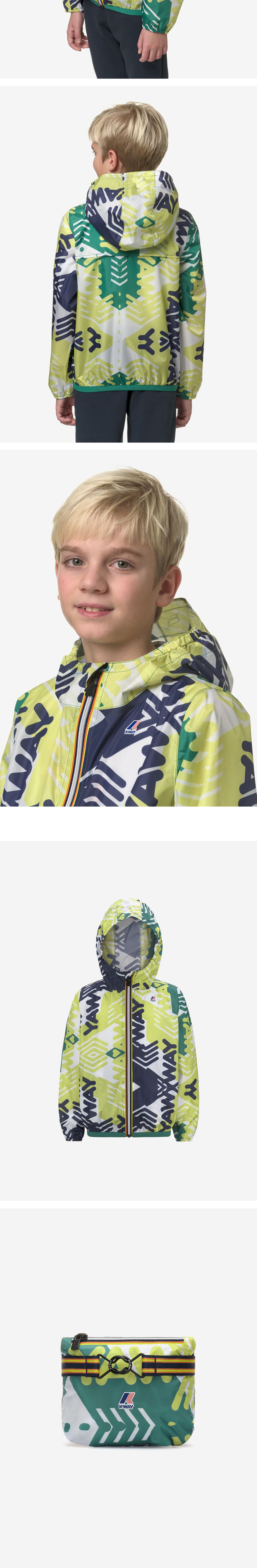 까웨 레터링을 그래픽으로 사용한 르브레 클로드 올오버 그래픽 키즈 자켓 방수, 방풍 성능이 우수한 나일론 립스탑 소재 사용 후드, 밑단 스트링으로 기호에 따라 사이즈 조절 가능 뒷면 벤틸레이션 기능 주머니로 패커블 가능, 휴대 용이 레귤러핏