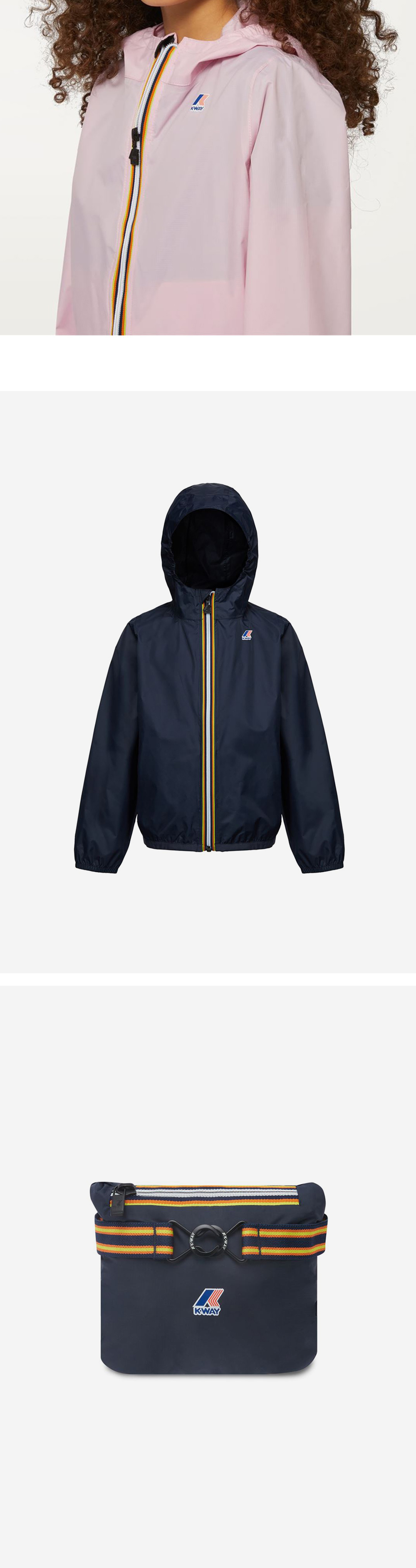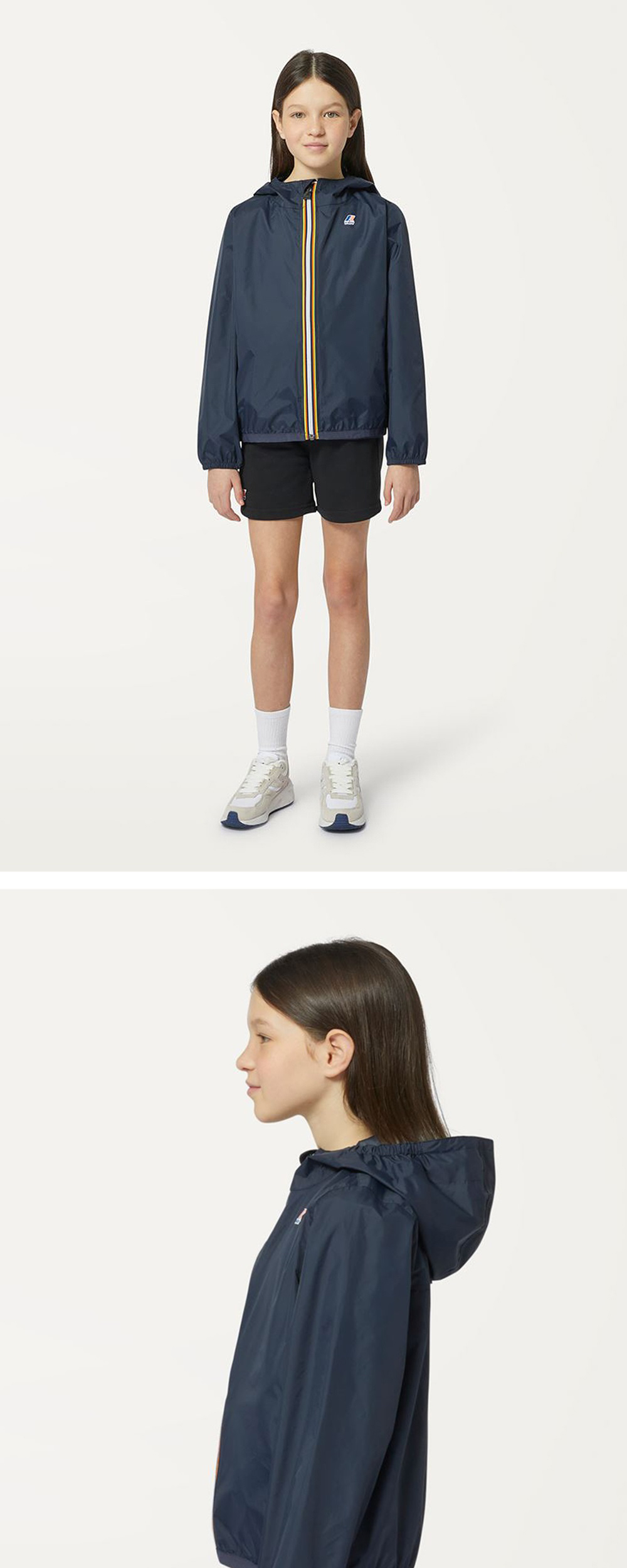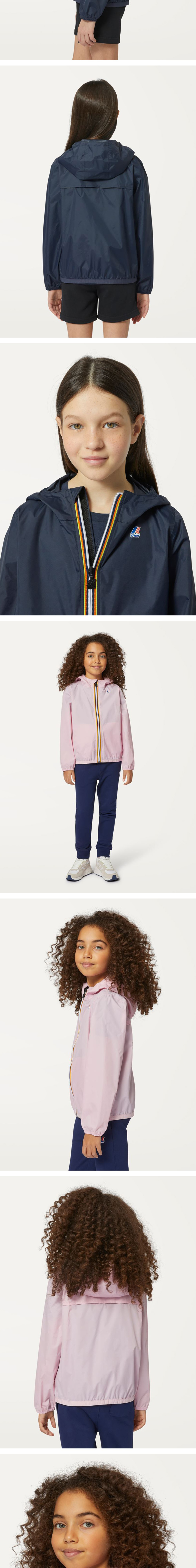 까웨의 시그니처 Le Vrai 3.0 클로드 키즈용 풀집업 자켓 방수, 방풍 성능이 우수한 나일론 립스탑 소재 사용 후드, 밑단 스트링으로 기호에 따라 사이즈 조절 가능 뒷면 벤틸레이션 기능 주머니로 패커블 가능, 휴대 용이 레귤러핏