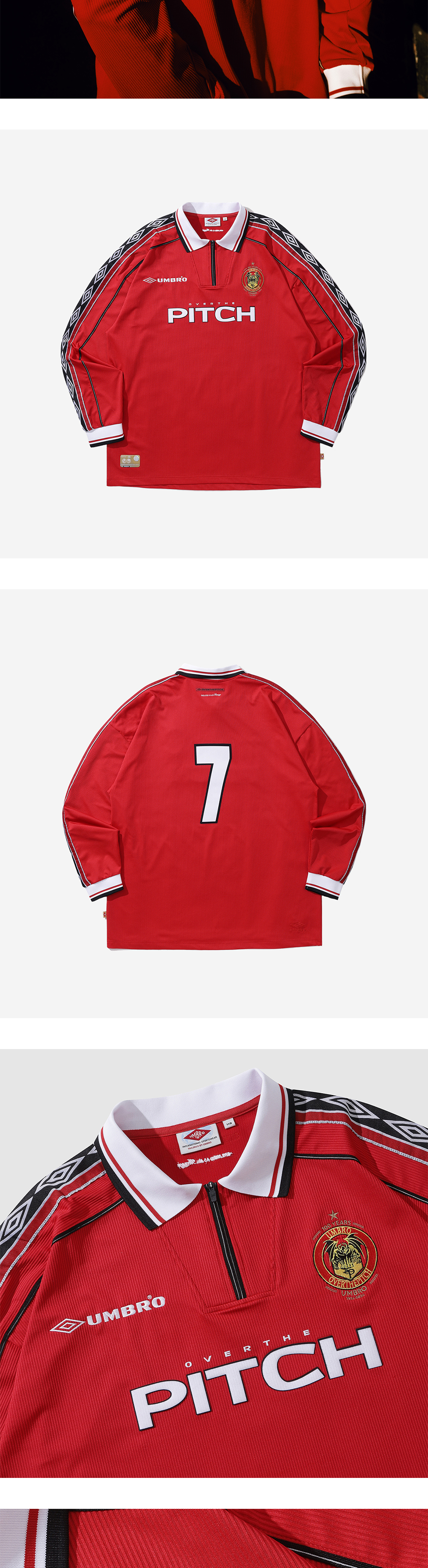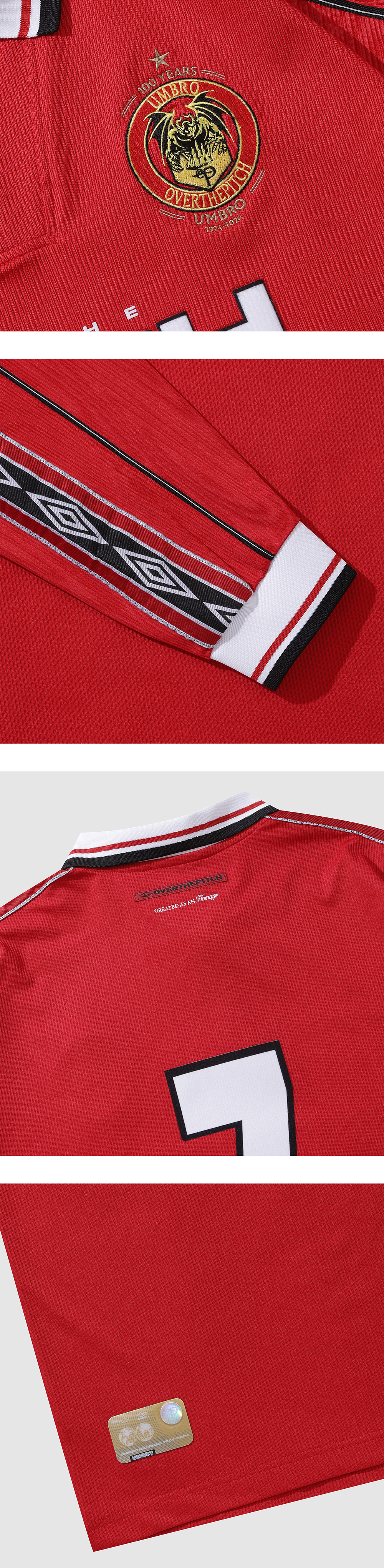 엄브로 100년의 역사 속에서 영광적인 승리의 순간을 기념하기 위해 엄브로와 오버더피치가 콜라보를 통해 제작한 축구 저지입니다. 해당 저지는 '맨체스터 유나이티드'가 98/99 시즌 프리미어리그, FA컵, UEFA 챔피언스리그에서 우승하면서 트래블을 달성한 영광적인 순간을 기념하기 위해 '맨체스터 유나이티드 98/99 HOME’ 유니폼을 오마주하여 제작하였습니다. 'Tailored by UMBRO'라는 슬로건 아래 엄브로 고유 헤리티지 디자인을 복각하였고 ‘엄브로 X 오버더피치’ 콜라보를 통해 현대적으로 재해석한 앰블럼과 스폰서쉽을 사용하였습니다.