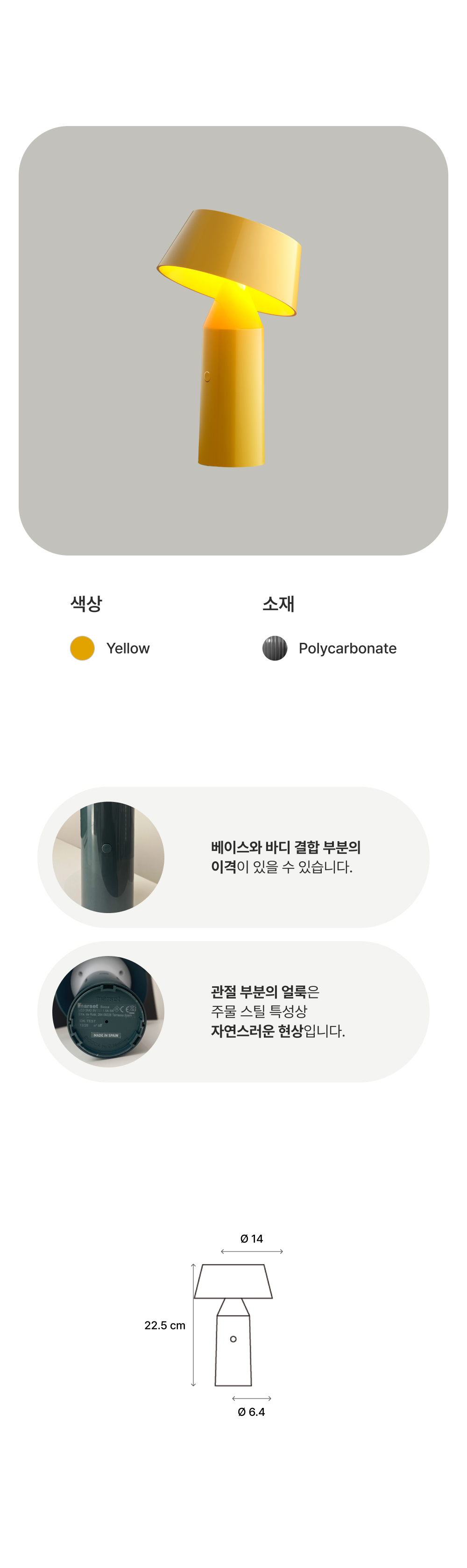 소재 특성상 발견되는 현상은 모두 정상 제품으로, 교환 및 환불의 사유가 되지 않습니다. 플라스틱 : 사출 공정 과정에서 발생하는 날카로운 마감,스크래치 등. 금속 : 공정 과정에서 발생하는 스크래치, 도장 과정에서 발생하는 마감 자국 및 산화로 인한 자국.