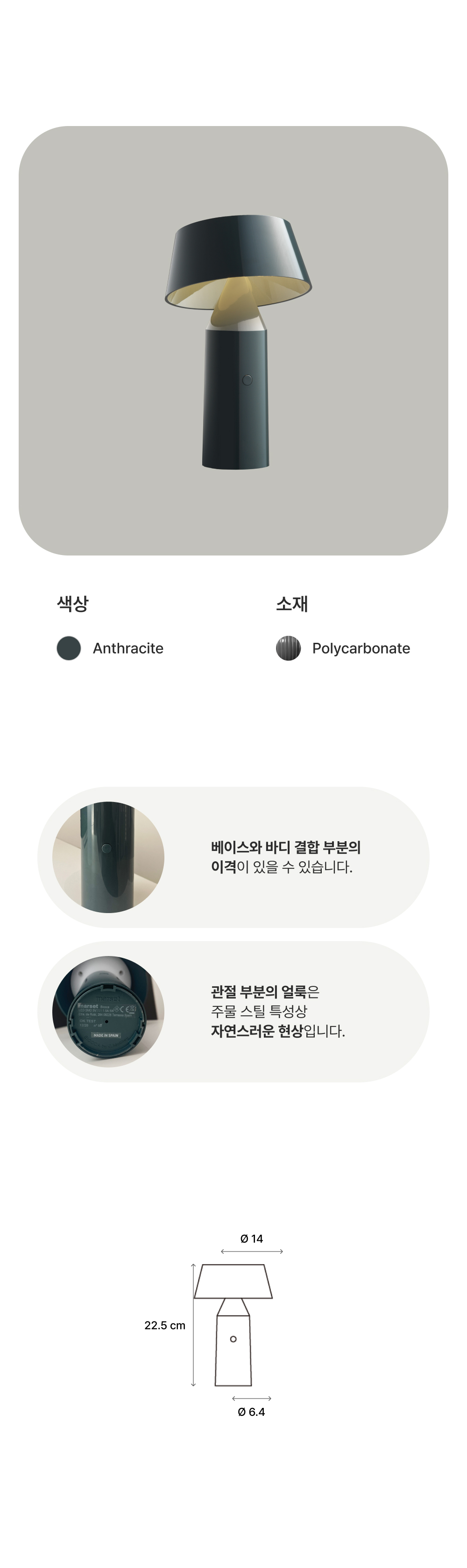 소재 특성상 발견되는 현상은 모두 정상 제품으로, 교환 및 환불의 사유가 되지 않습니다. 플라스틱 : 사출 공정 과정에서 발생하는 날카로운 마감,스크래치 등. 금속 : 공정 과정에서 발생하는 스크래치, 도장 과정에서 발생하는 마감 자국 및 산화로 인한 자국.