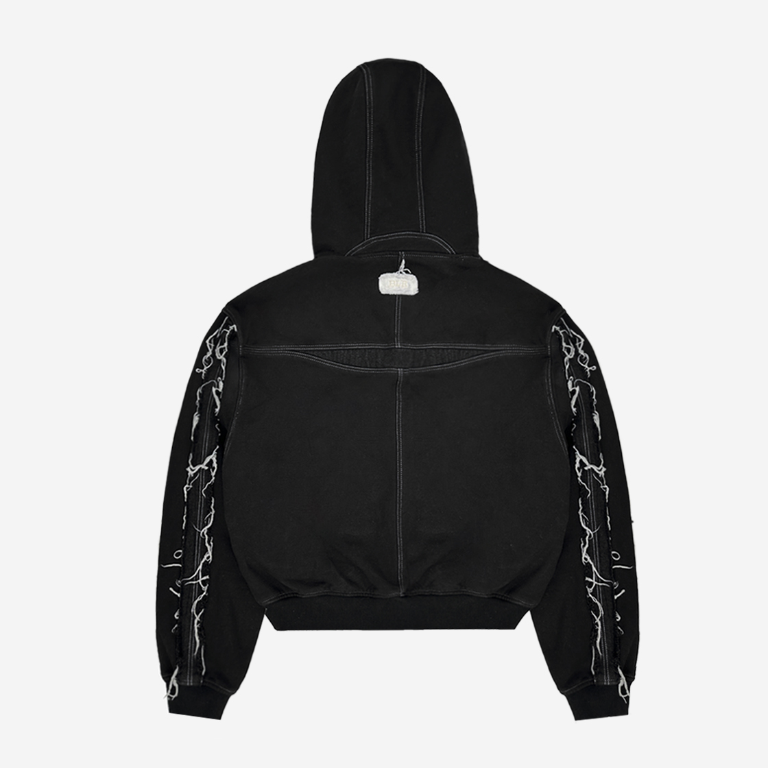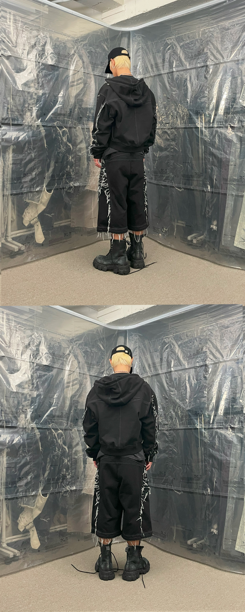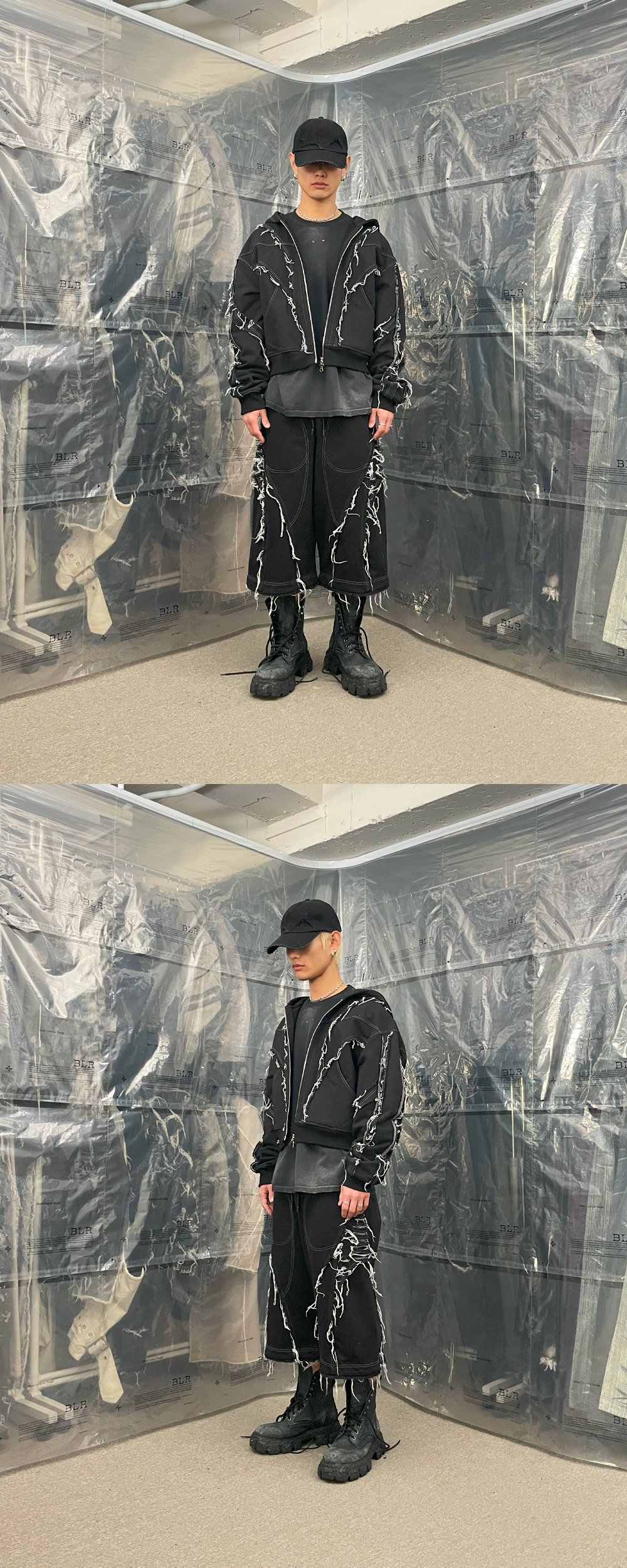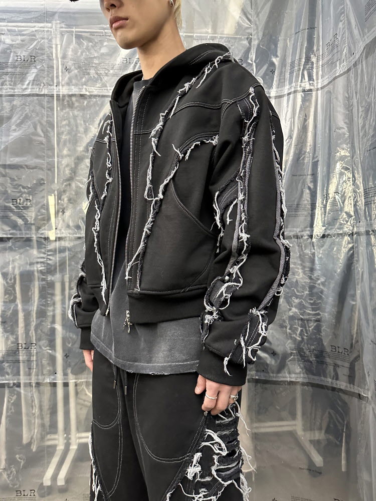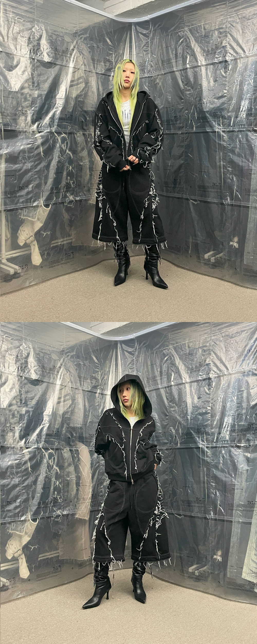 후면부 시그니처 로고 자수 및 데님패치 전면부 디스트로이드 디테일 뒷면 절개 데님 배색 포인트 2 Way 지퍼 지퍼 로고 슬라이더