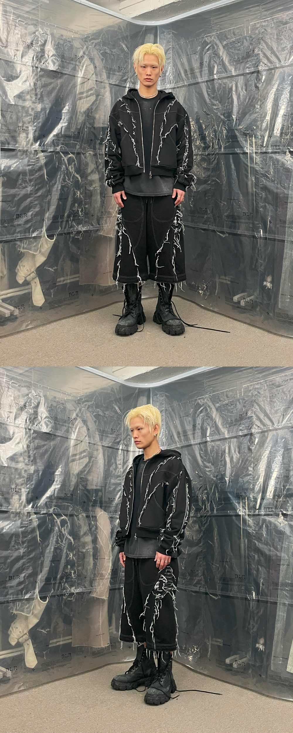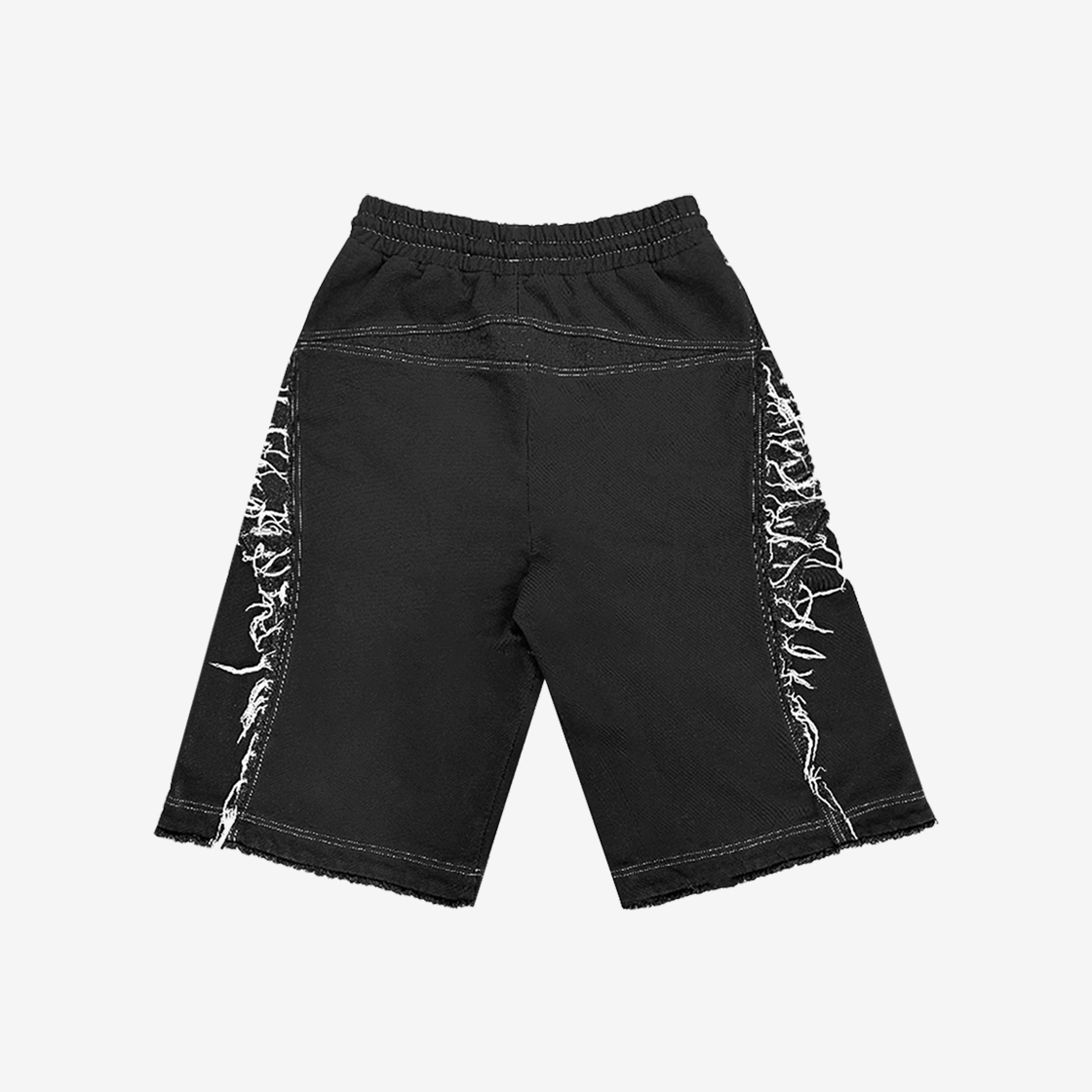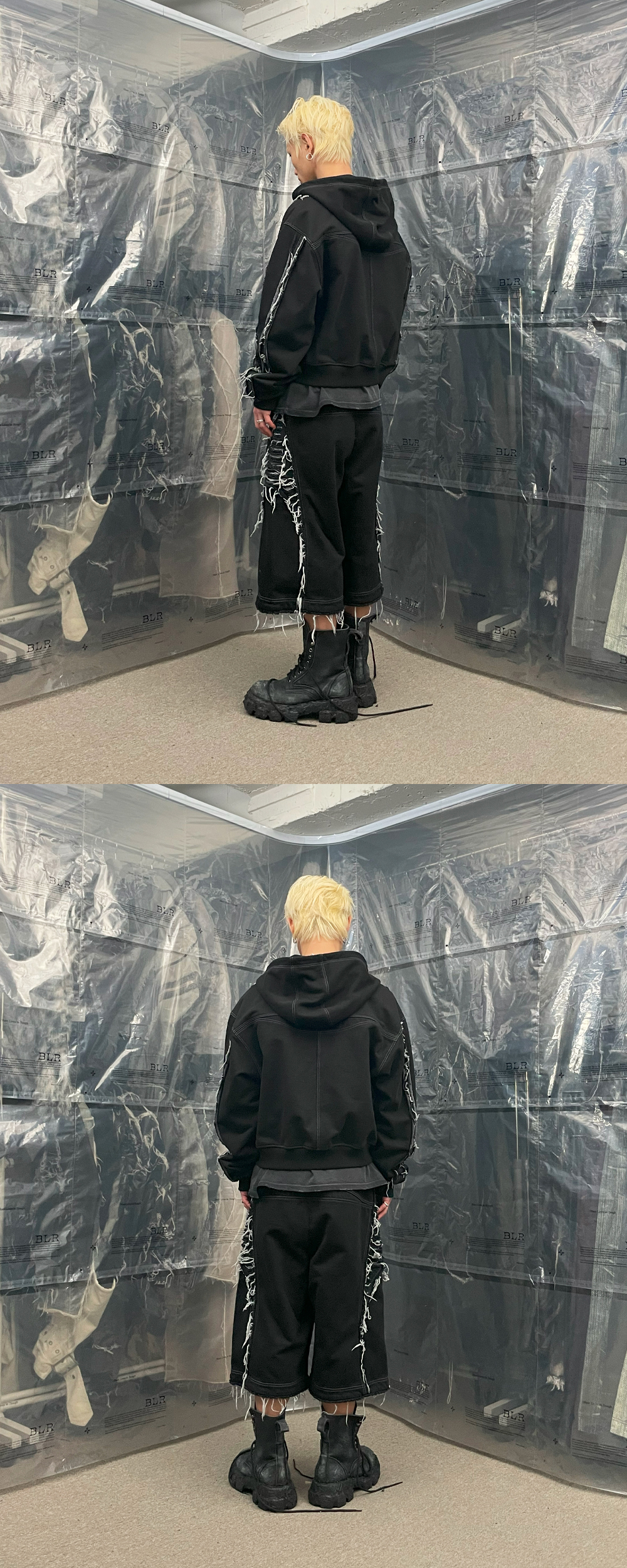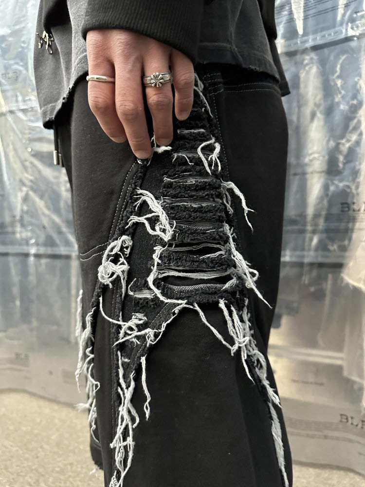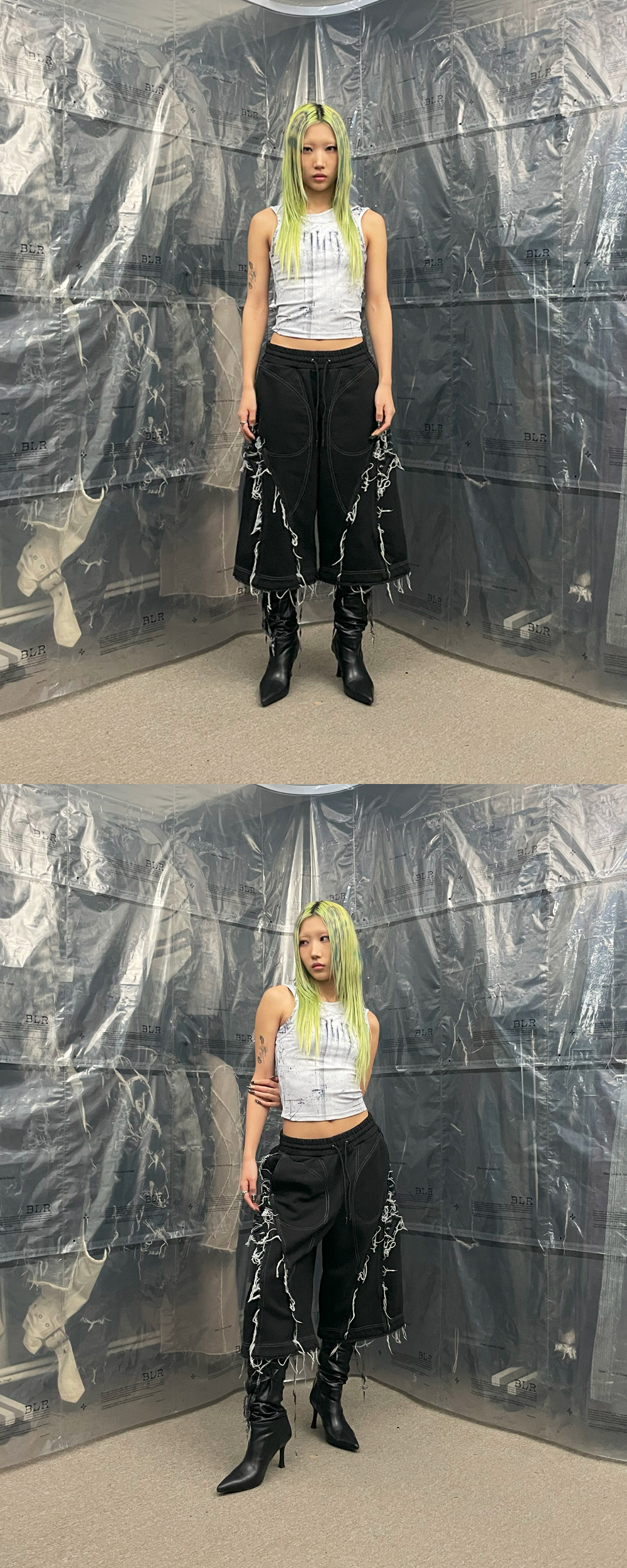 배색 디스트로이트 디테일 허리밴드, 스트링 뒷면 절개 데님 배색 포인트