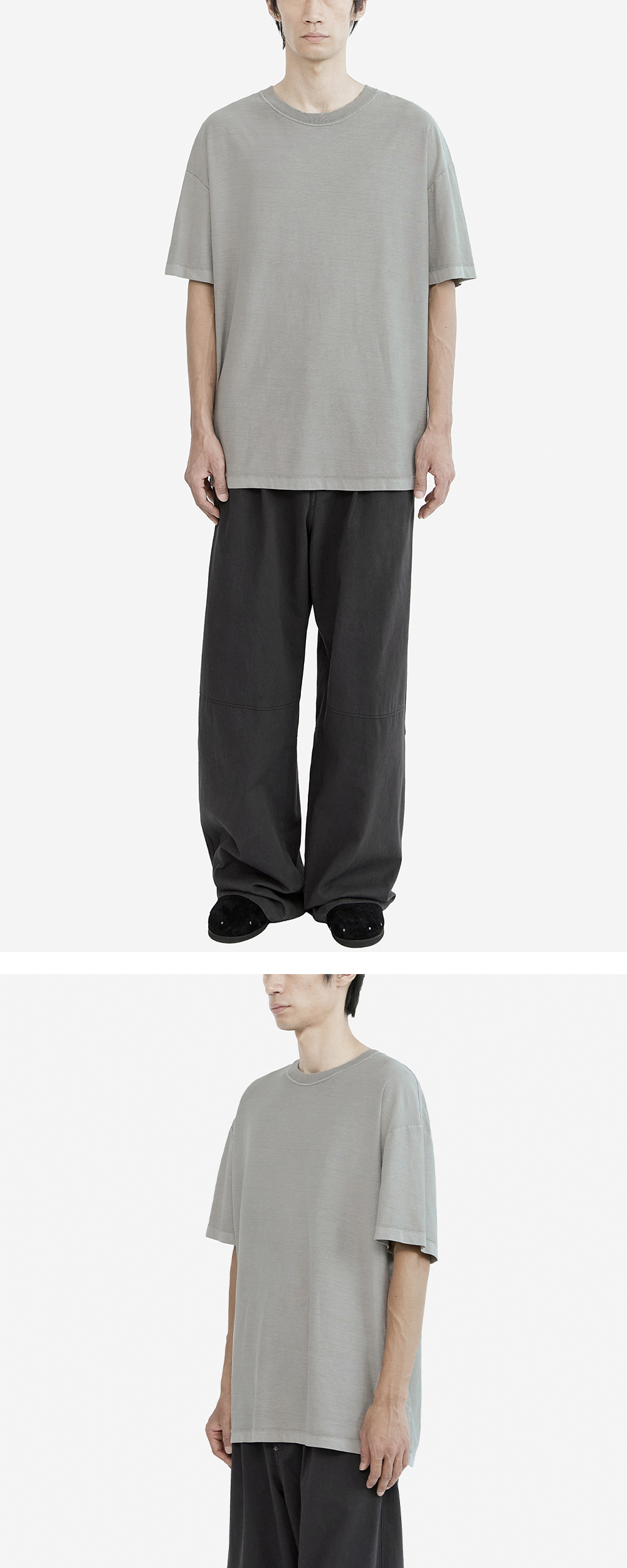 1 tuck gosima pants - deep charcoal 고시마 팬츠 2.0을 기반으로 디테일과 실루엣을 변형시킨?팬츠. 전체적으로 넉넉하고 루즈하되 플레어-스트레이트-와이드 사이 절묘한 균형점을 찾아 새로운 실루엣을 추구합니다. 본 제품의 디자인은 VTG 엔지니어드 팬츠 기반으로 하며 당시 디테일을 차용, 포켓 외곽과 전면 플라이 하단의 원단이 두껍게 겹치는 부분을 리벳으로 단단히 눌러 마감해주었습니다. 전/후면의 하단 절개 적용하였으며 가먼트 째로 피그먼트 다잉 및 워싱 진행하였습니다. 불꽃놀이(하나비) 패턴의 후면 택과 허리 둘레 조절 가능한 사이드 어드저스터 디테일. *직전 차수 대비, 금번 차수의 경우?유사한 컬러감, 유사한?실측 및 착용감으로 제작되었습니다. 정확한 상세 사이즈의 경우, 실측표 확인 부탁드립니다. *모델: 170 중반 / 마른 체형, 3사이즈 착용