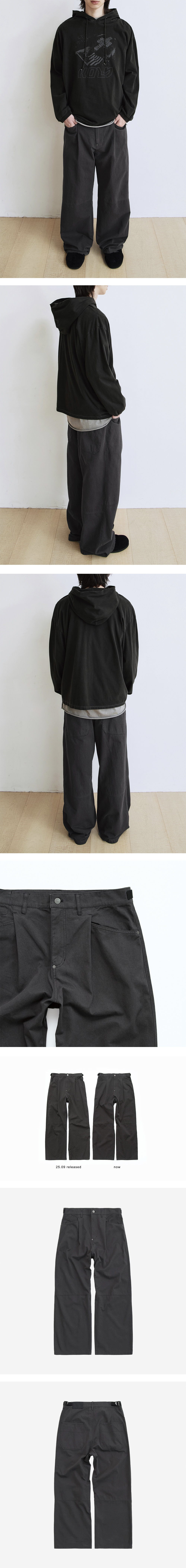 1 tuck gosima pants - deep charcoal 고시마 팬츠 2.0을 기반으로 디테일과 실루엣을 변형시킨 팬츠. 전체적으로 넉넉하고 루즈하되 플레어-스트레이트-와이드 사이 절묘한 균형점을 찾아 새로운 실루엣을 추구합니다. 본 제품의 디자인은 VTG 엔지니어드 팬츠 기반으로 하며 당시 디테일을 차용, 포켓 외곽과 전면 플라이 하단의 원단이 두껍게 겹치는 부분을 리벳으로 단단히 눌러 마감해주었습니다. 전/후면의 하단 절개 적용하였으며 가먼트 째로 피그먼트 다잉 및 워싱 진행하였습니다. 불꽃놀이(하나비) 패턴의 후면 택과 허리 둘레 조절 가능한 사이드 어드저스터 디테일. *직전 차수 대비, 유사한 컬러감, 유사한 실측 및 착용감으로 제작되었습니다. *모델: 178cm / 마른 체형, 3사이즈 착용