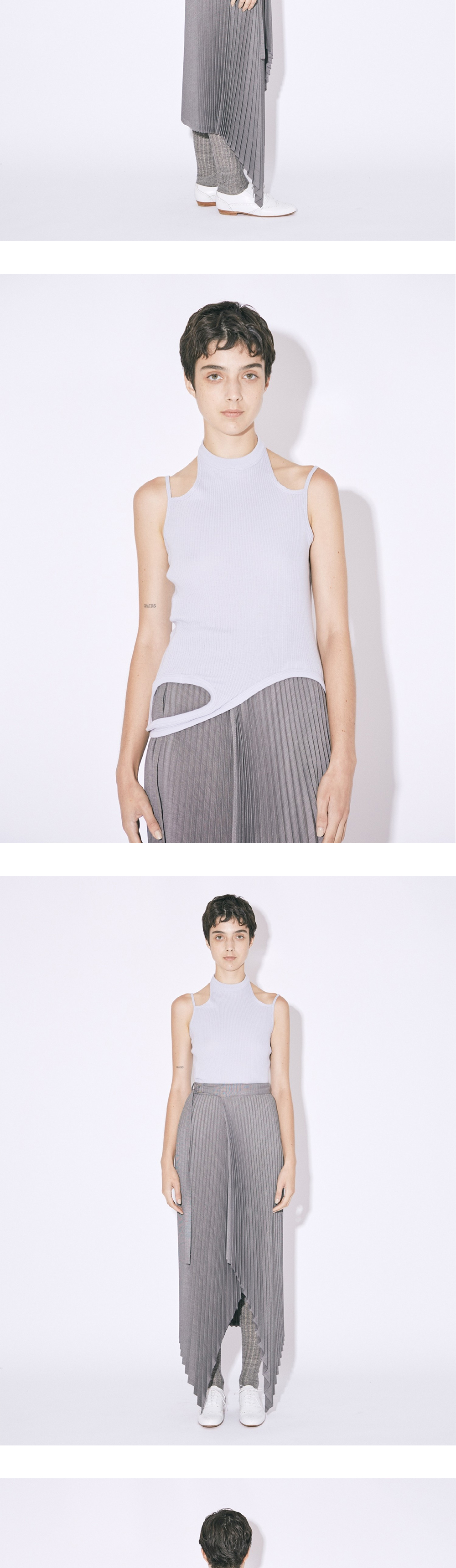착용하는 방향에 따라 칼라의 디자인이 변화하는 Beautiful People의 탱크 탑입니다. 위아래를 뒤집어 투웨이로 연출할 수 있습니다. - 얇은 스트랩이 달린 W 스트랩의 홀터넥 탑 - 방향을 다르게 착용할 경우, 아메리칸 슬리브의 탱크 탑으로 변화하는 디자인 - 컷아웃 디테일로 연출되는 포인트 - 몸에 맞는 실루엣과 허리선까지 오는 기장 * 모델 신체 스펙 - 176cm / 착용 사이즈 - 38 *상세 이미지 내 모델이 착용한 상품의 경우, 동일한 상품의 타 컬러인 점 참고 부탁드립니다.