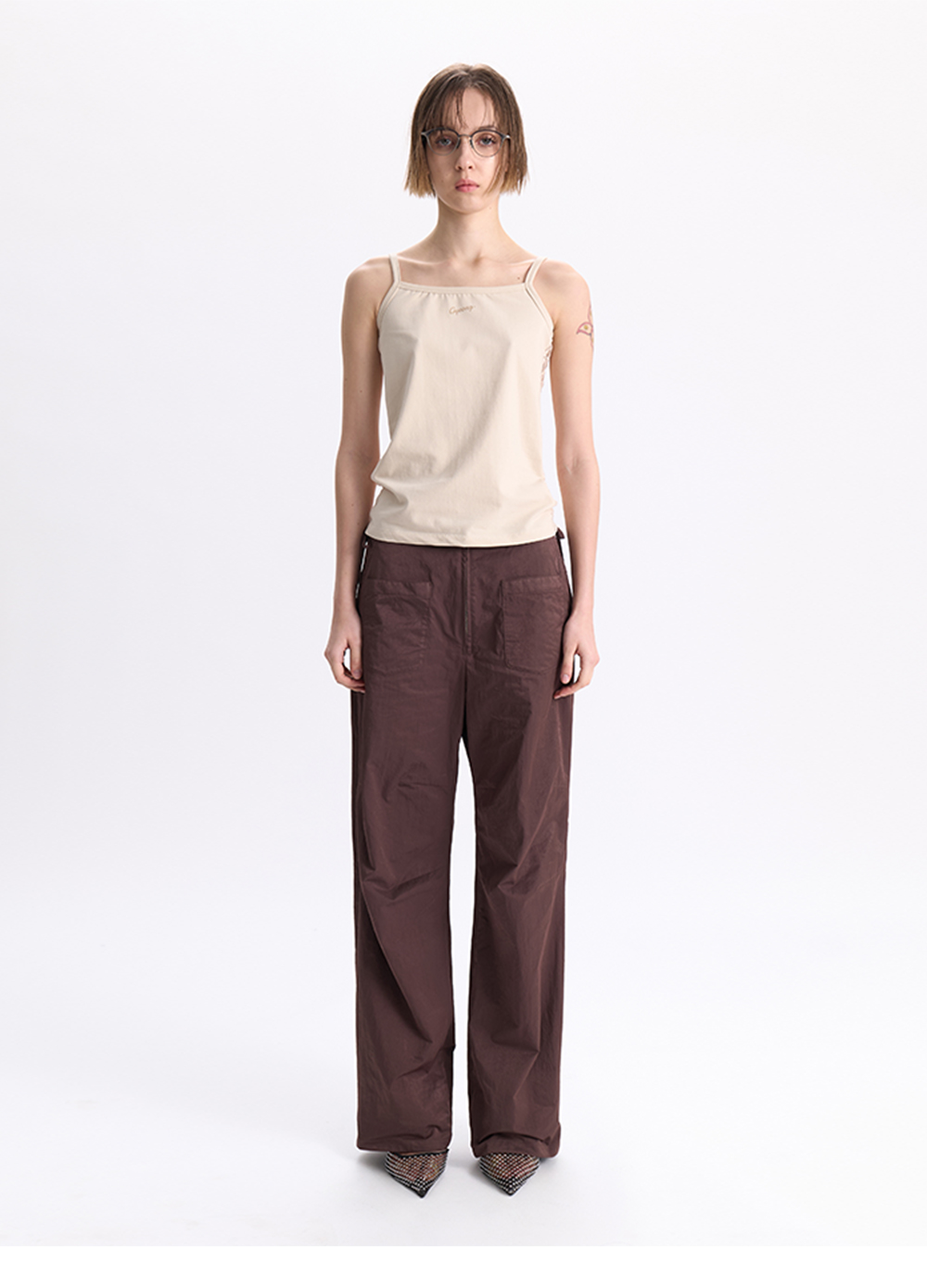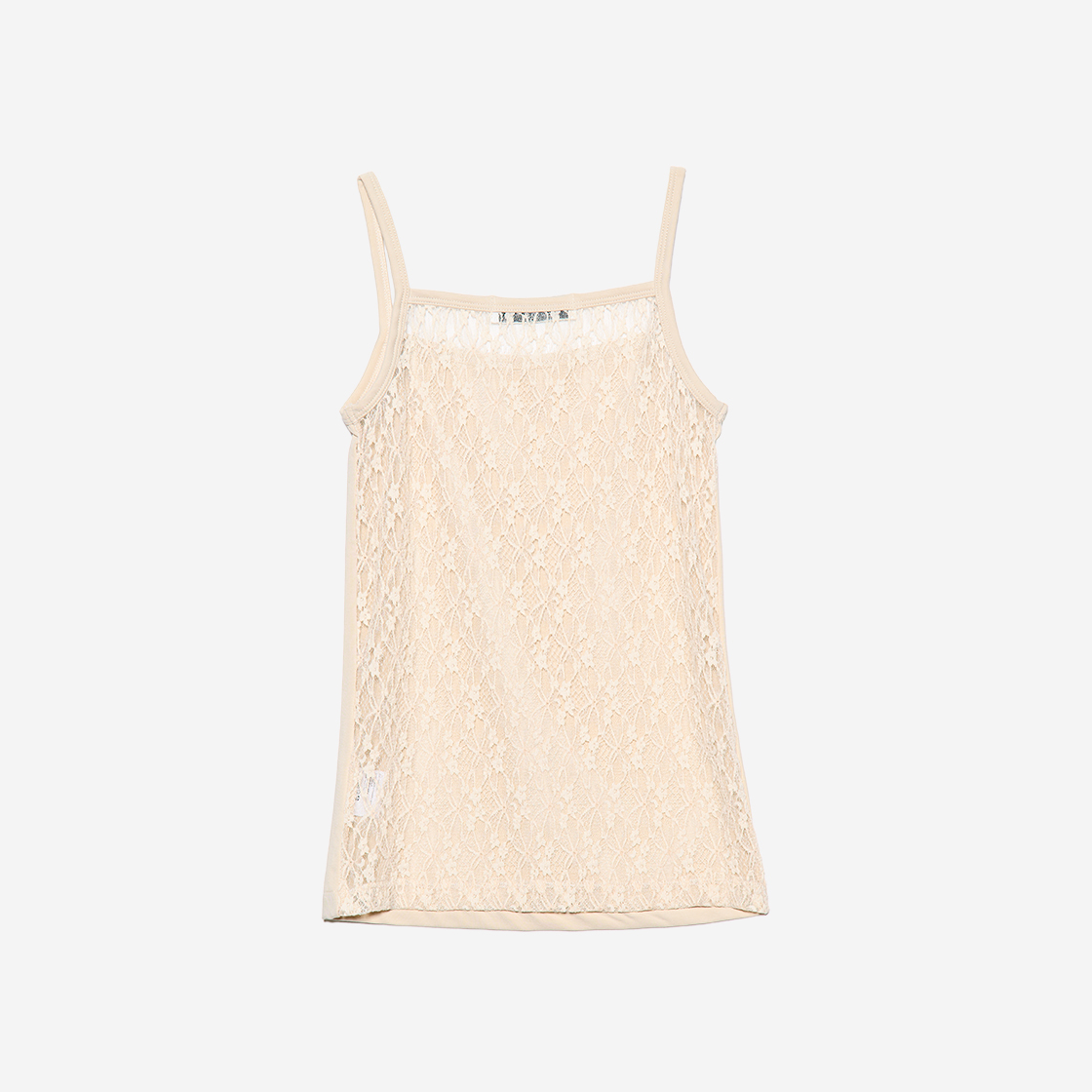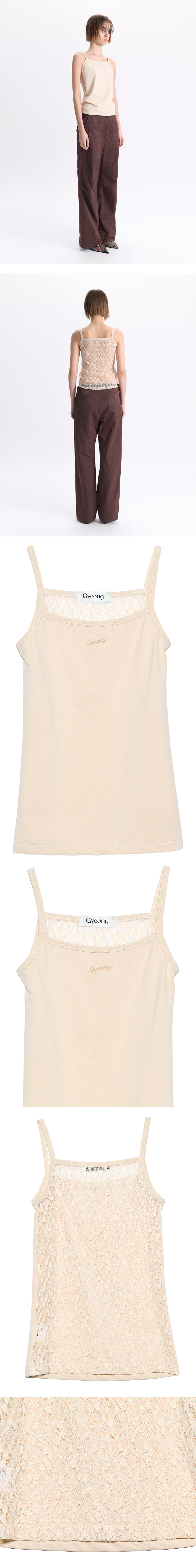 - 전면과 후면의 원단이 믹스된 슬리브리스<br><br> - 전면 Gyeong로고 나염 디테일<br> - 후면 레이스 원단 사용<br> - 타이트한 실루엣<br><br> * Shell 1 : 82% Cotton, 18% Span<br><br> * Shell 2 : 95% Nylon, 5% Span<br><br> * Made in Korea<br><br> * Model - 174cm / One Size<br>