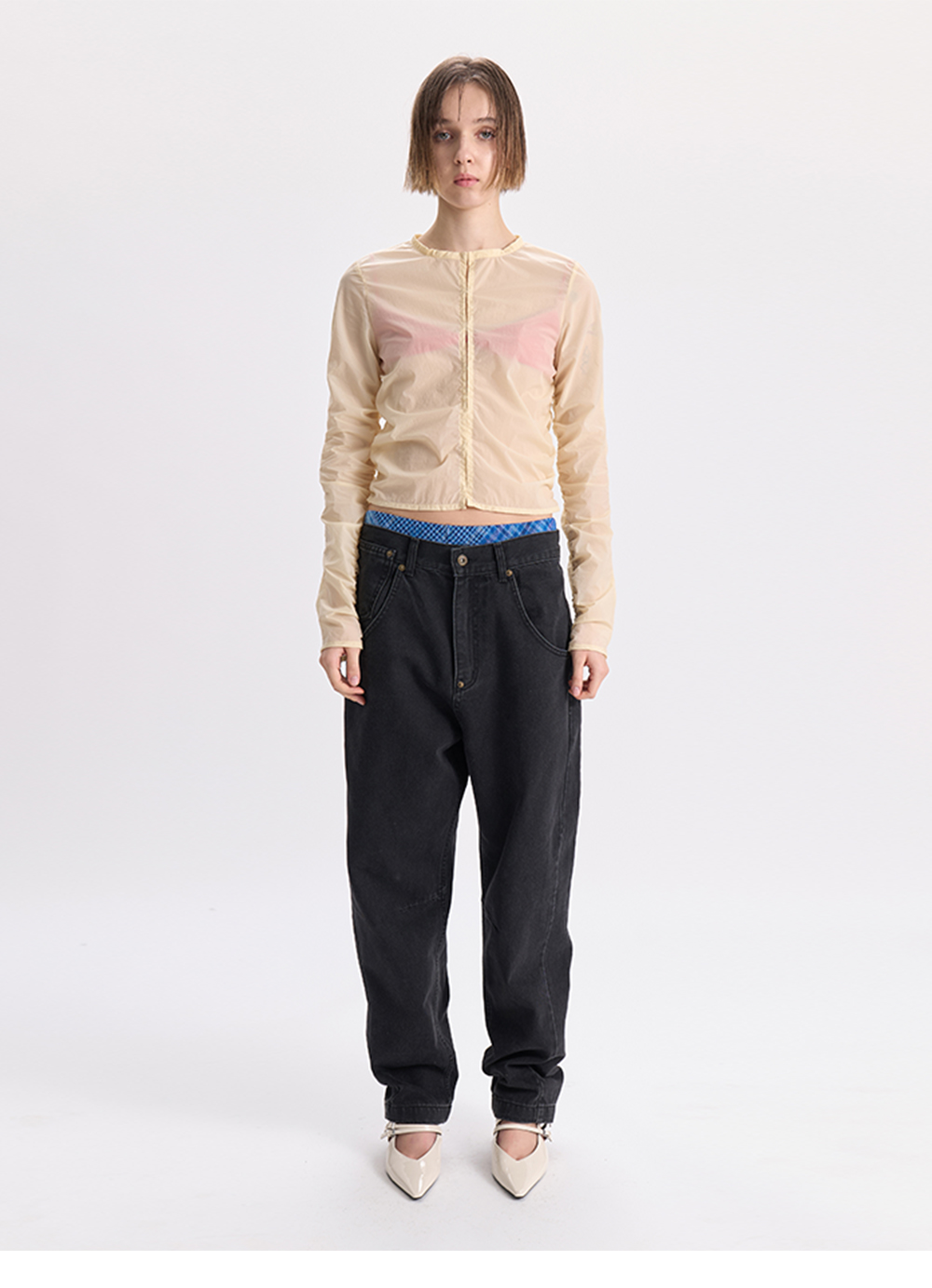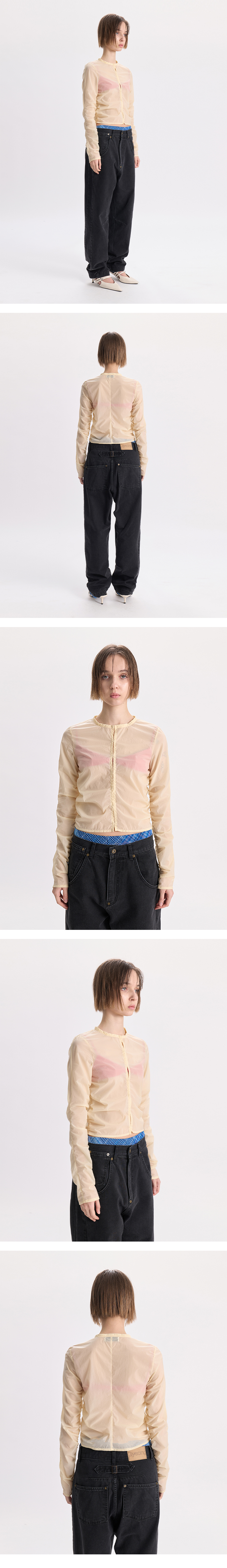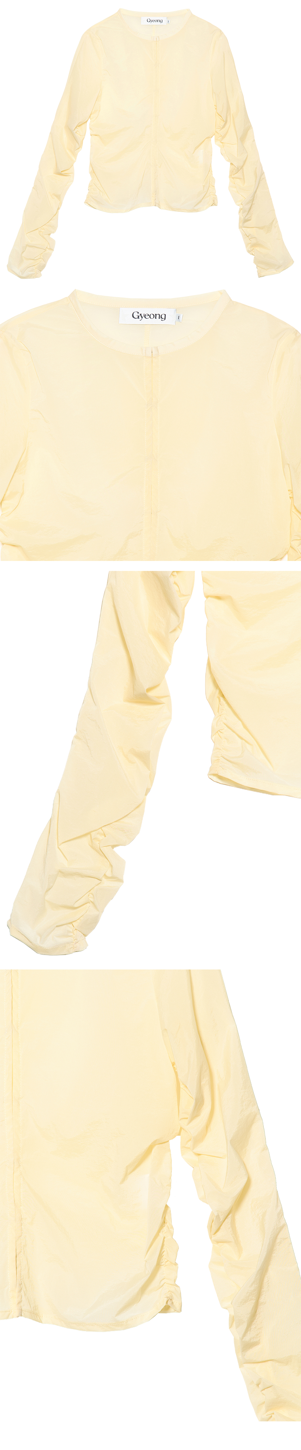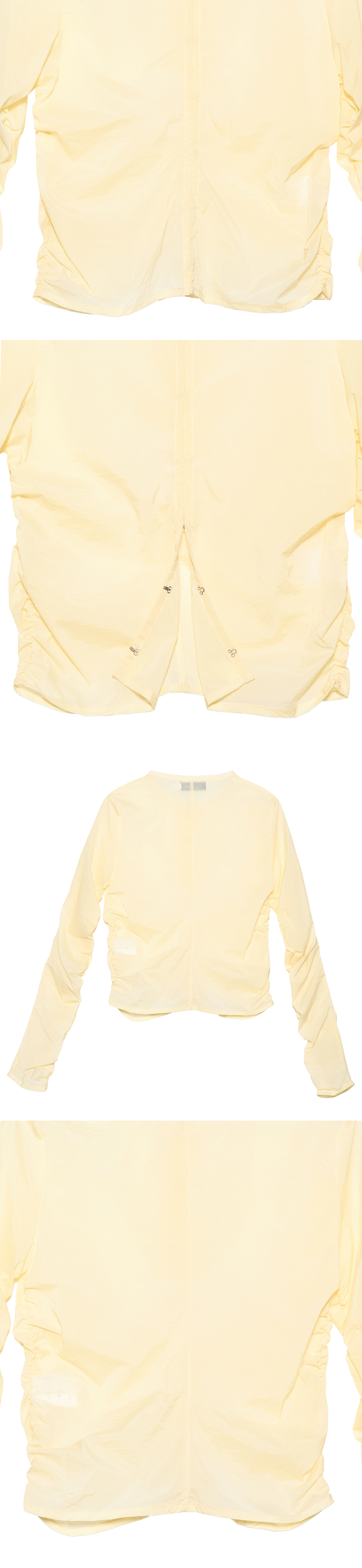 - 쉬어한 소재의 자켓<br><br> - 전면 사이드 셔링 디테일<br> - 소매 셔링 디테일<br> - 후크 여밈의 포인트<br> - 슬림핏의 실루엣<br><br> * Shell : 90% Nylon, 10% Span<br><br> * Made in Korea<br><br> * Model - 174cm / 2 Size<br>