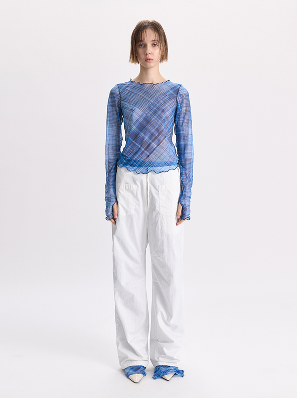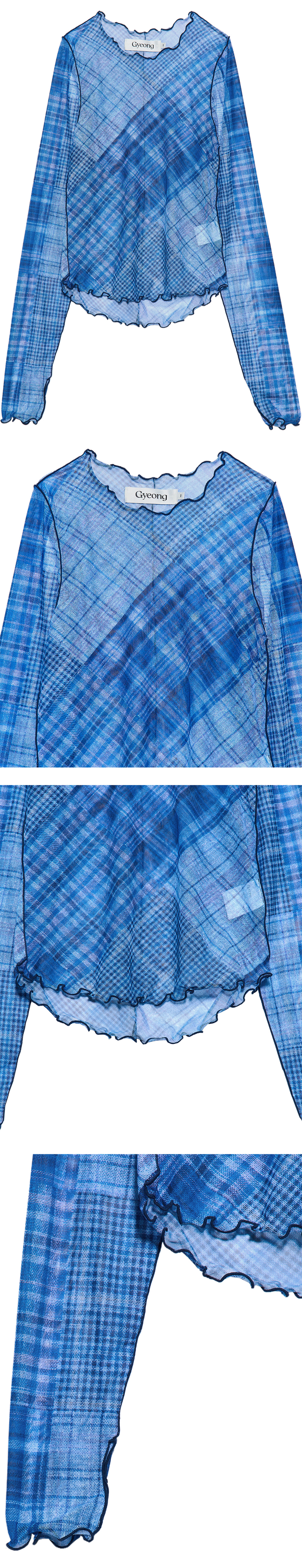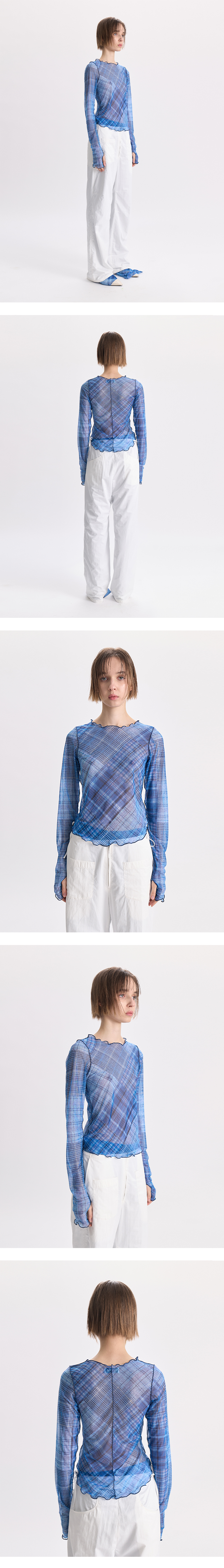 - 전면 프린팅의 체크 메쉬 탑<br><br> - 레이어드에 용이<br> - 웨이비한 사이드, 후면 라인 디테일<br> - 핑거 홀 디테일<br> - 방향이 전부 다른 체크 디테일<br> - 레귤러 핏 실루엣<br><br> * Shell : 87% Polyester, 13% Span<br><br> * Made in Korea<br><br> * Model - 174cm / 2 Size<br>