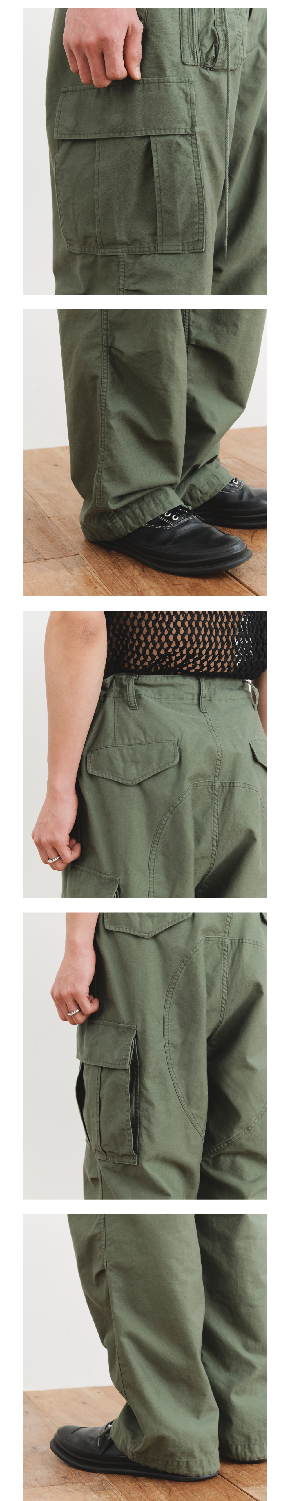 - 오버사이즈 핏의 몰스킨 소재 카고 팬츠 - 워싱 가공으로 유연한 실루엣과 은은한 광택감 연출 - 전면 버튼 클로저 - 사이즈 조절에 용이한 드로우 스트링 및 스토퍼 - 전면 2개 플랩 포켓과 사이드 아웃포켓 - 전면 유틸리티 포켓과 무릎 턱 디테일 - 후면 2개 플랩 포켓 - 밑단 드로우 스트링으로 실루엣 연출 - stone washed * made in korea Color Khaki Material Cotton 100% (Japanese Fabric)