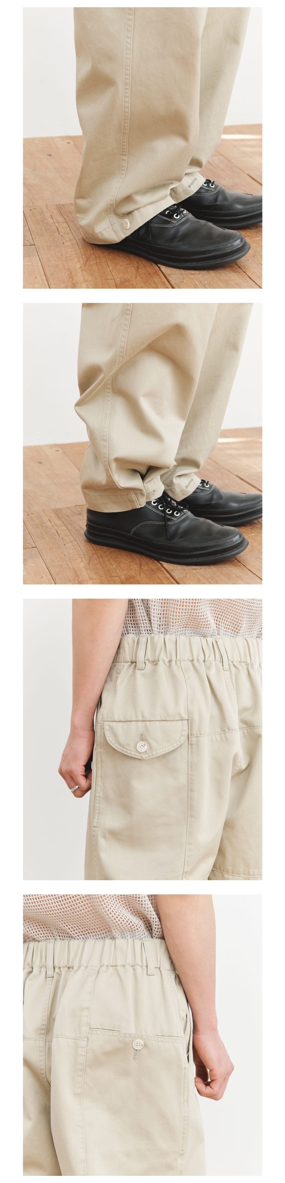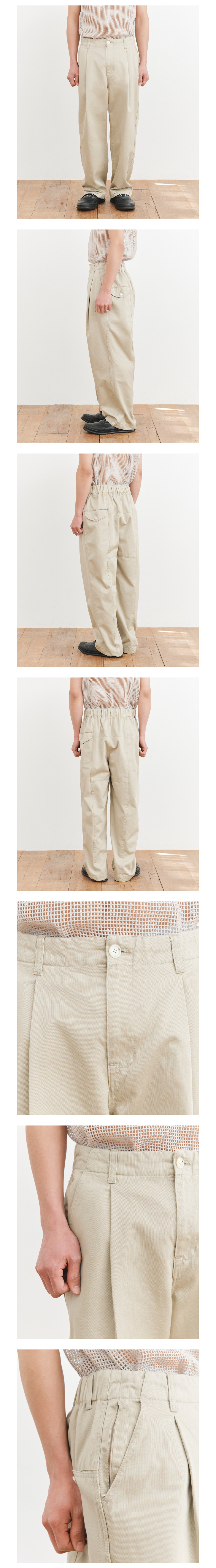 - 세미 오버사이즈 실루엣의 원 턱 팬츠 - 탄탄한 터치감의 코튼 소재 - 워싱 가공으로 은은한 광택감 연출 - 전면 YKK 지퍼 및 버튼 클로저 - 전면 2개의 인 포켓과 히든 지퍼 포켓 - 후면 허리 밴딩처리로 편안한 착용감 - 후면 사이드 플랩 포켓과 인 포켓 - 밑단 버튼 디테일로 실루엣 연출 - stone washed * made in korea Color Beige Material Cotton 100% (Japanese Fabric)