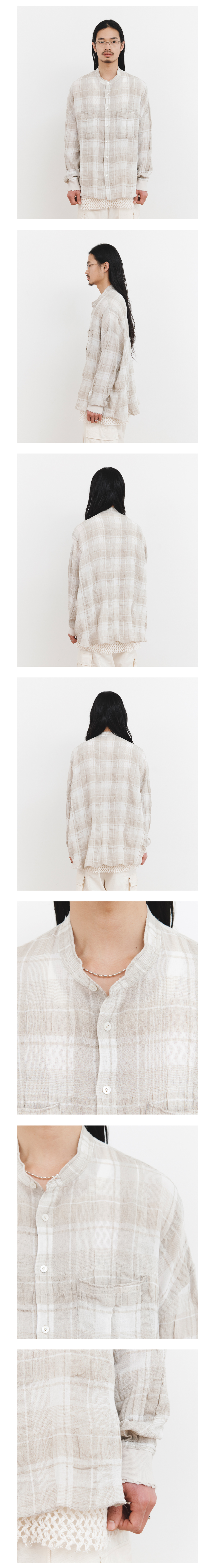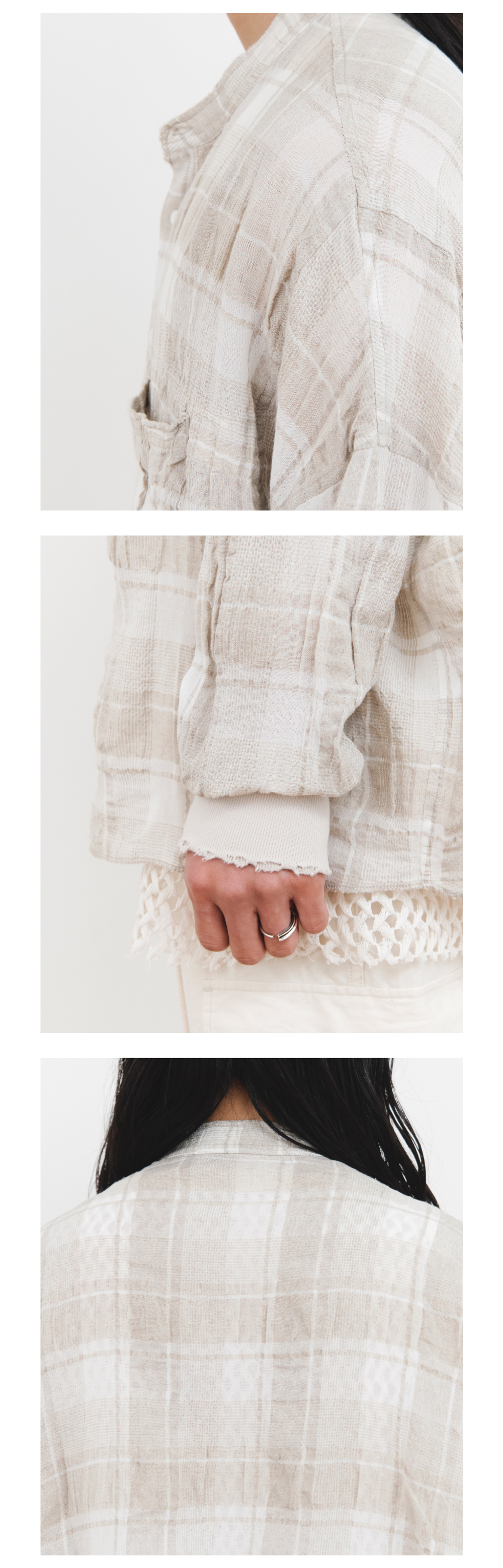 - 오버사이즈 실루엣의 체크 셔츠 - 린넨과 면사, 나일론사를 블렌드한 와셔 소재 - 워싱 가공으로 유연한 실루엣과 내부 은은한 비침 - 밴드 카라 및 커팅 마감 - 전면 2개 러프 컷 디테일 아웃포켓 - 헴 라인 러프 커팅 처리 - 데미지 처리 된 소매 립 - one washed * made in korea Color Beige Material Linen 64% Cotton 33% Nylon 3% (Japanese Fabric)