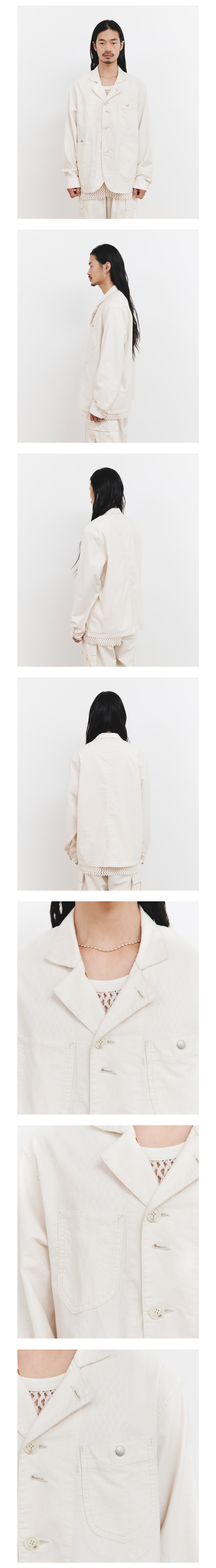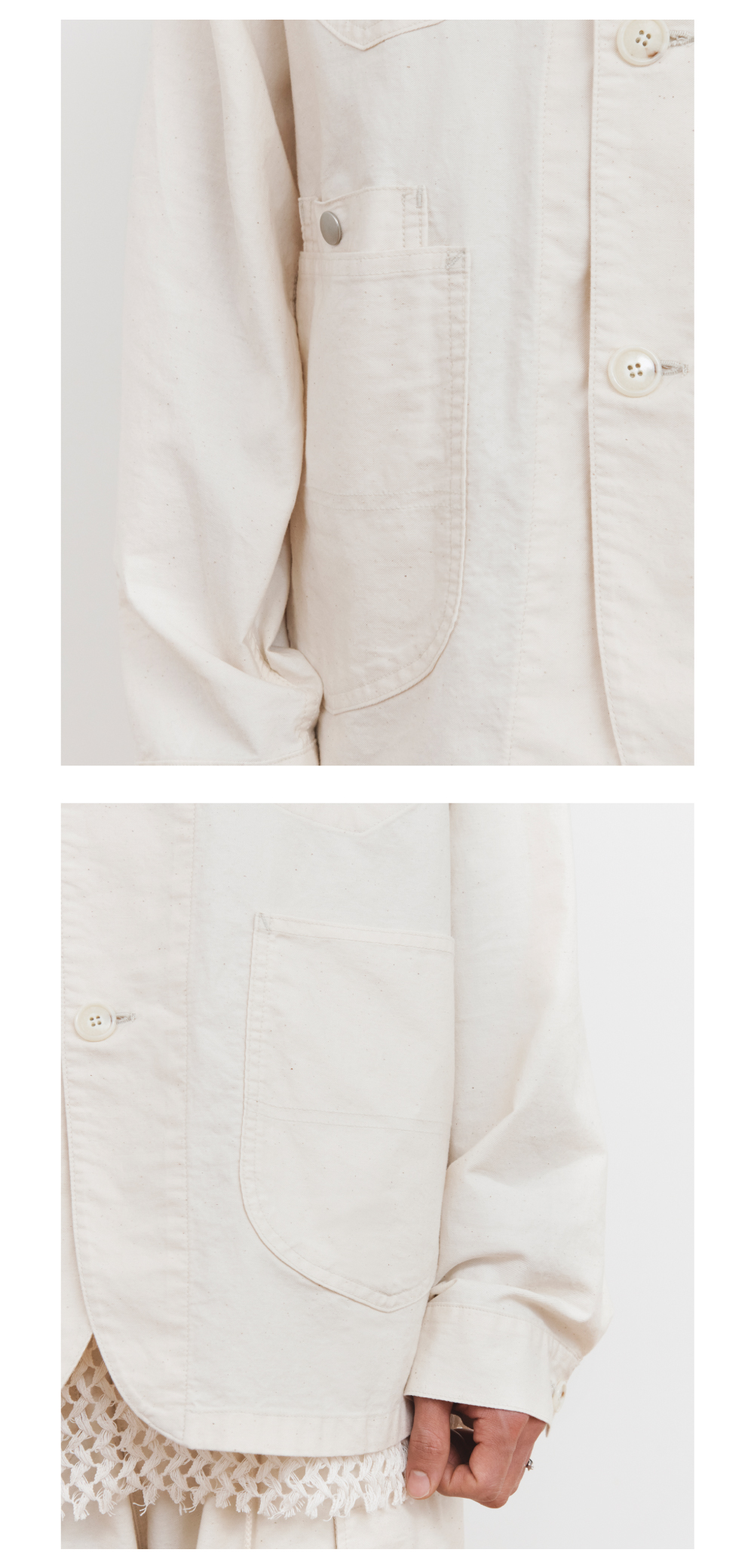 - 세미 오버사이즈 핏의 커버옷 자켓 - 부드러운 터치감의 코튼 소재 - 워싱 가공으로 유연한 실루엣 - 전면 버튼 클로저 - 전면 6개 아웃포켓과 YKK 스냅 버튼 - 내부 아웃포켓 - one washed * made in korea Color Natural Material Cotton 100% (Japanese Fabric)