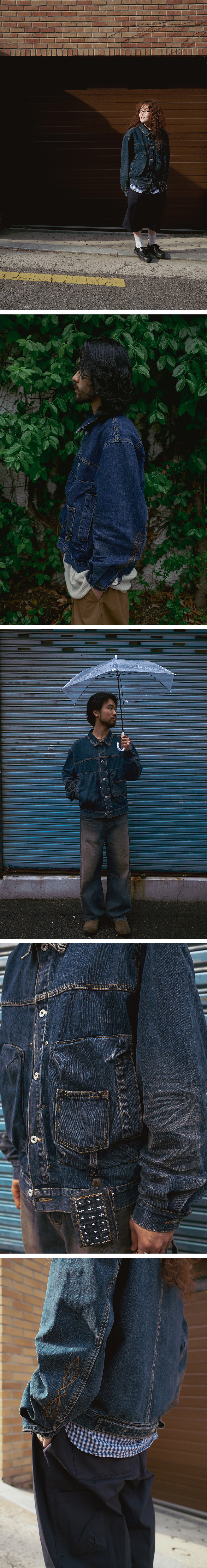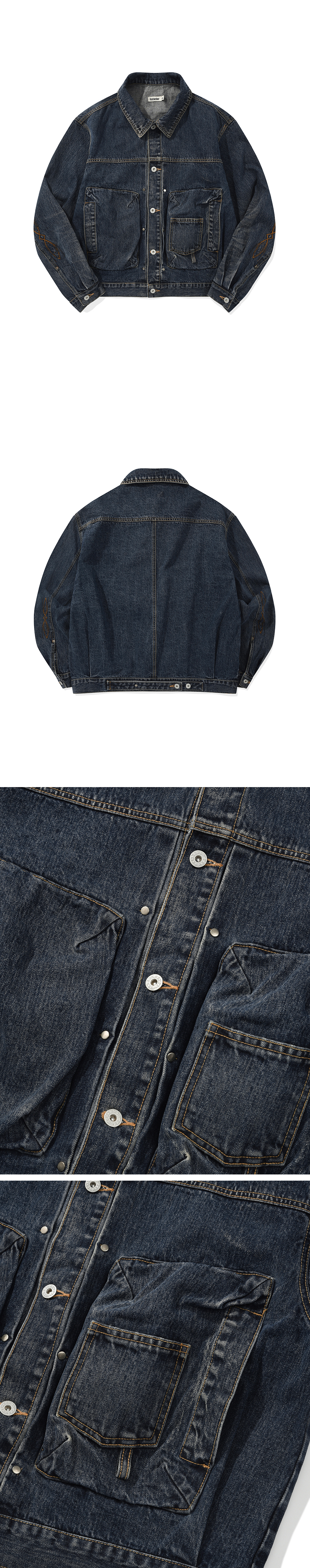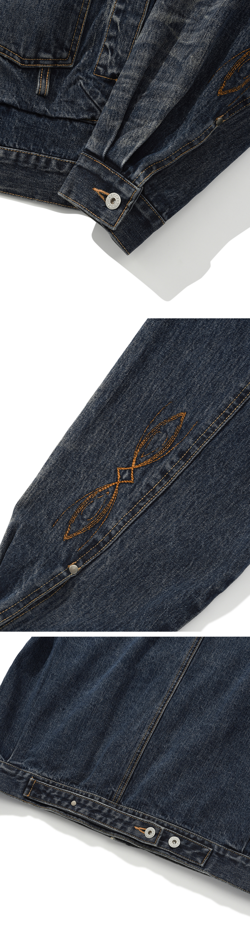 Product Info. - 13.5oz 탄탄한 두께감과 겉면 러프한 슬라브 텍스처의 고품질 데님 원단 - 여유 있는 실루엣의 빈티지 트러커 자켓 - 오랜 시간이 흐른 빈티지 제품의 페이딩감을 구현한 염/탈색 및 복합 워싱 가공 - 입체적인 실루엣의 전면 포켓 구조 - 전면 코인 포켓 디테일, 키 링 루프 디테일 - 허리 사이즈 조절 가능한 후면 어드저스터 디테일 - 양 팔꿈치 부 웨스턴 무드의 스티치 자수 포인트