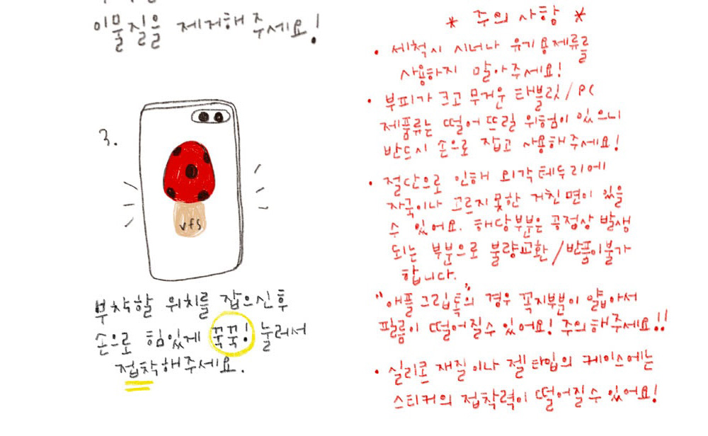 *"애플 폰 그립"의 경우 꼭지부분이 얇아서 필름이 떨어질 수 있습니 주의바랍니다.*실리콘 재질이나 젤 타입의 케이스는 스티커의 접착력이 떨어질 수 있습니다.
