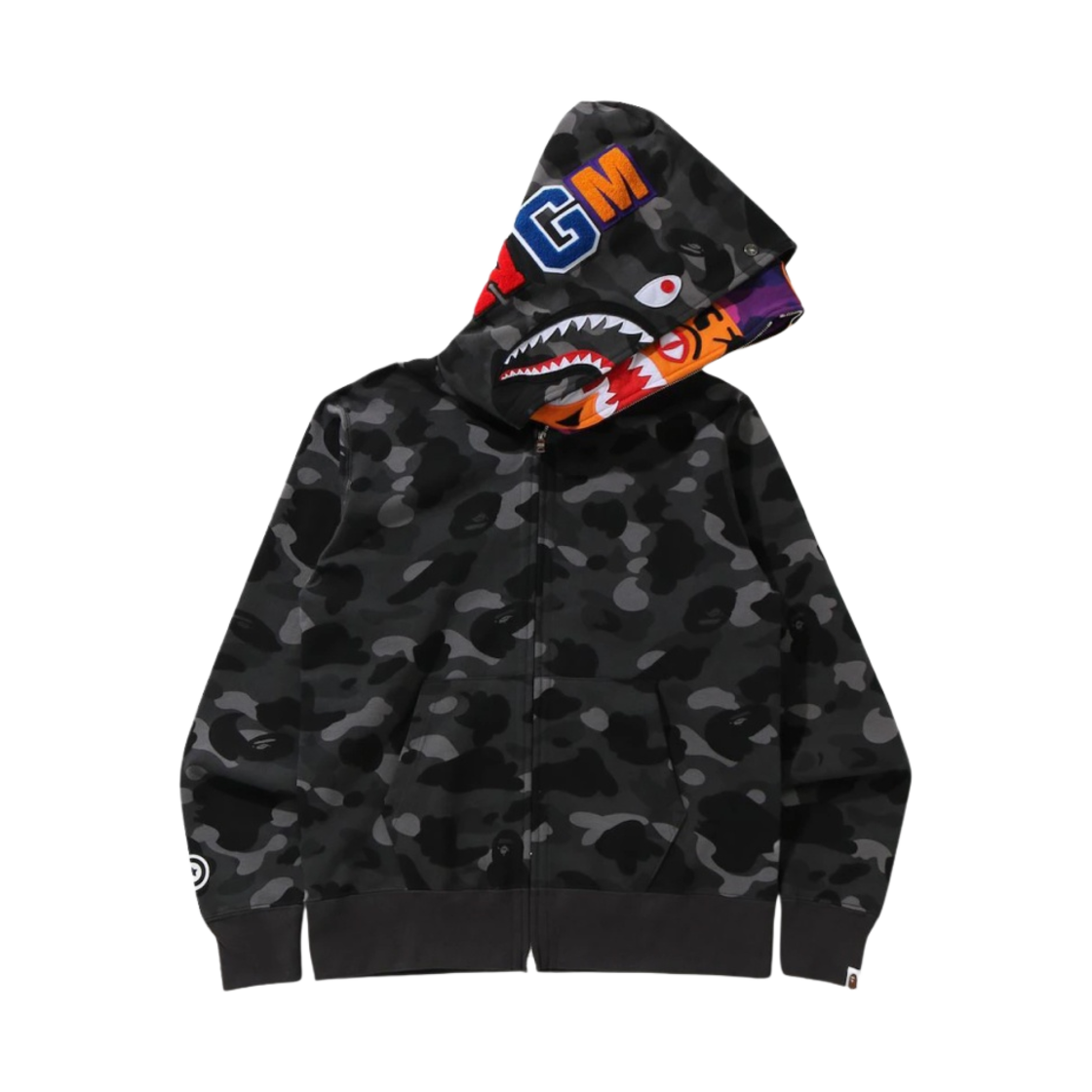 베이프 컬러 카모 타이거 샤크 와이드 풀 집 후드 블랙