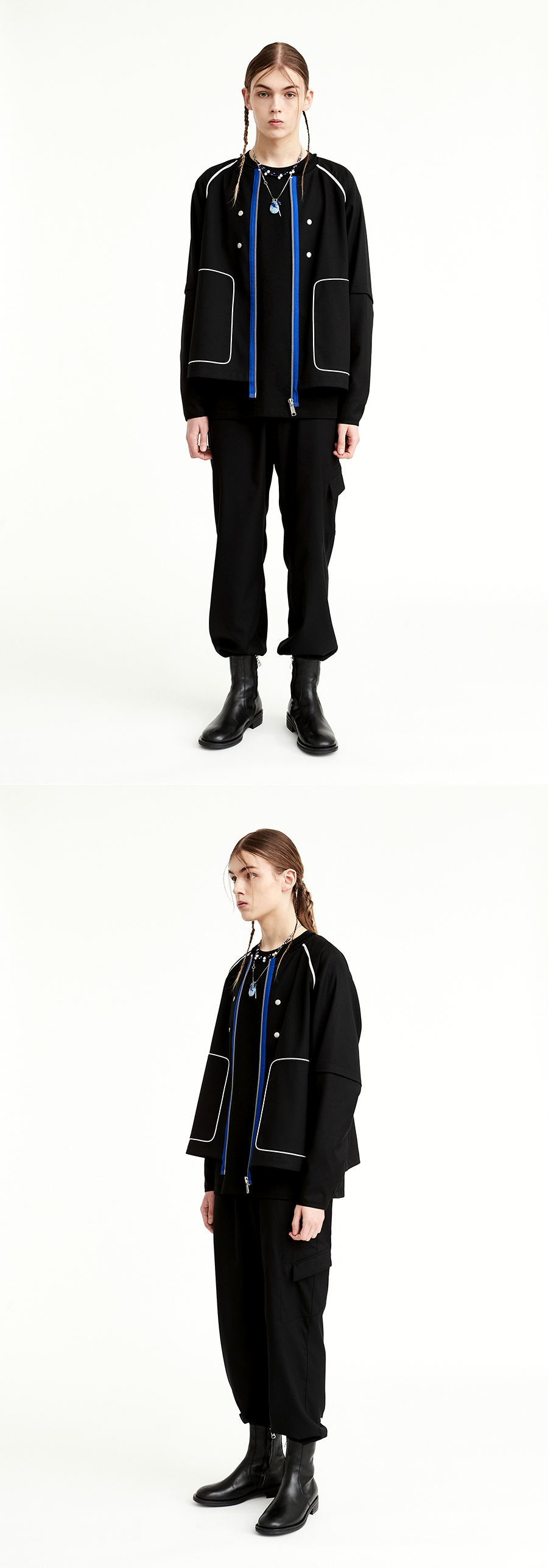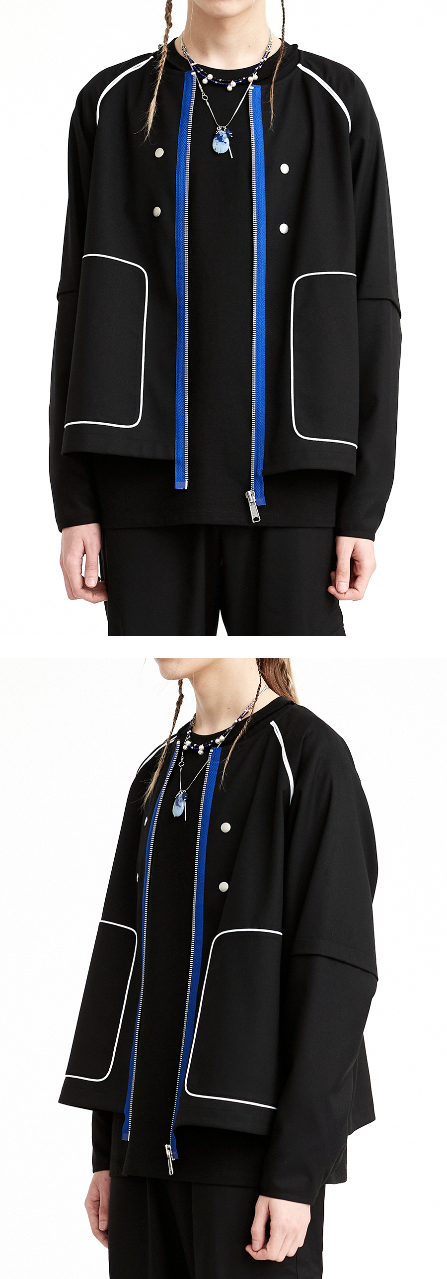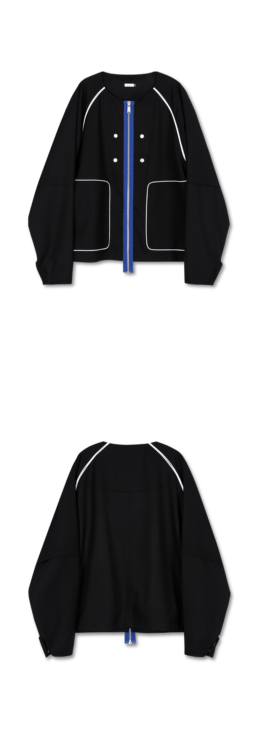 Material : Outshell : 65% Polyester 30% Rayon 5% Span Lining : 100% Polyester Colour : Matt black - 320g/sqm soft span twill fabric - Raglan sleeve jacket - Non-collar detail - Piping detail - YKK社 15mm Button snap ( sleeve-end ) - YKK社 8mm Metal zipper ( Cobalt blue color tape ) - 부드러운 터치감의 폴리 레이온 혼방 소재 - 내부 패치 포켓 - 배색 컬러의 지퍼가 포인트인 논카라 레글런 자켓