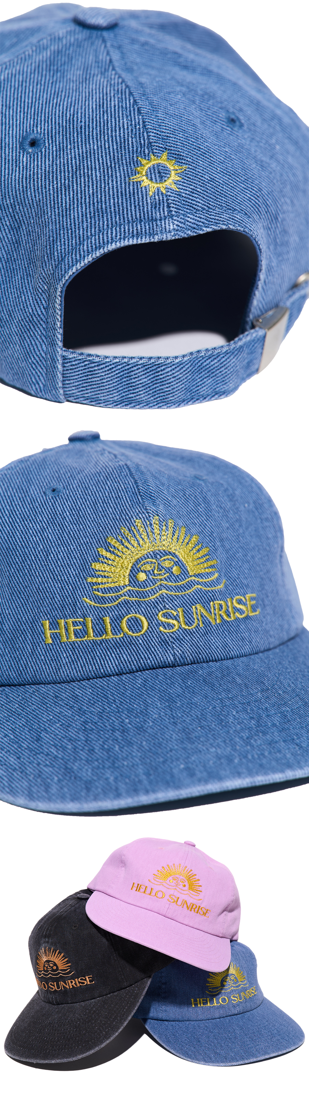 헬로 선라이즈 오리지널 로고 그래픽이 자수 처리 된 6패널 캡입니다. - 워싱 가공으로 빈티지한 무드 - 뒤판 Hello Sunrise 심볼 자수 처리 *모자의 챙을 개인적인 취향에 따라 원하시는 각도로 구부려 착용하시길 권장 드립니다. *모자의 챙이 워싱과정으로 살짝 삐뚤어져보이는 현상은 제품의 불량이 아니므로 반품사유가 되지 않습니다.