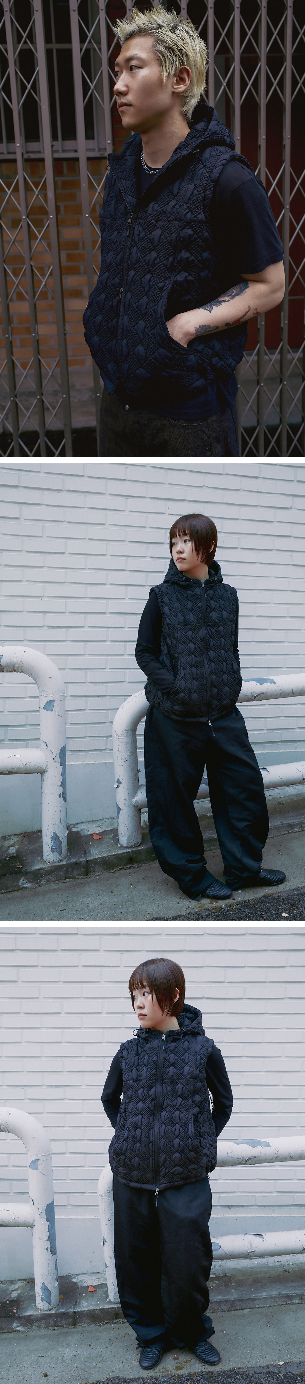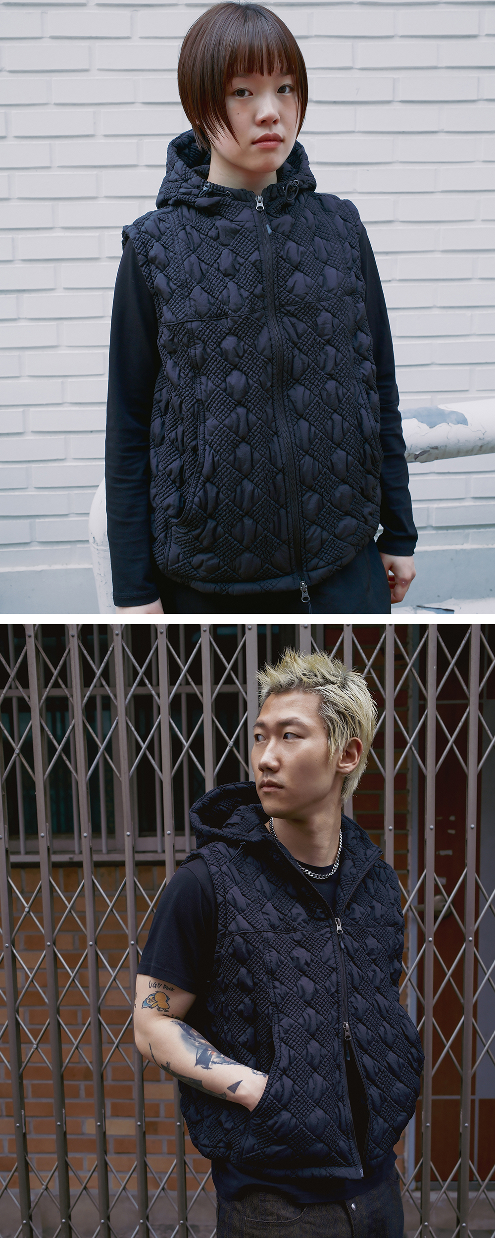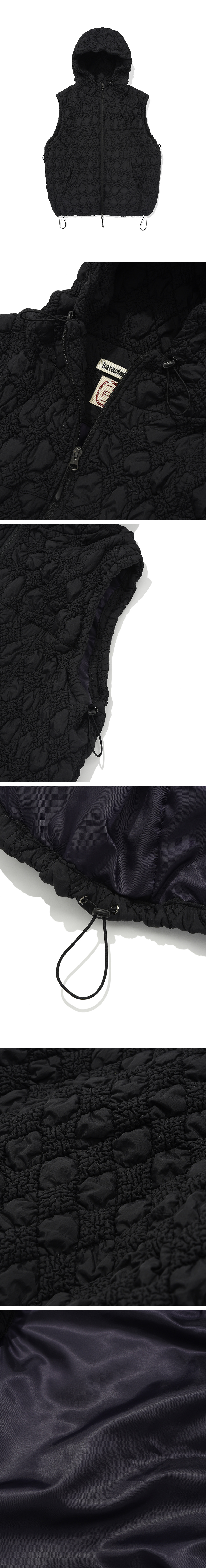 Product Info. - 얇은 두께감의 1oz 충전재를 유니크한 체크 형태로 퀼팅한 원단 - 적당한 피팅감으로 편안하게 착용 가능한 간절기용 후드 베스트 집업 - 절개 패턴 변형 구조의 전면 포켓 - 전면 YKK 2-way 지퍼로 다양한 연출 가능 - 후드와 밑단 스트링 어드저스터 - 암홀 어드저스터 - 짙은 퍼플 컬러 안감 배색 사용