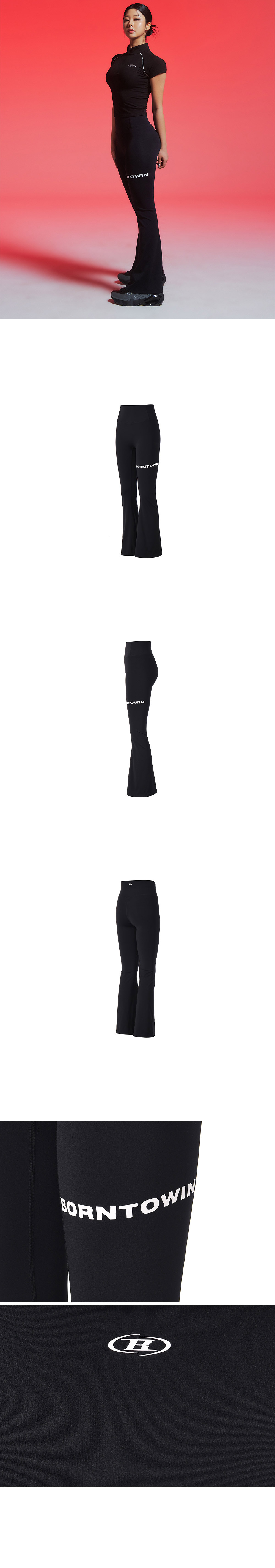 [DETAILS] * 본투윈 라인 부츠컷 레깅스 - 고신축 나일론 하이게이지 원단 - 체형을 보정하는 하트 힙라인 - 전면 레터링 프린팅 - 뒷중심 B 로고 프린팅 - 실루엣 좋은 부츠컷 핏 Material : Nylon 80% Polyurethane 20% Fitting : 1 Size, 165cm, 53kg