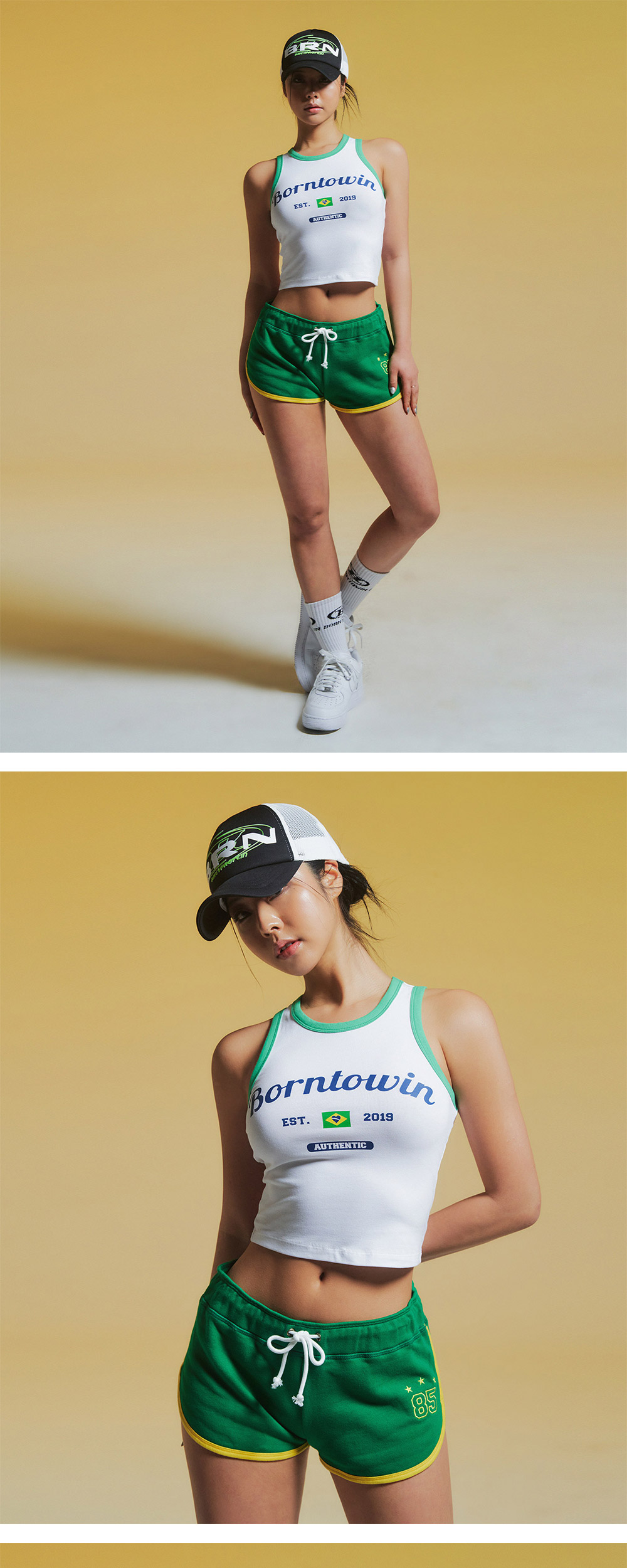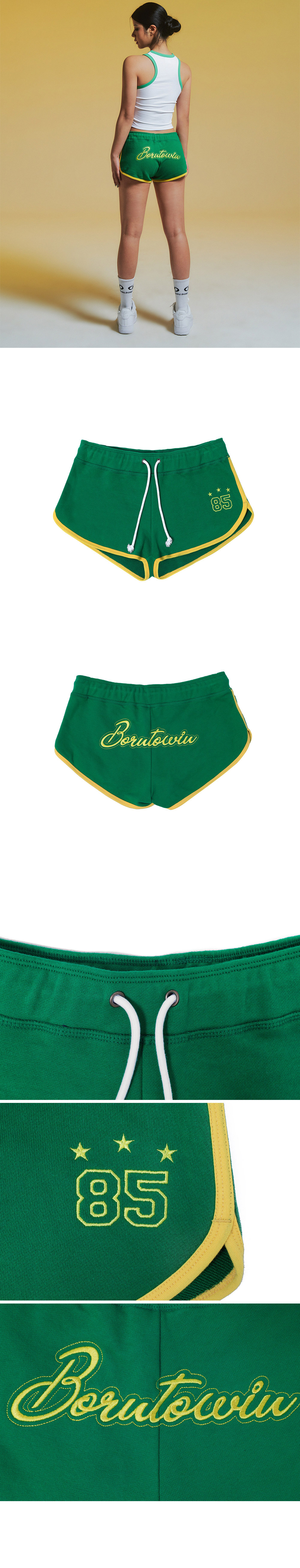 [DETAILS] * 85 테리 돌핀 팬츠 - 부드러운 테리 원단 - 컬러 배색 랍바 디테일 - 전면/후면 시그니처 자수 포인트 - 엔틱 아일렛 스트링 끈 Material : Cotton 100% Fitting : 1 Size, 165cm, 53kg