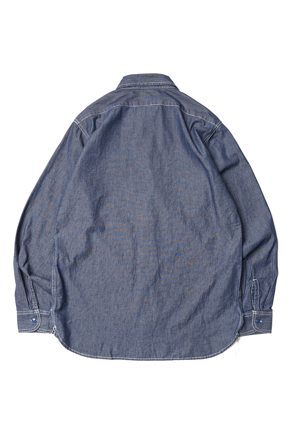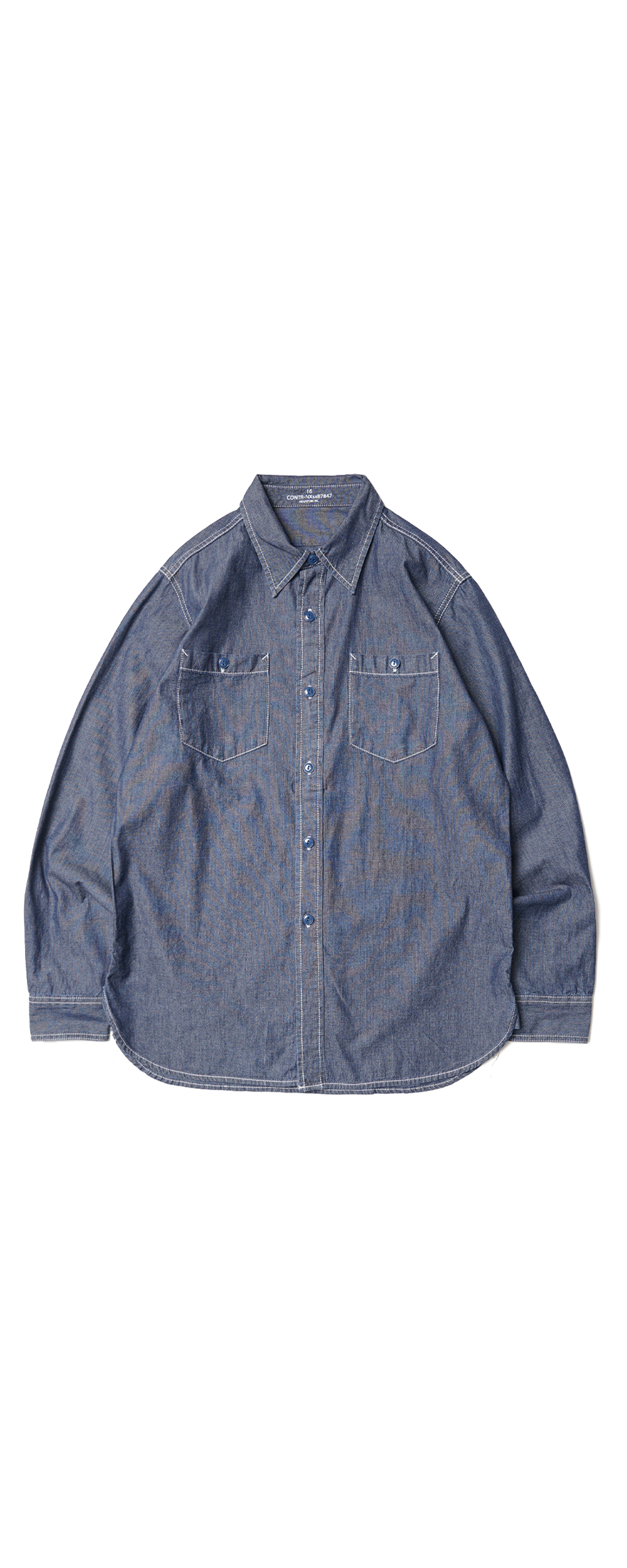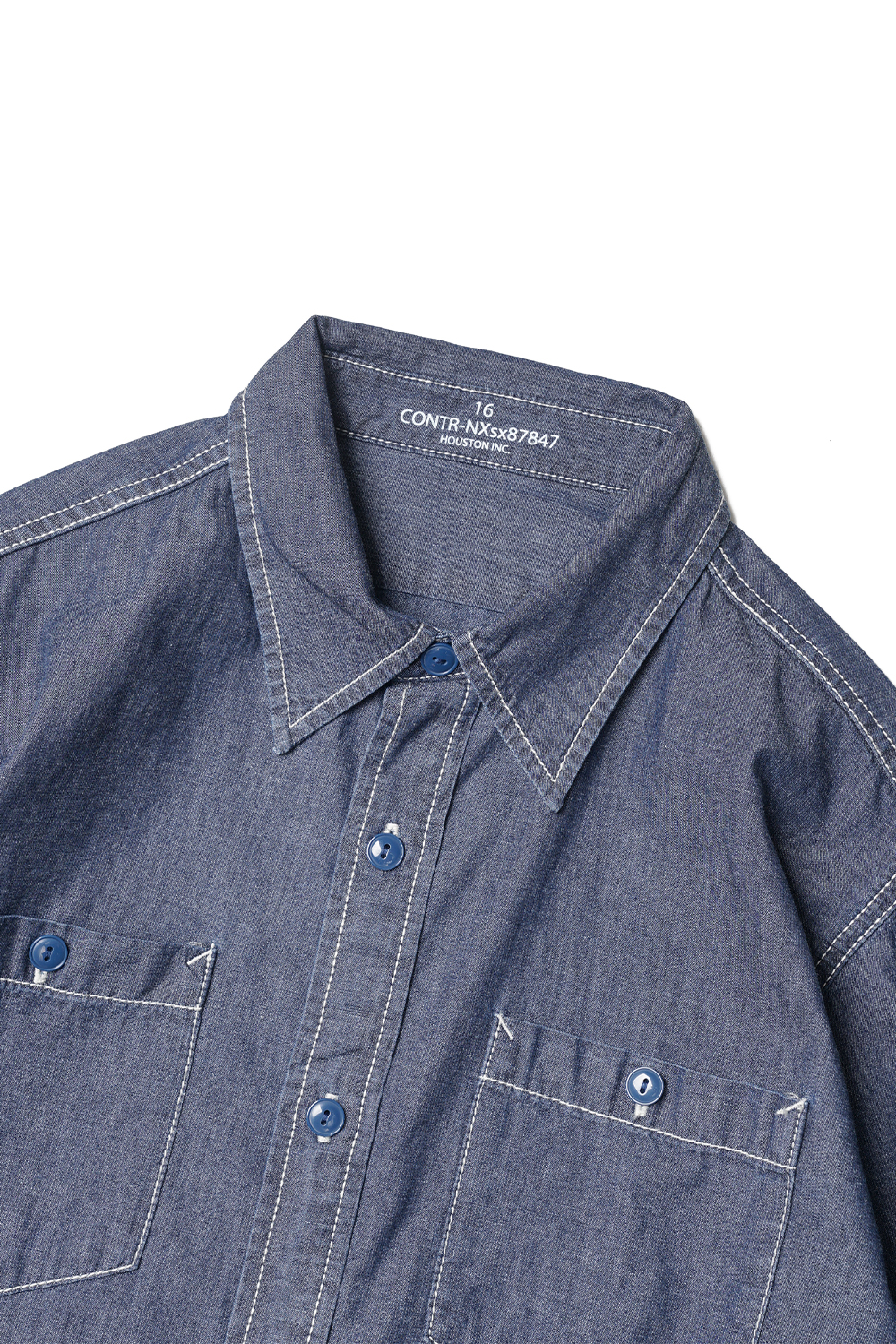 Houston Japan 41092 USA Cotton Chambray Shirt (USN) - Indigo Vintage Wash 50년대경의 미해군의의 샴브레이 셔츠를, US 코튼 샴브레이 원단으로 재현하였습니다. 프론트의 홈베이스 형태의 포켓이 특징인 아이템입니다. 착용시 표기 사이즈 '17'이 일반적인 '103'이며, '18'이 '108' 사이즈 정도입니다.
