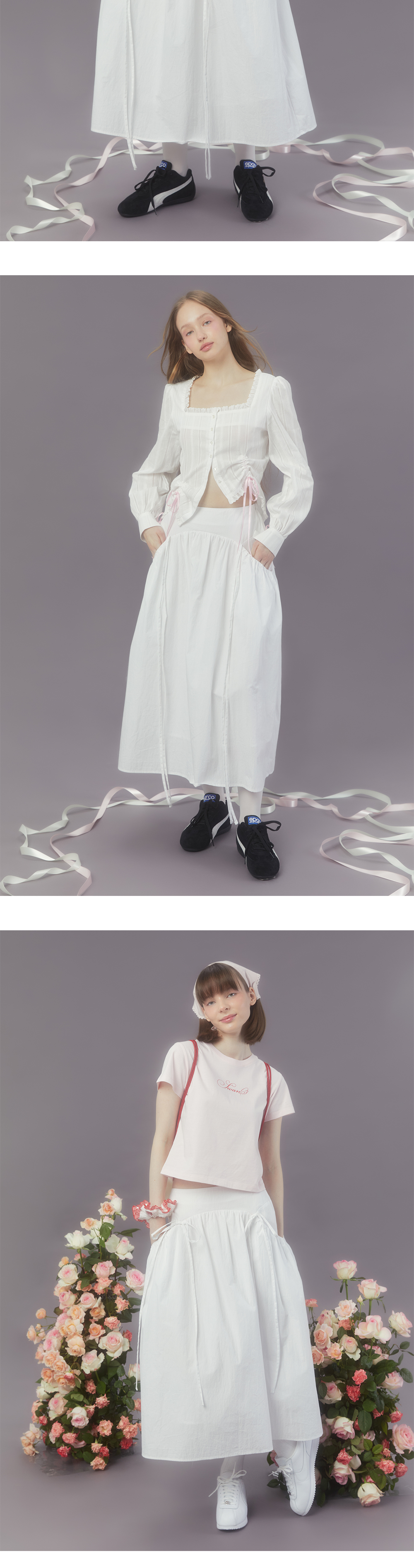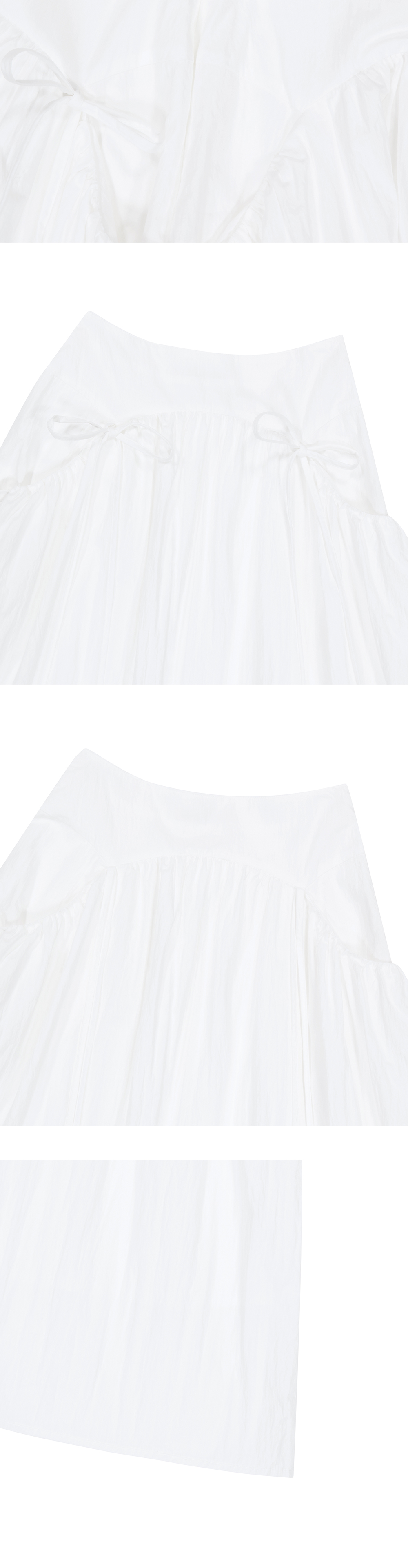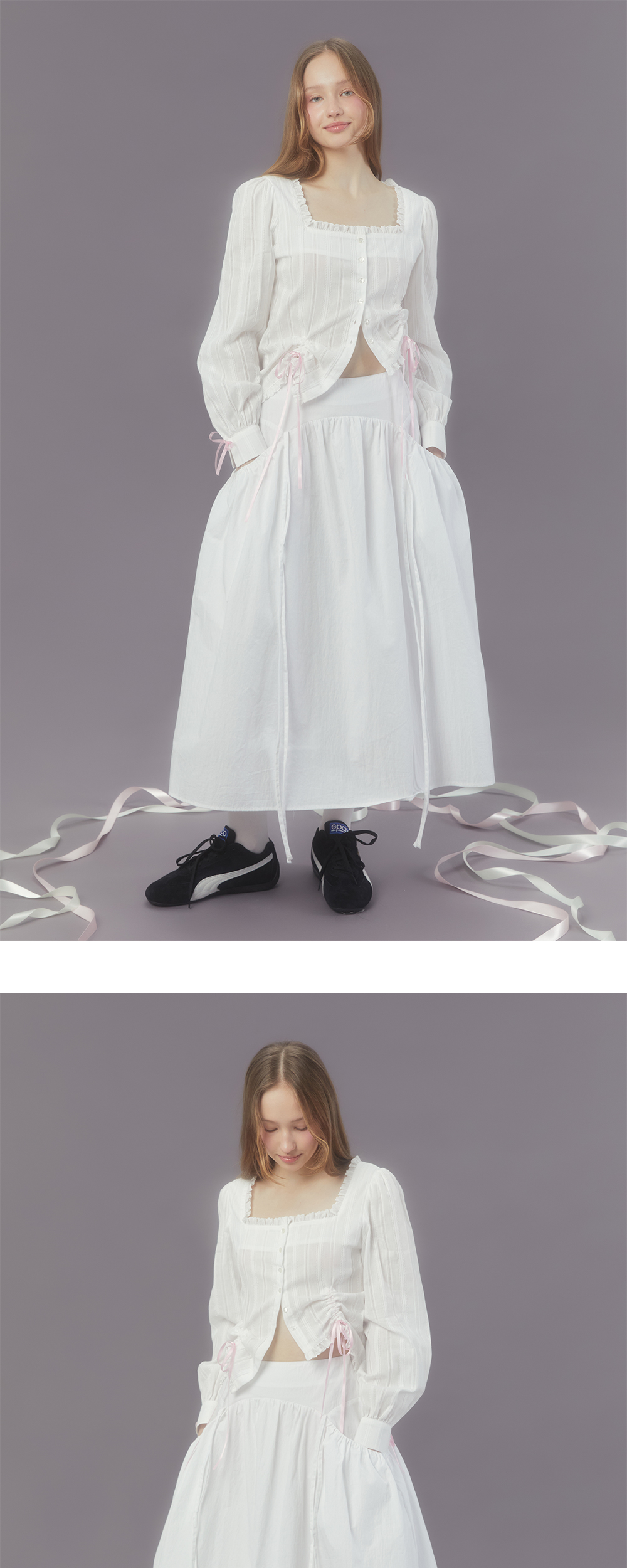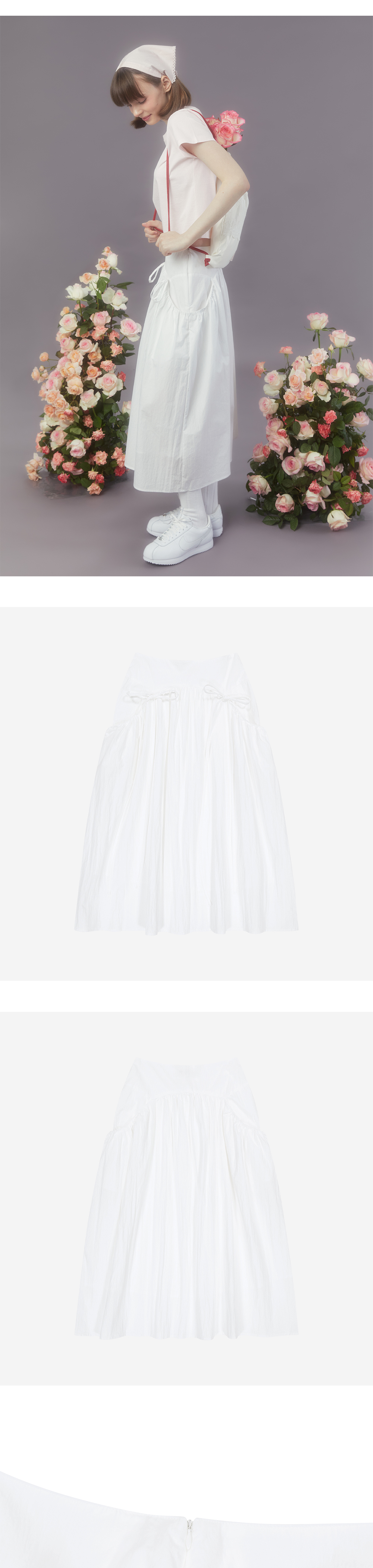 Margarin fingers 24 spring 셔링 포켓 롱스커트입니다. - 코튼 나일론 소재의 롱 스커트 - 코르셋 절개 라인 아래로 사이드 포켓과 풍성한 셔링 디테일 - 리본 포인트 - 사이드포켓 안쪽으로 콘솔 지퍼 오픈 클로징 - 비침 방지 안감 사용